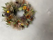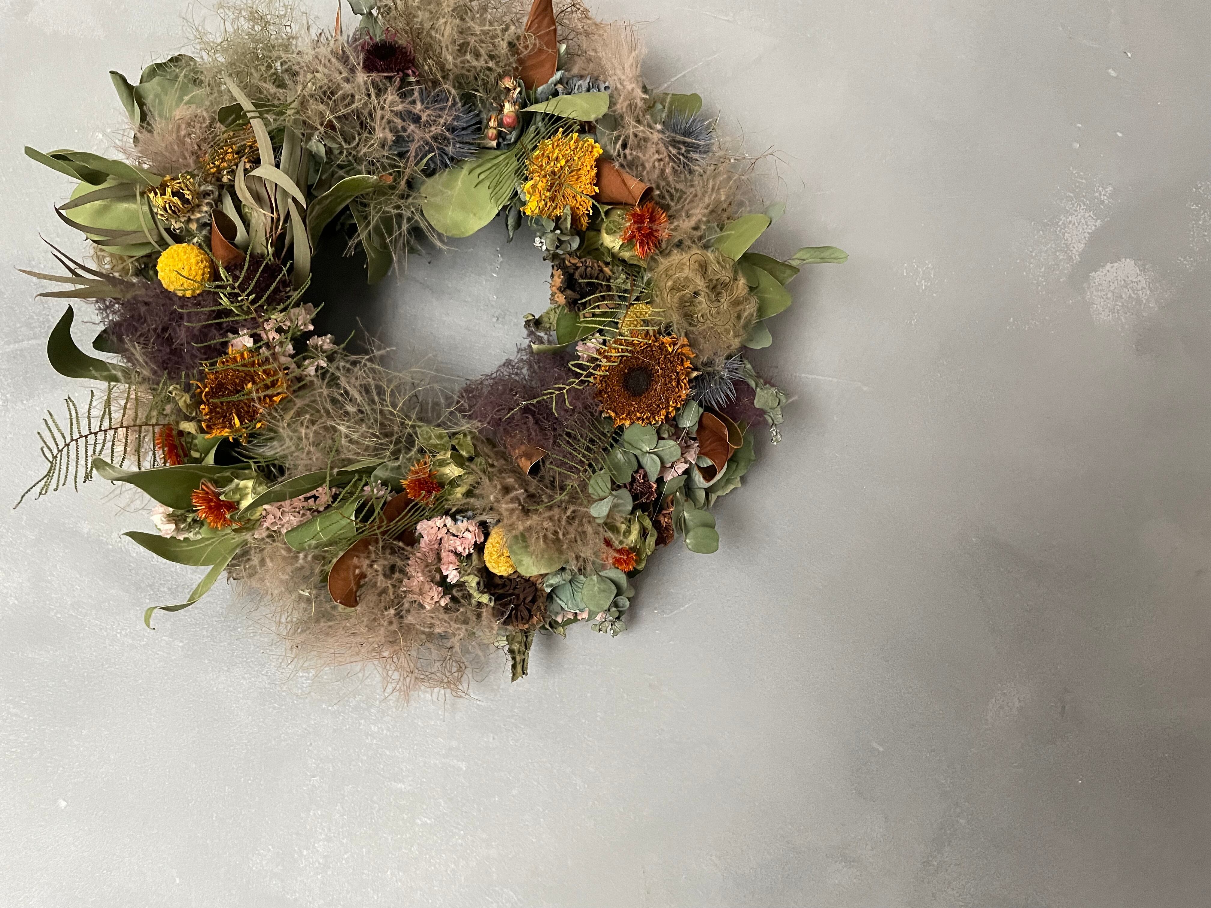 数種の向日葵にエリンジュームやスターチス、紅花などを入れてラウンドリースに仕上げました。