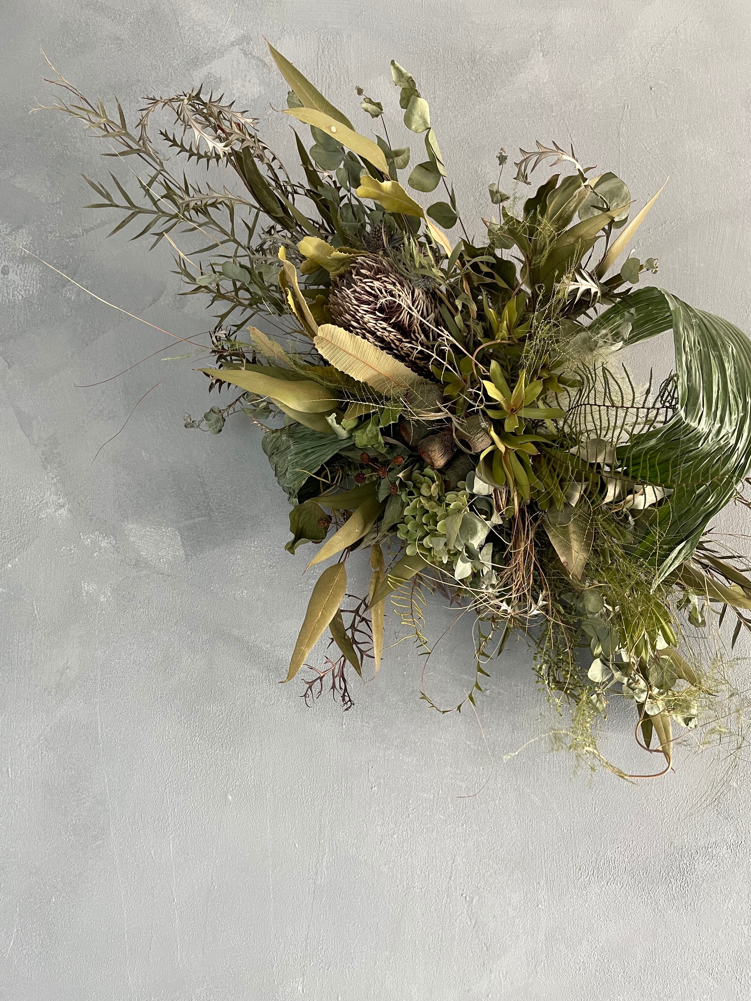 バンクシアにグレビレアやユーカリなどを合わせてインテリアにもおすすめの横長スワッグです。