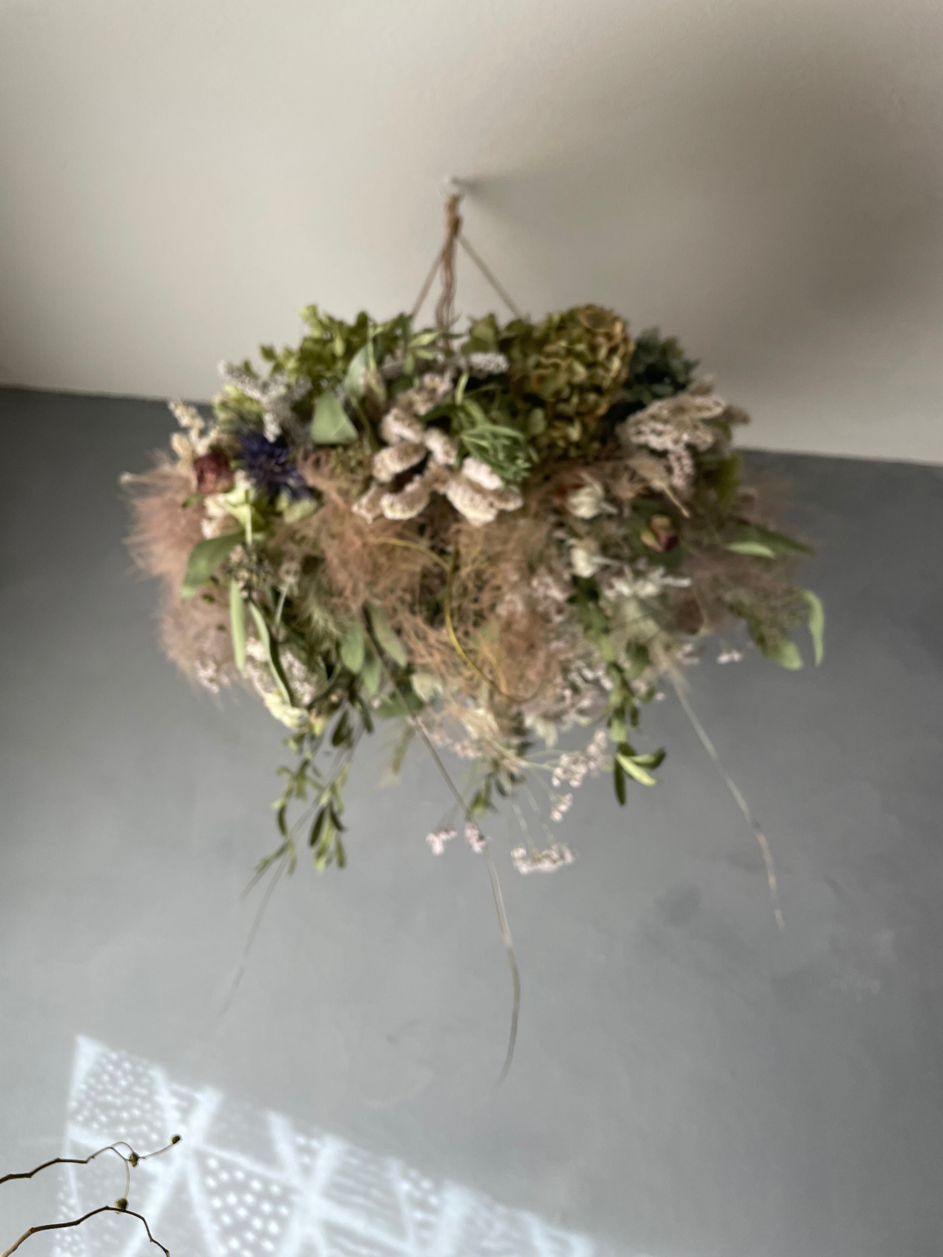 ふわふわスモークツリーに紫陽花やスターチスなどを合わせてフライングリースを作りました。