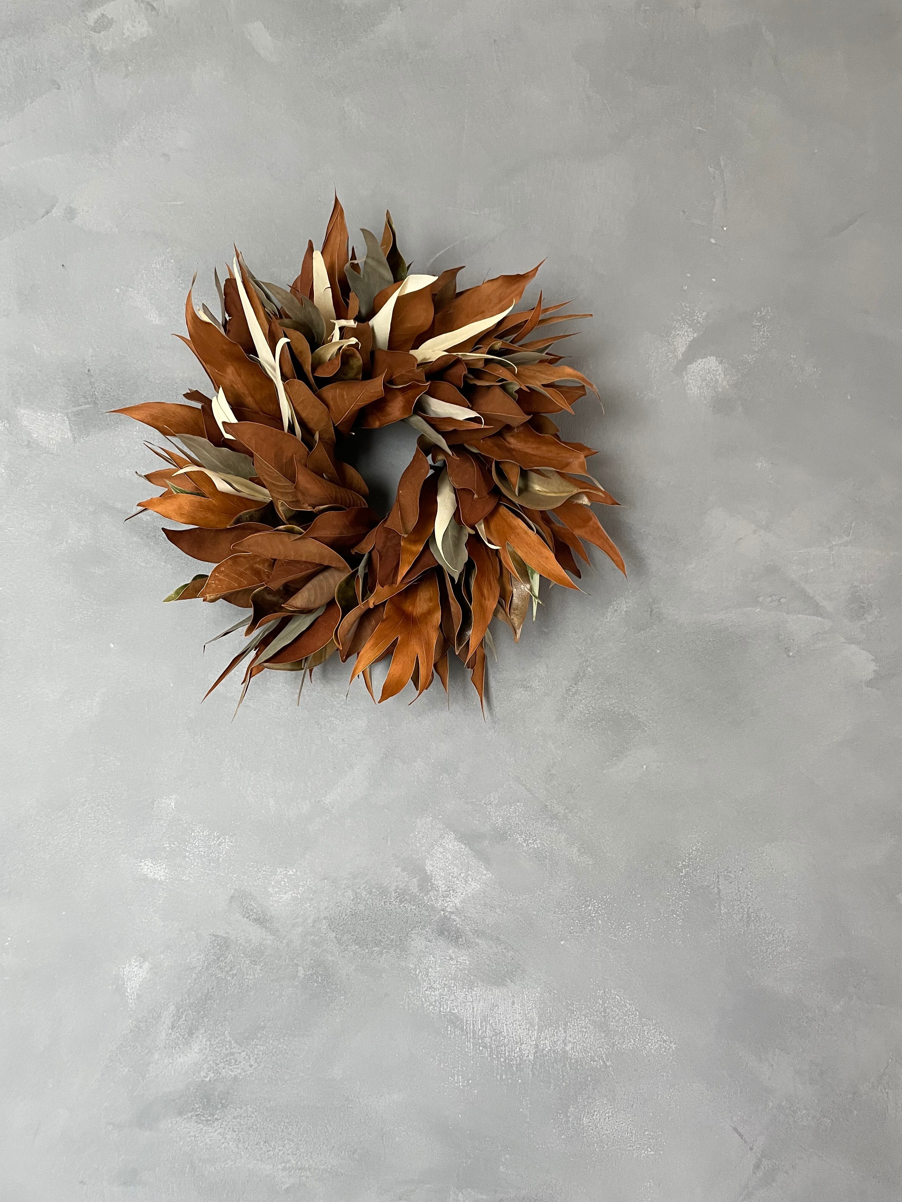 グレビレアゴールド、マグノリア、ユーカリでシンプルなリースを作りました。