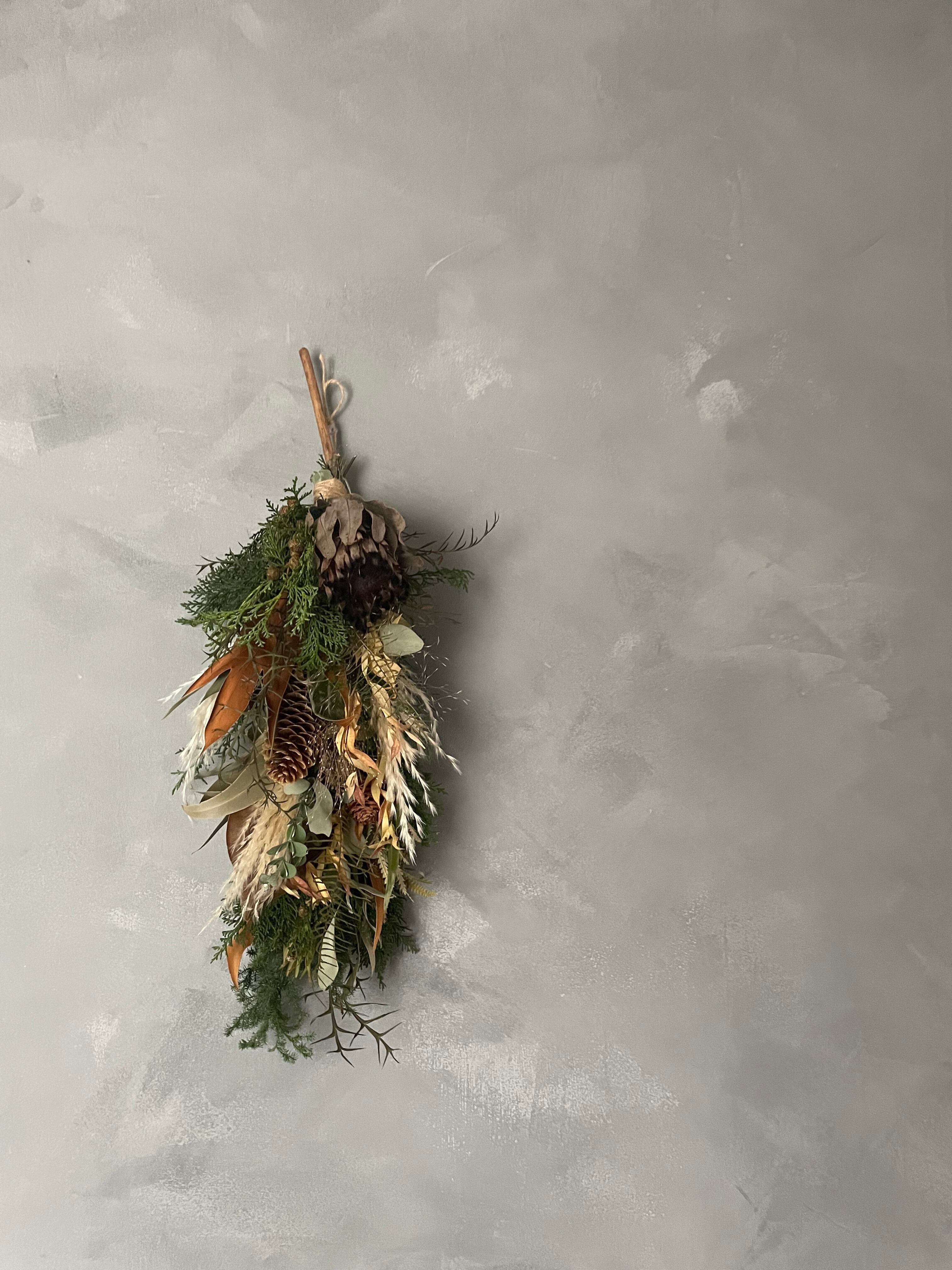 針葉樹、松笠、プロテア、パンパスなどをいれ縦長スワッグにしました。