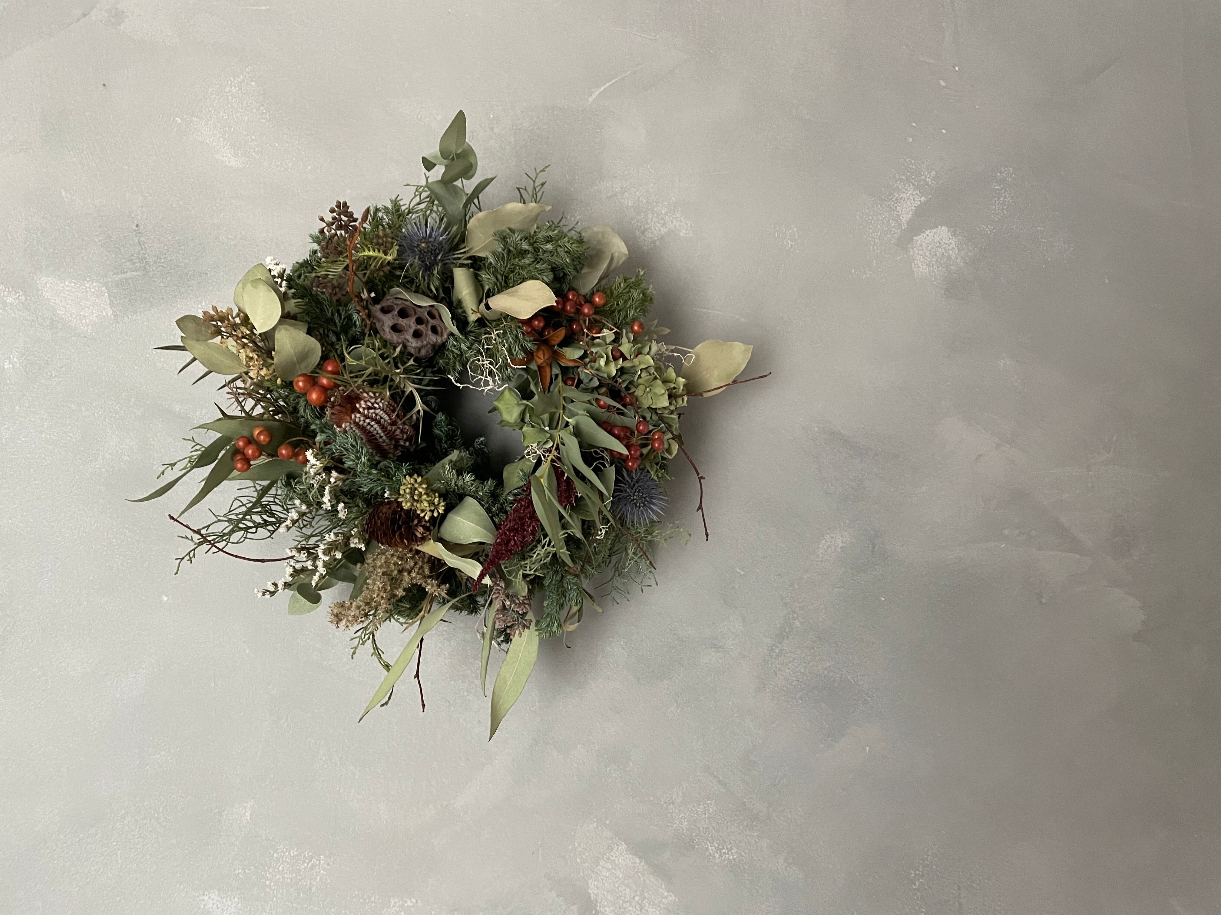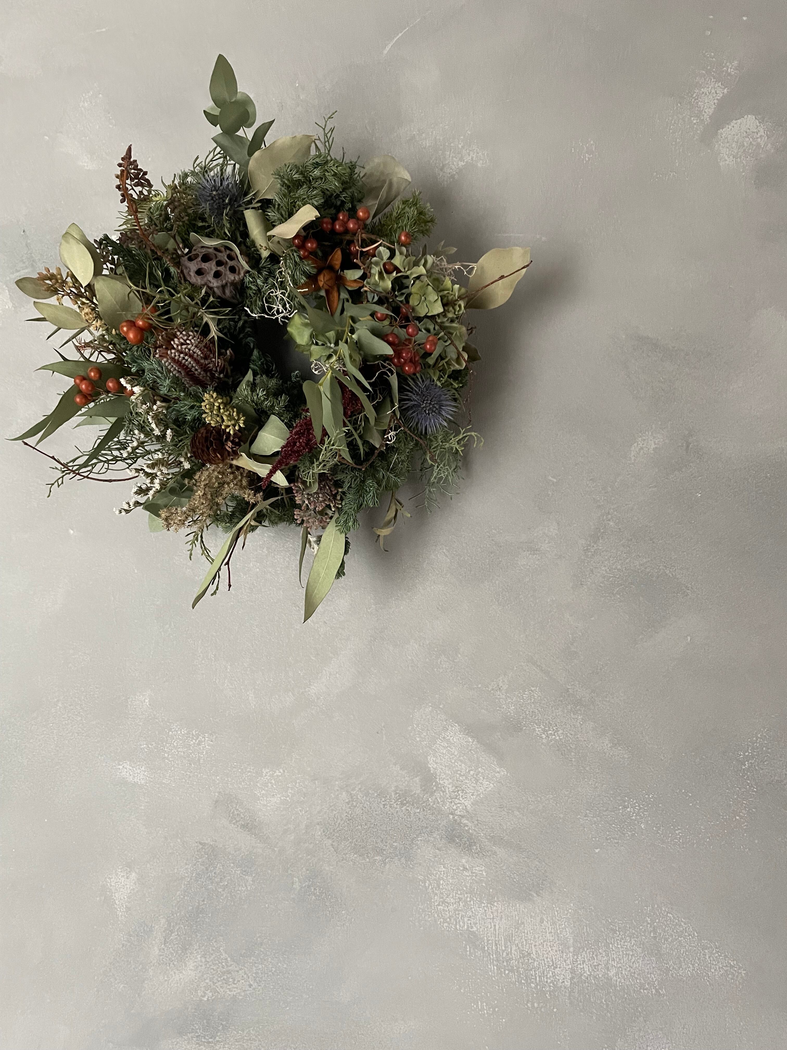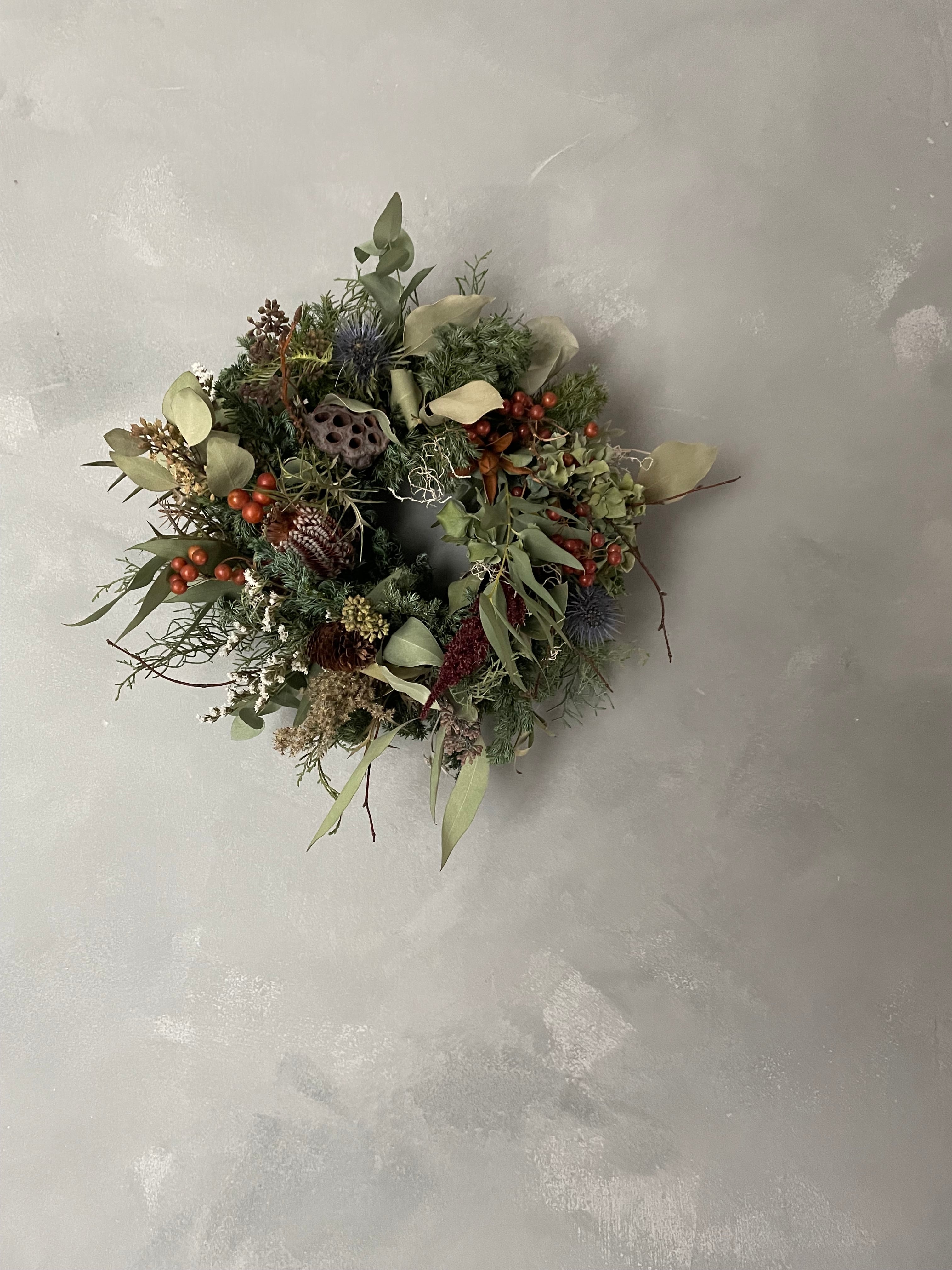 針葉樹にユーカリ、バンクシアなどを合わせてシンプルリースを作りました。