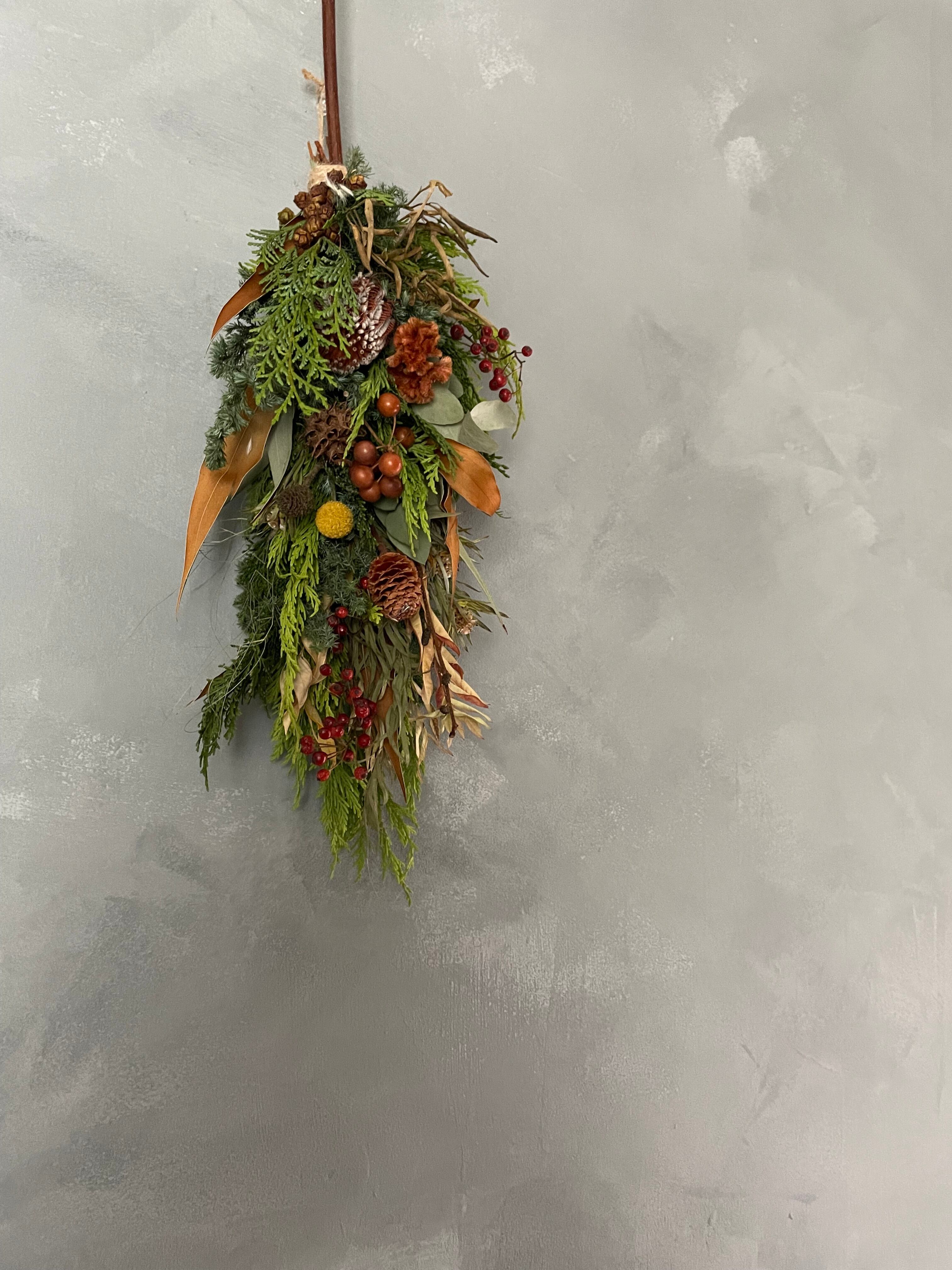 針葉樹、松笠、バンクシアなどをいれ縦長スワッグにしました。