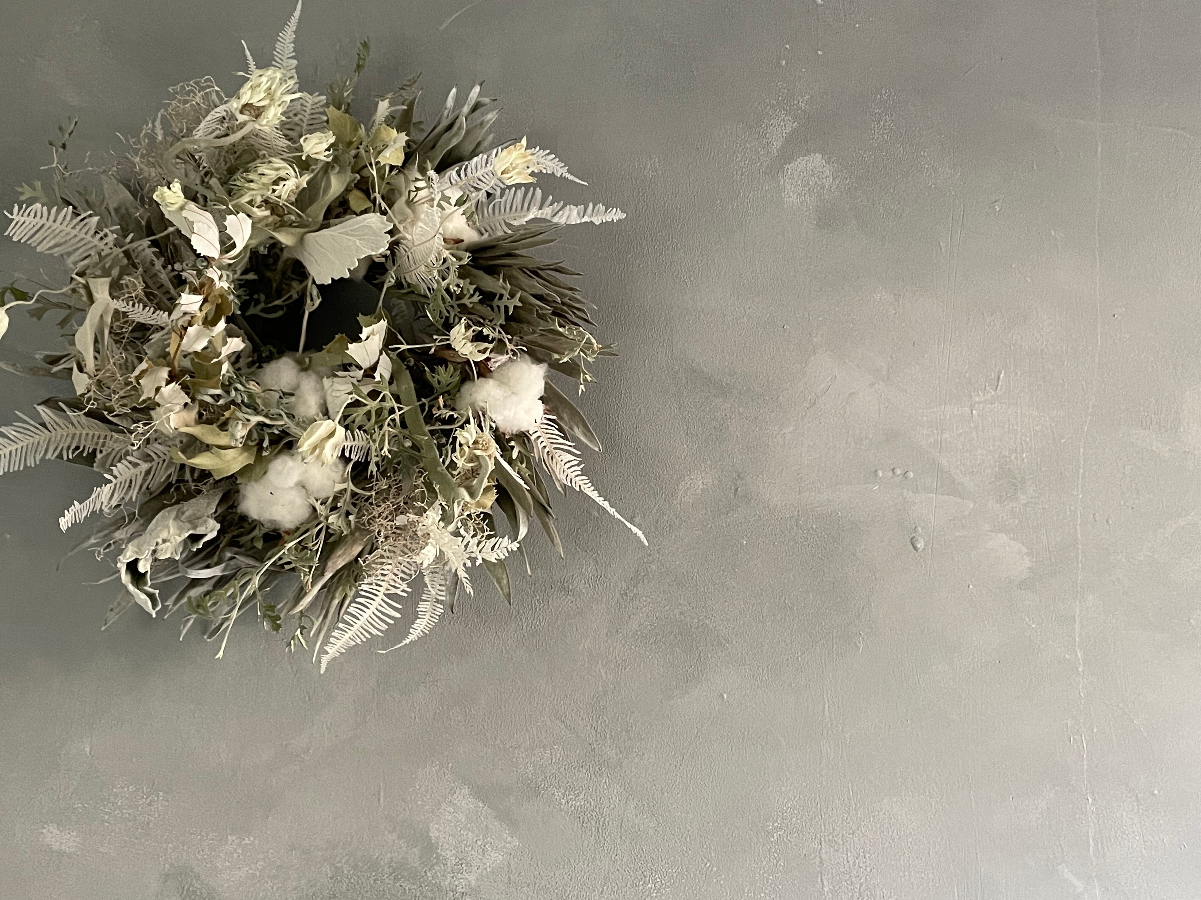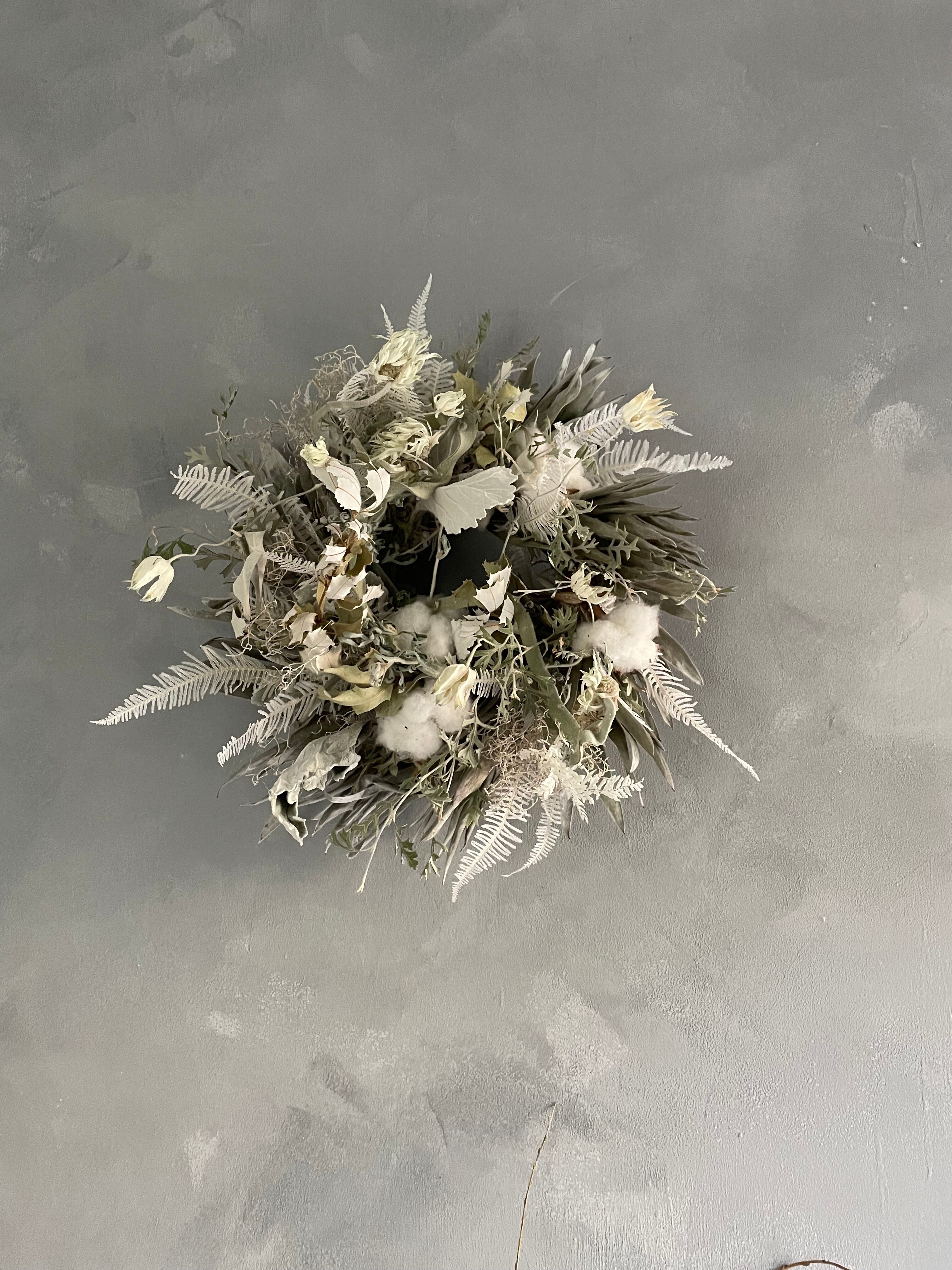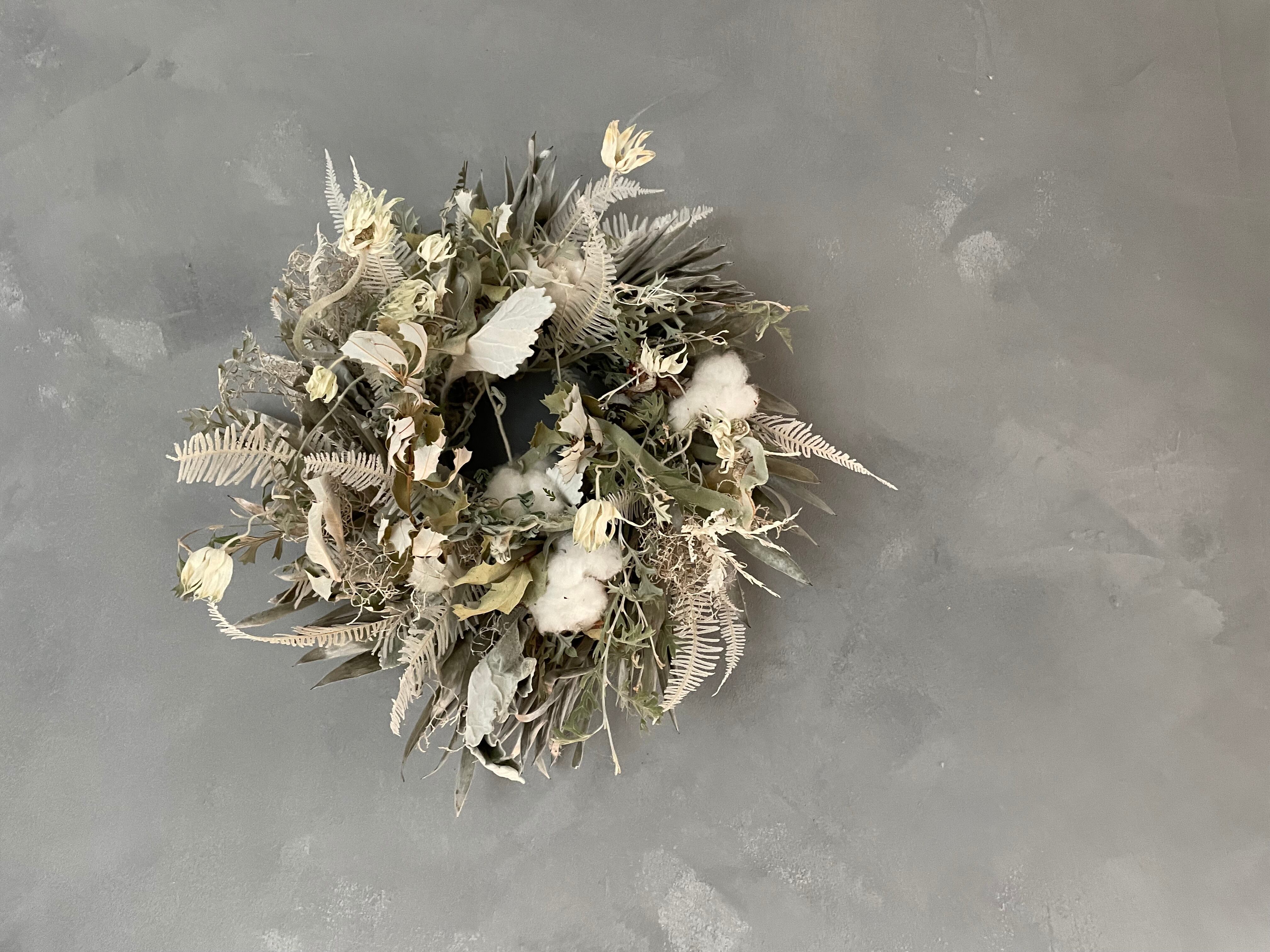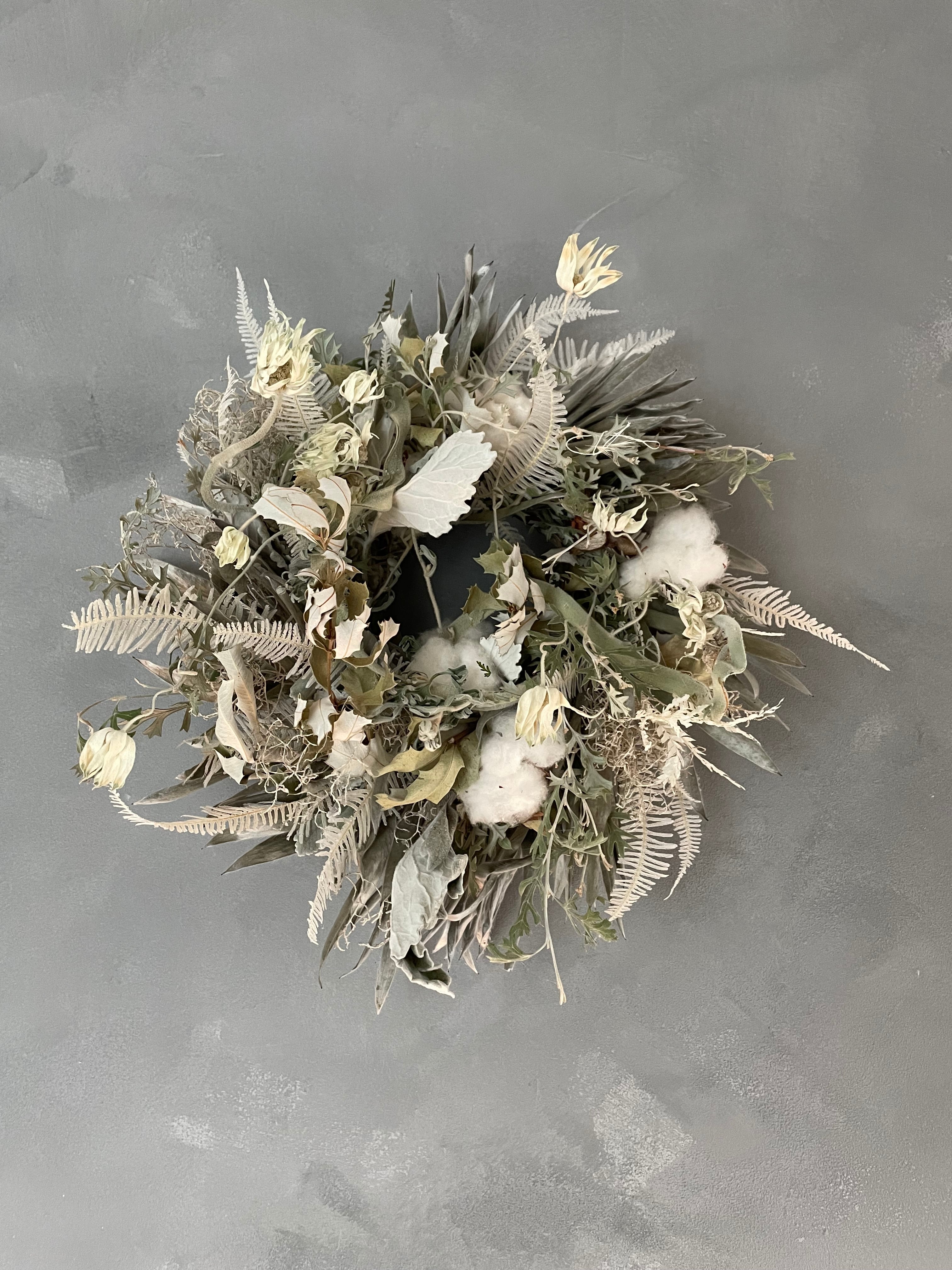 グレビレアロック、シダや石化フランネルフラワーなどを合わせてリースを作りました。