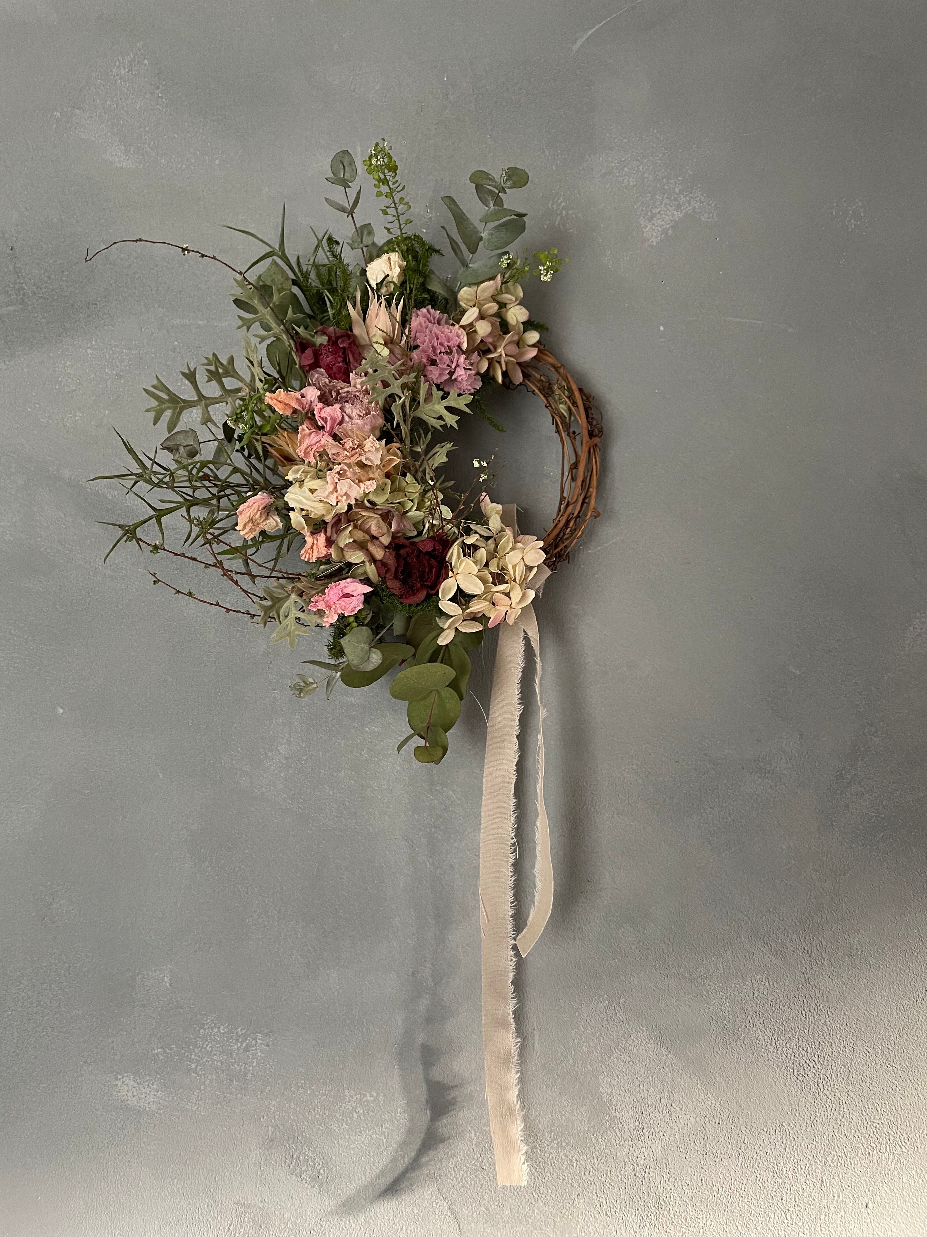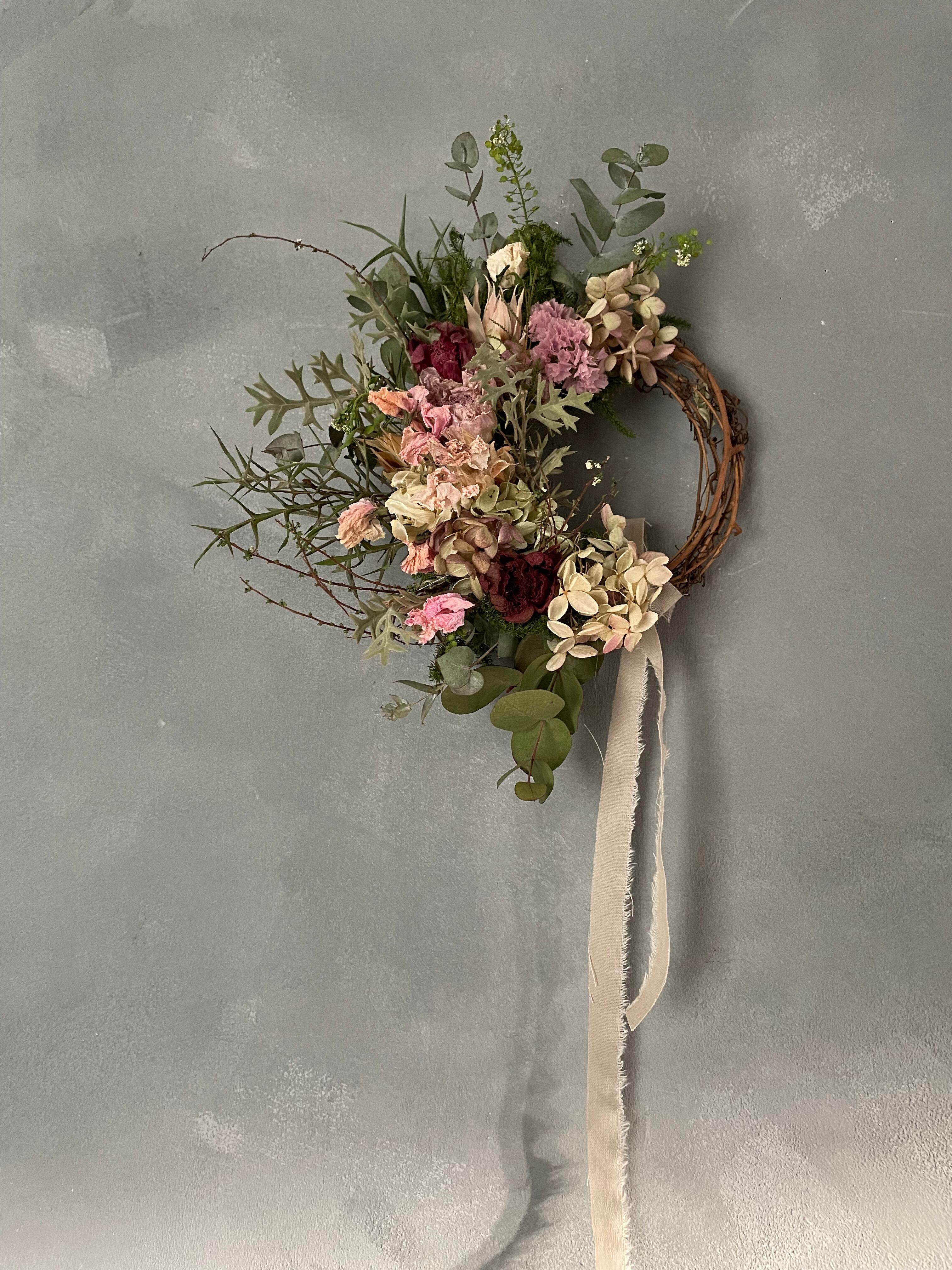 ラナンキュラスや、アネモネ、スイトピーなどを入れてハーフリースに仕上げました。