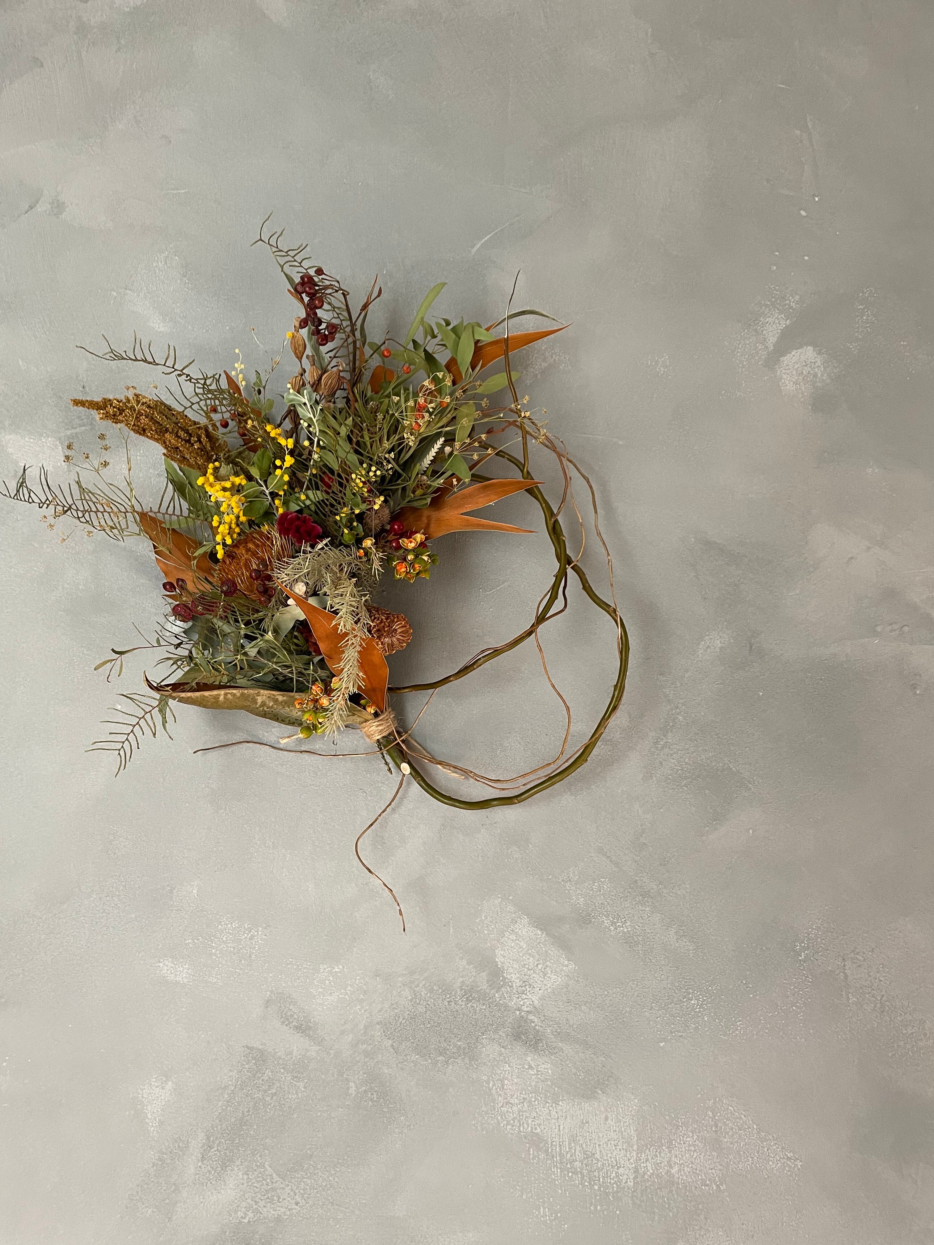 パールアカシア、バンクシア、ミモザ、グレビレアゴールドなどを合わせてリースを作りました。
