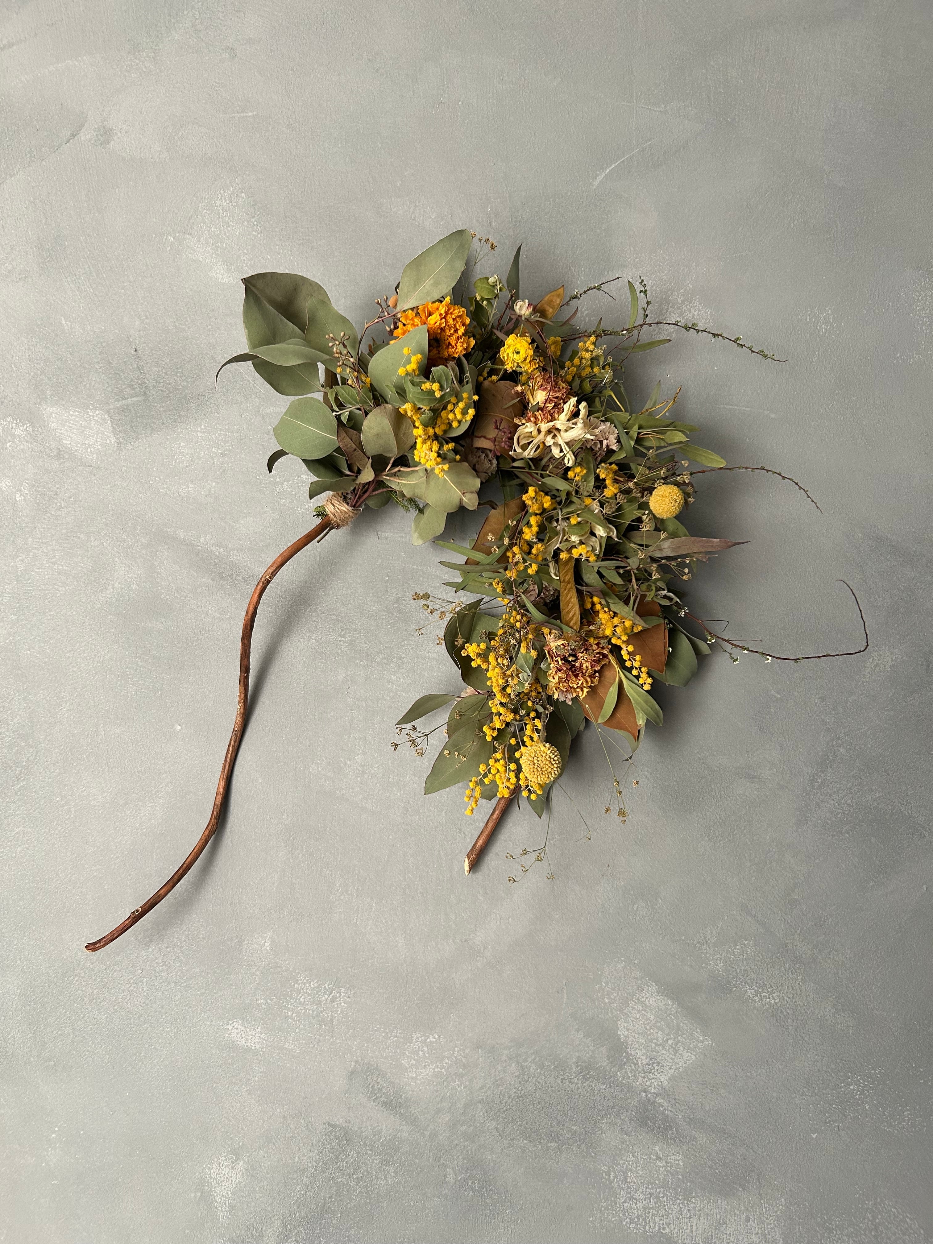 パールアカシア、バンクシア、ミモザ、グレビレアゴールドなどを合わせてリースを作りました。