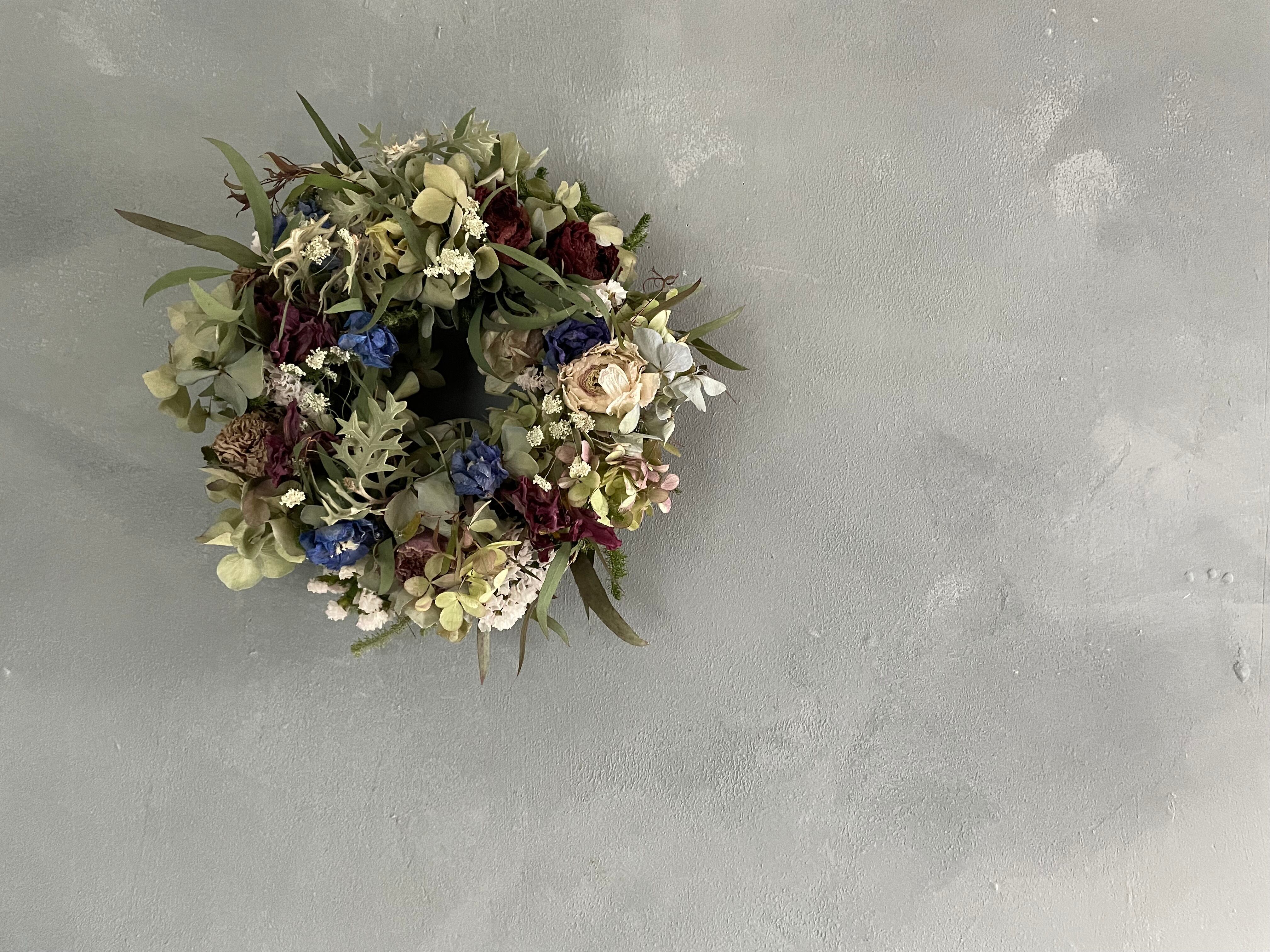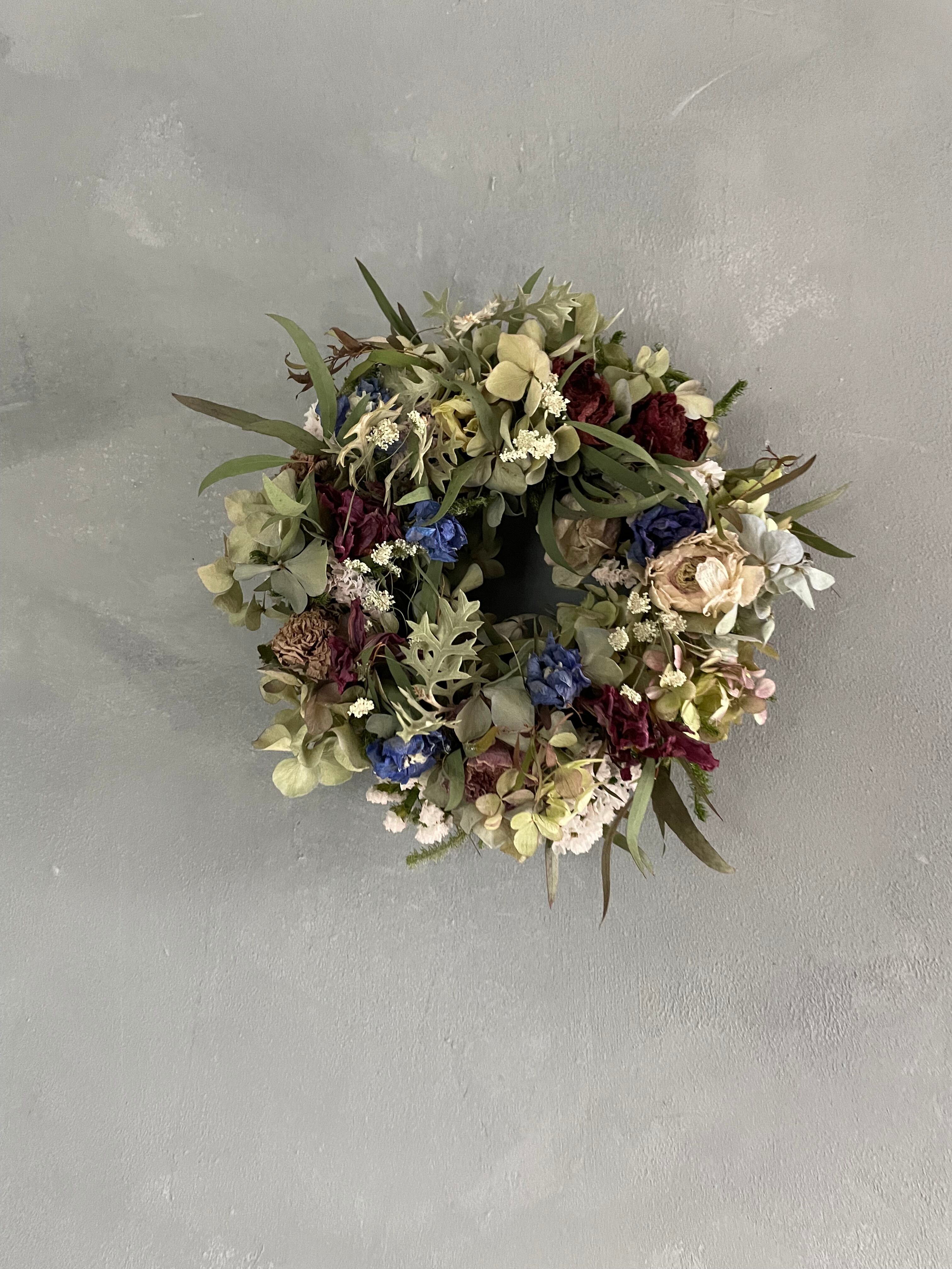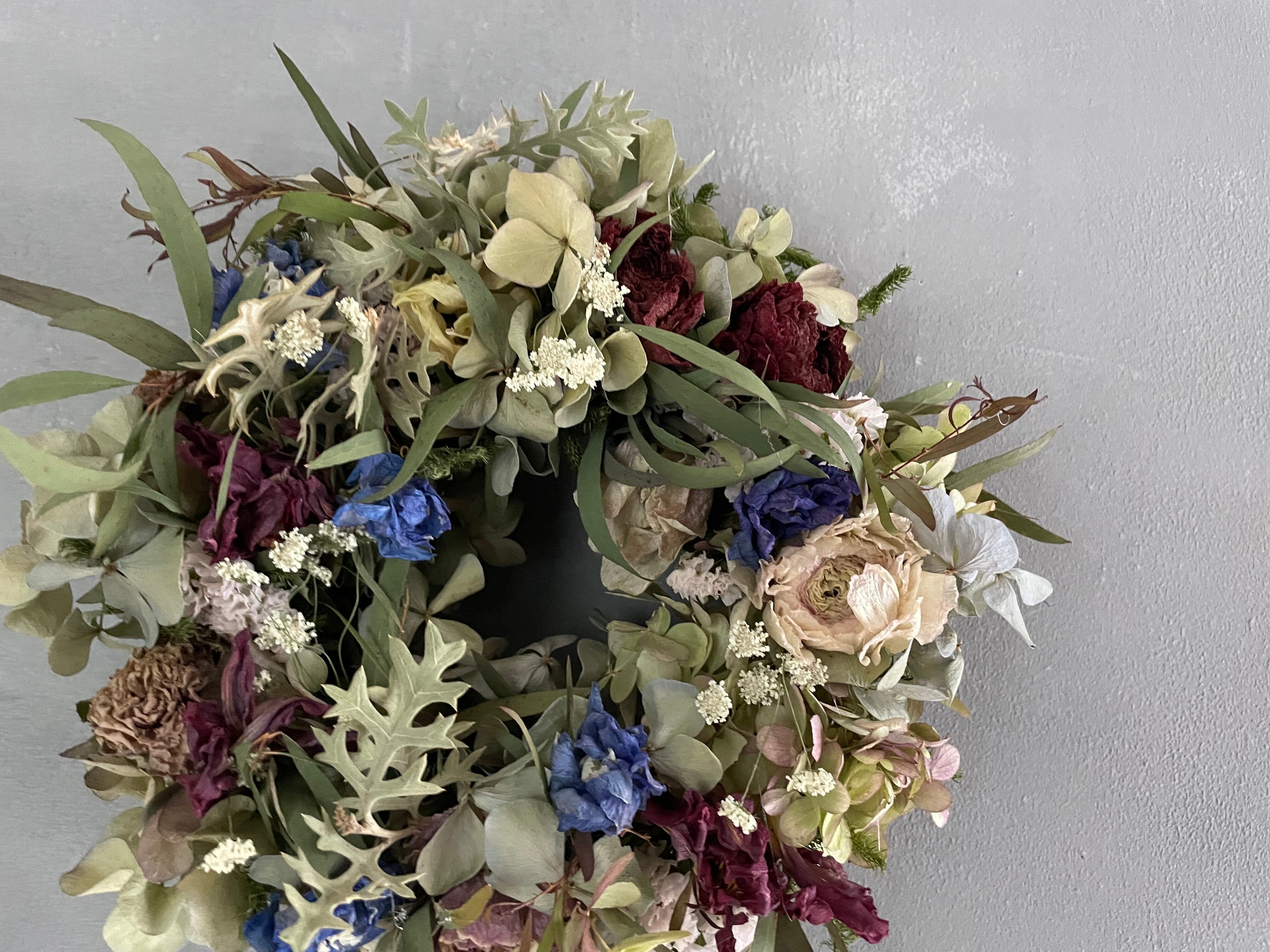 紫陽花、ラナンキュラス、チューリップなどを合わせてリースを作りました。