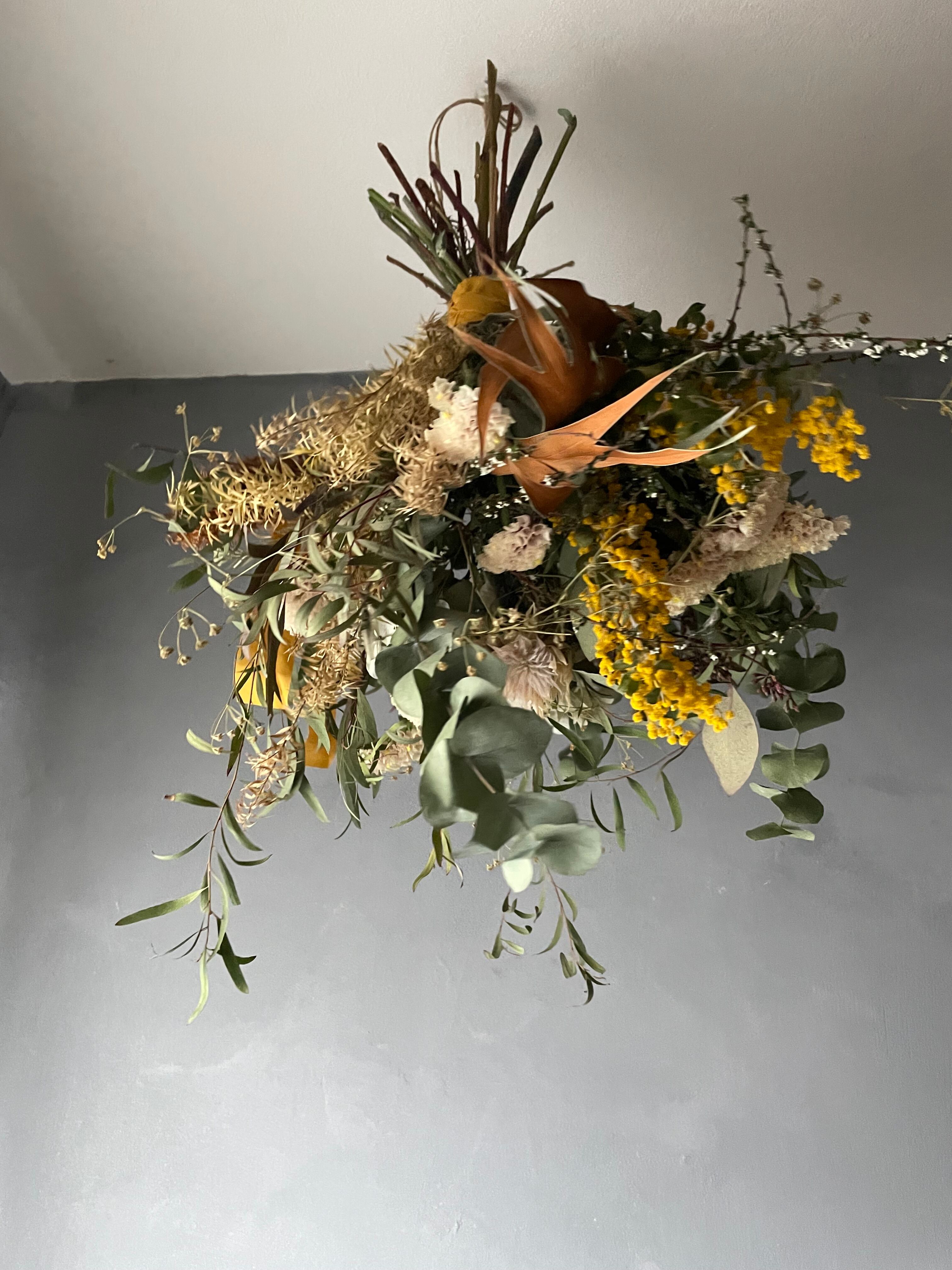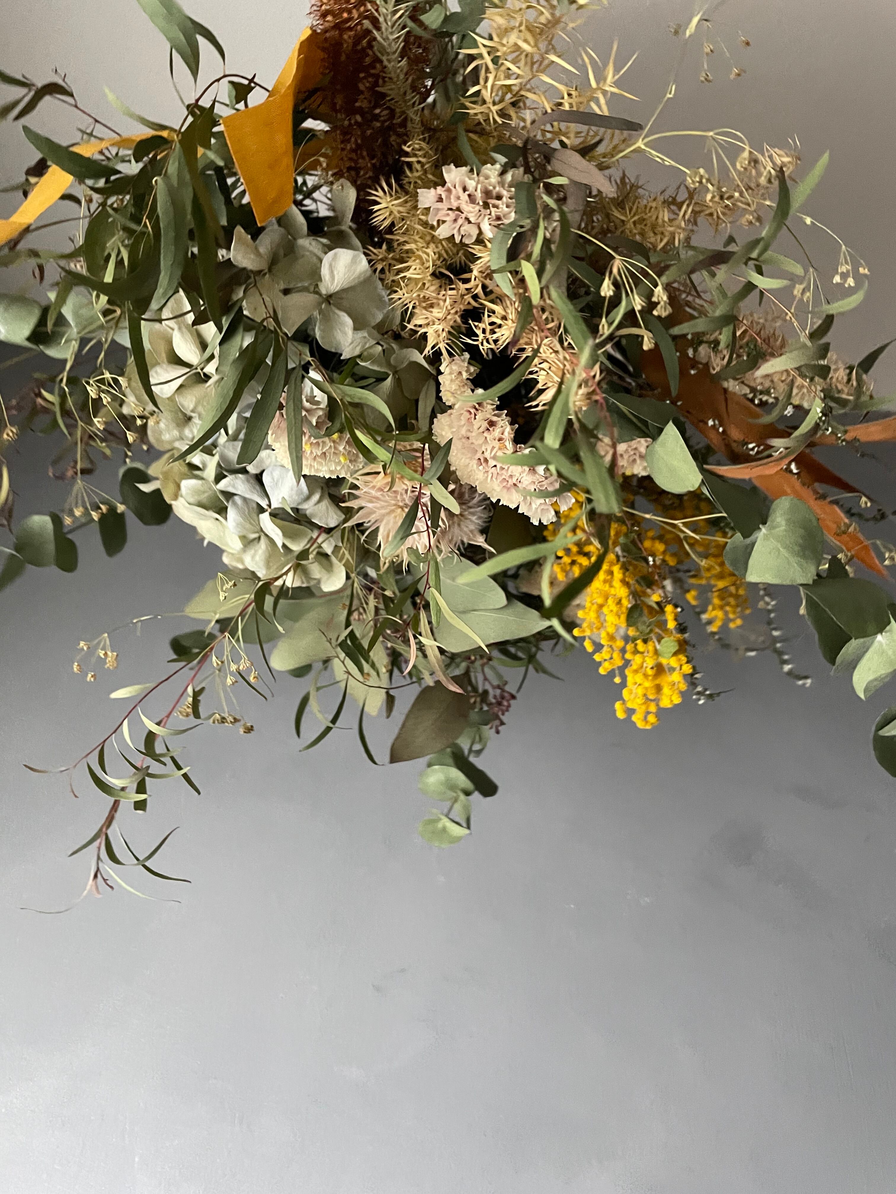 バンクシアにユーカリやミモザ、アンティーク紫陽花をたっぷり合わせて吊り下げられるブーケを作りました。