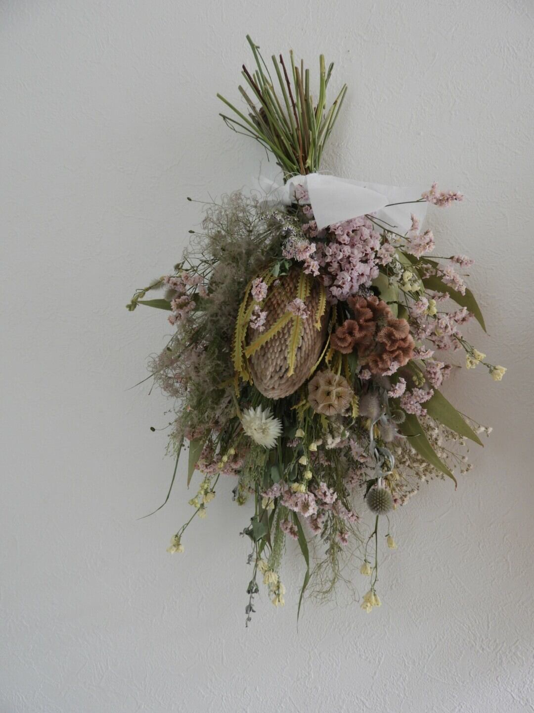 バンクシアに優しい色合いのスターチスにスモークツリー、ケイトウを合わせてスワッグにしました。
