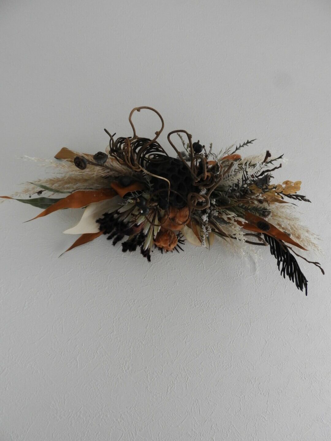 プロテアに蓮、蔓やコットンを入れて個性的な横長スワッグにしました(^^)