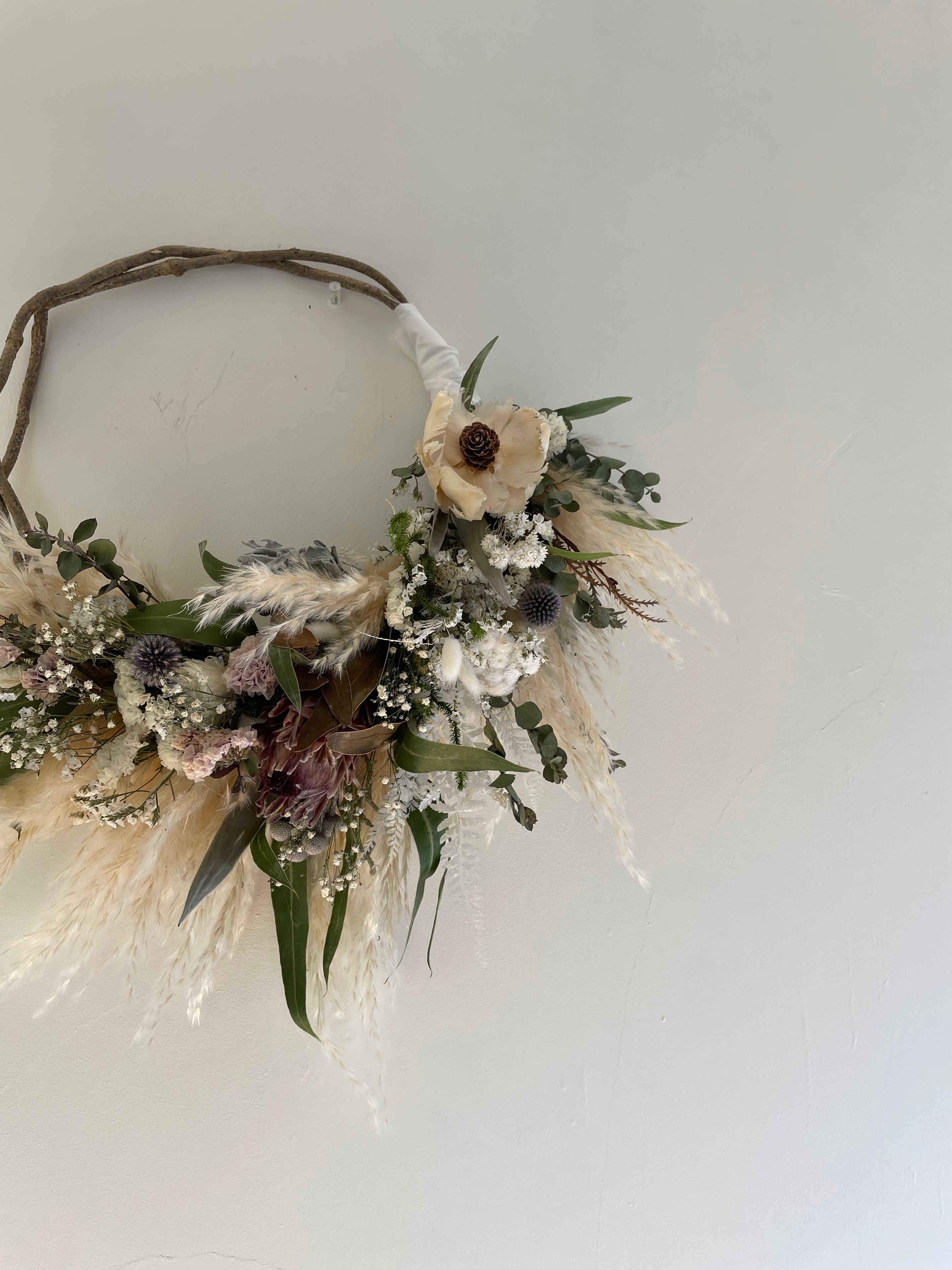 プロテアにパームフラワー、パンパスグラスや草花を入れて可愛らしいハーフリースにしました^ ^