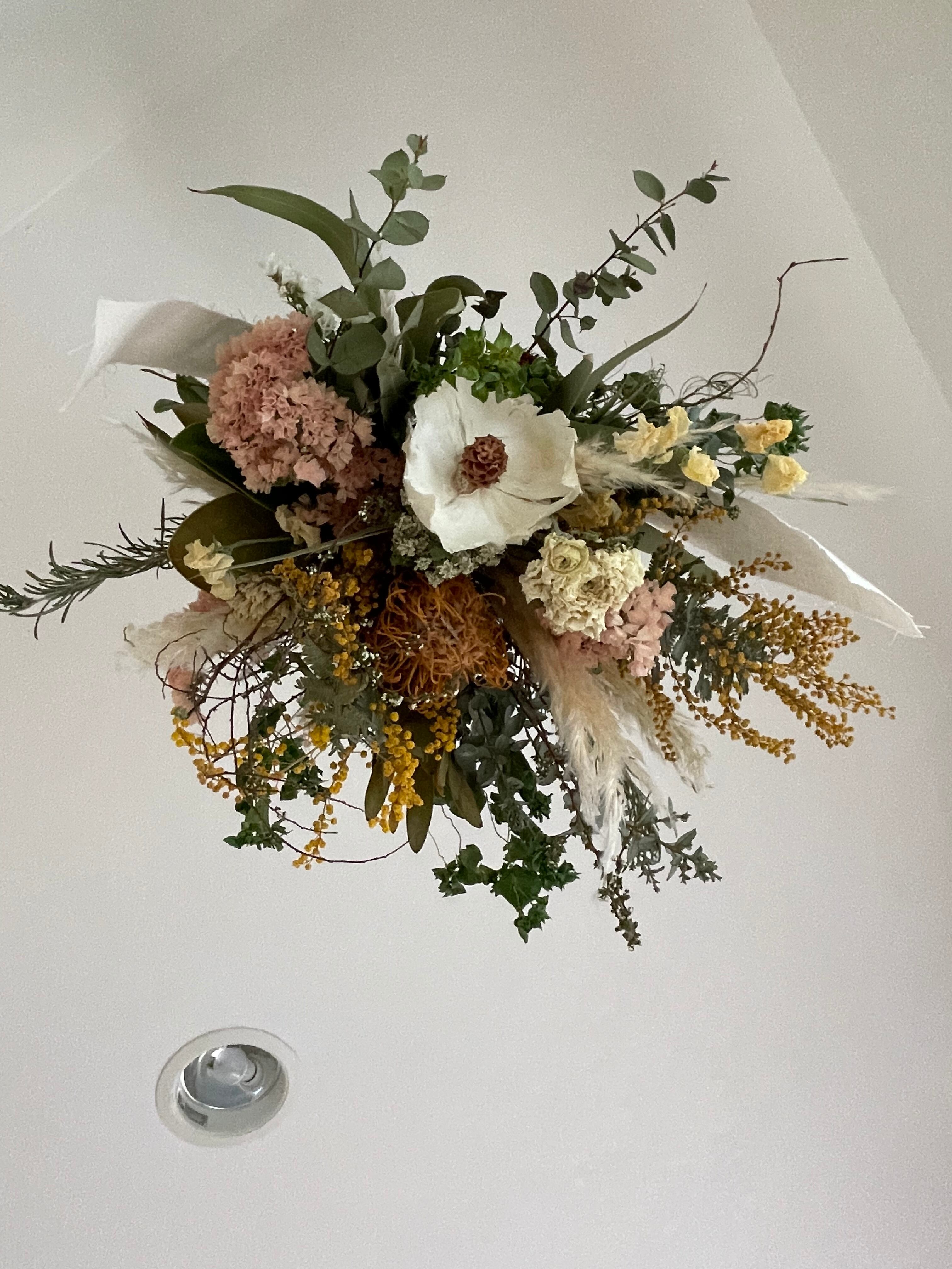 パームフラワー、ミモザやラナンキュラス、ピンクッション、ドライアンドラなどを合わせて吊り下げられるブーケを作りました。