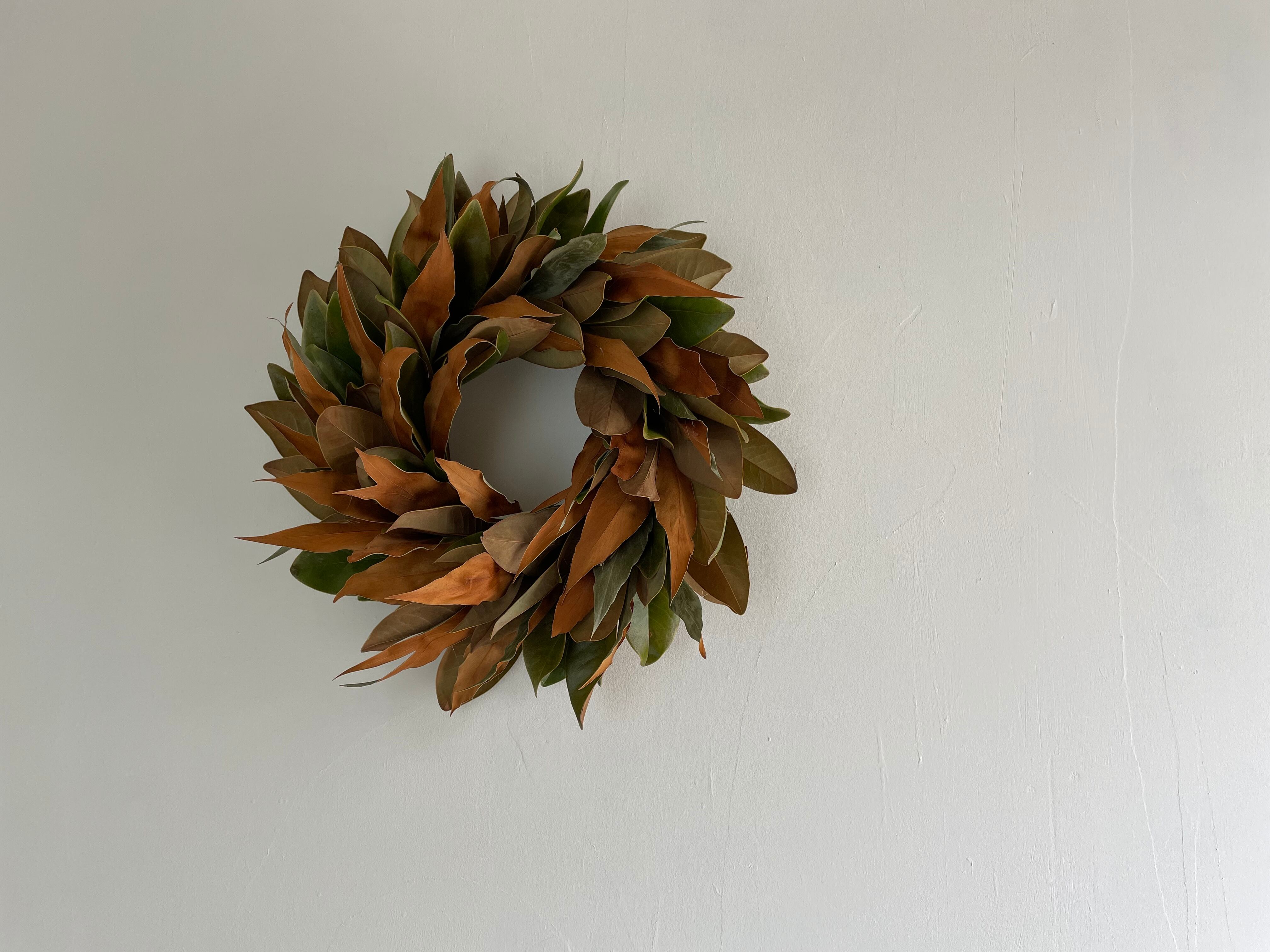 国産マグノリアとグレビレアゴールドをたっぷりと使ってインテリアにも合わせやすいシンプルなリースを作りました。