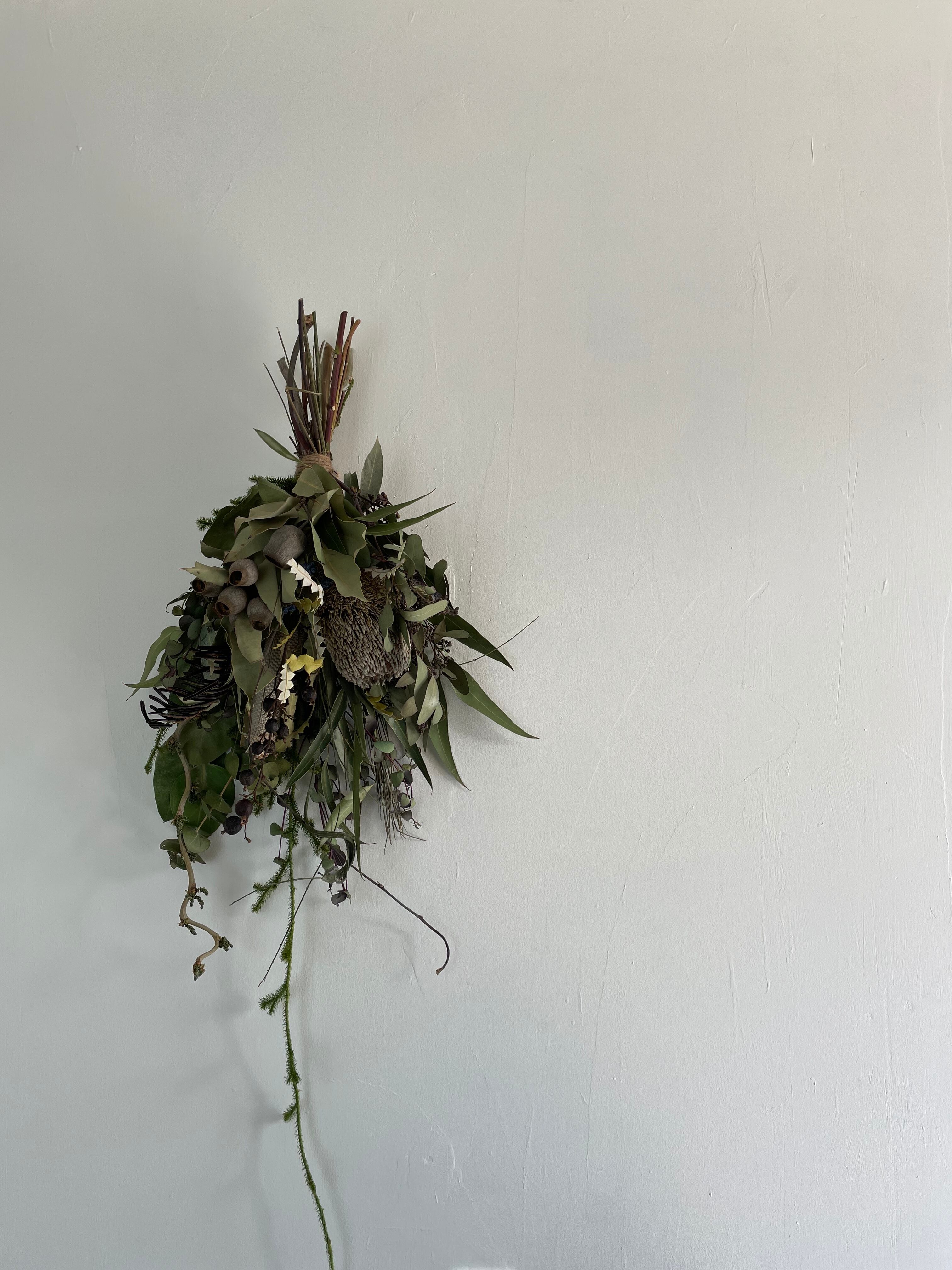 2種のバンクシアにユーカリやブラックベリーなどをいれシンプルなスワッグにしました。