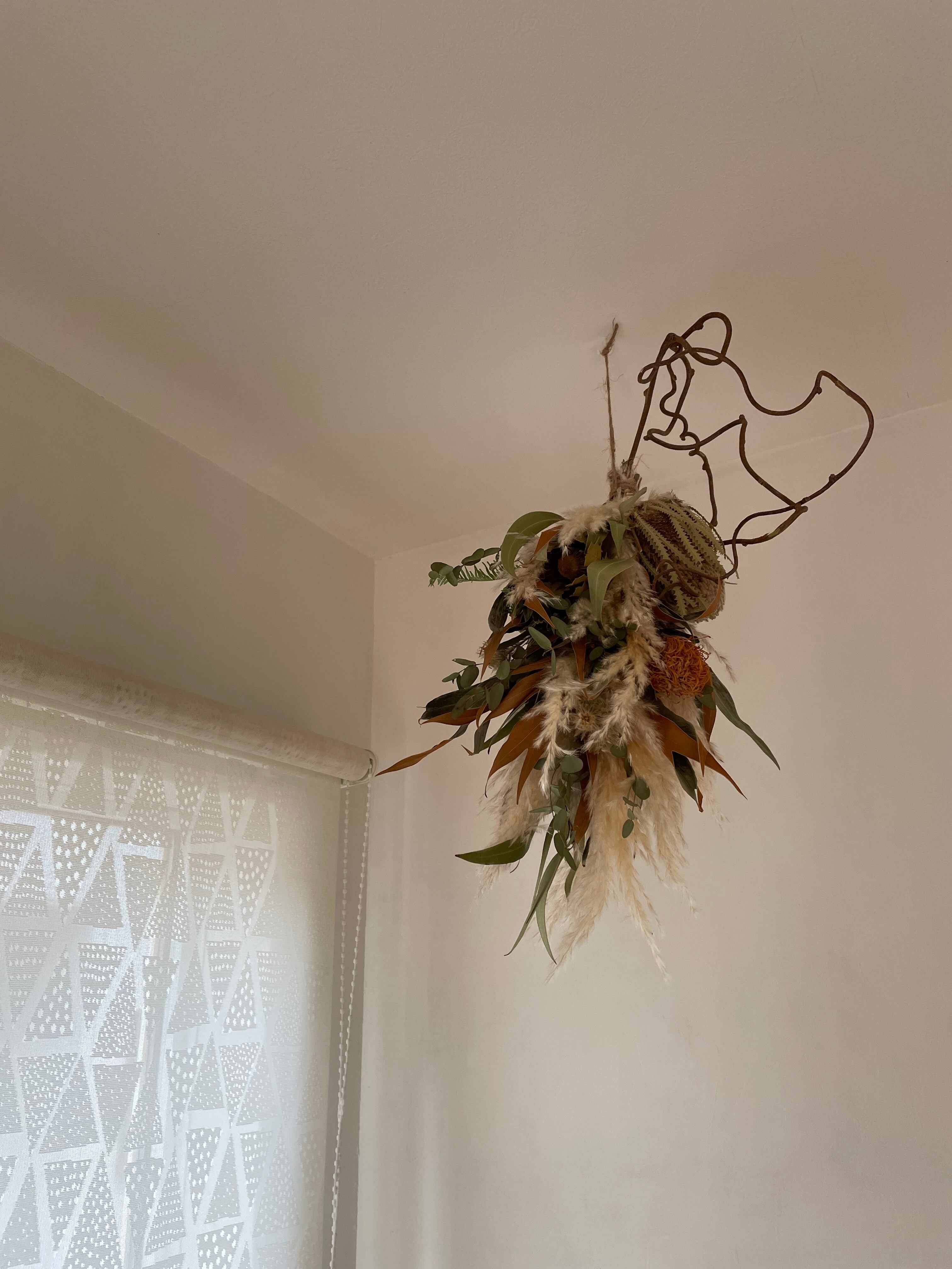 2種のバンクシア、ピンクッション、ユーカリやパンパスグラスなどを合わせて吊り下げられる個性的なオブジェを作りました。