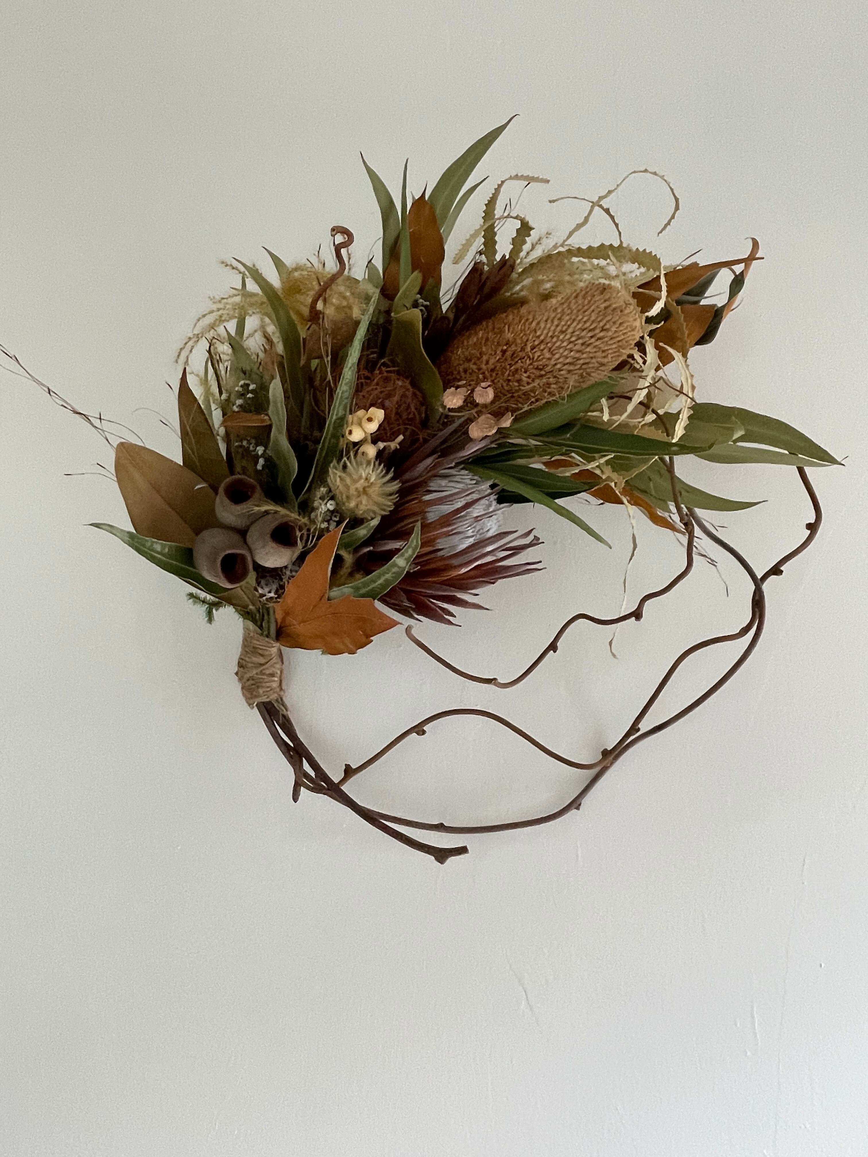 プロテアにバンクシア、ユーカリやグレビレアなどをいれて大きめのハーフリースを作りました^ ^