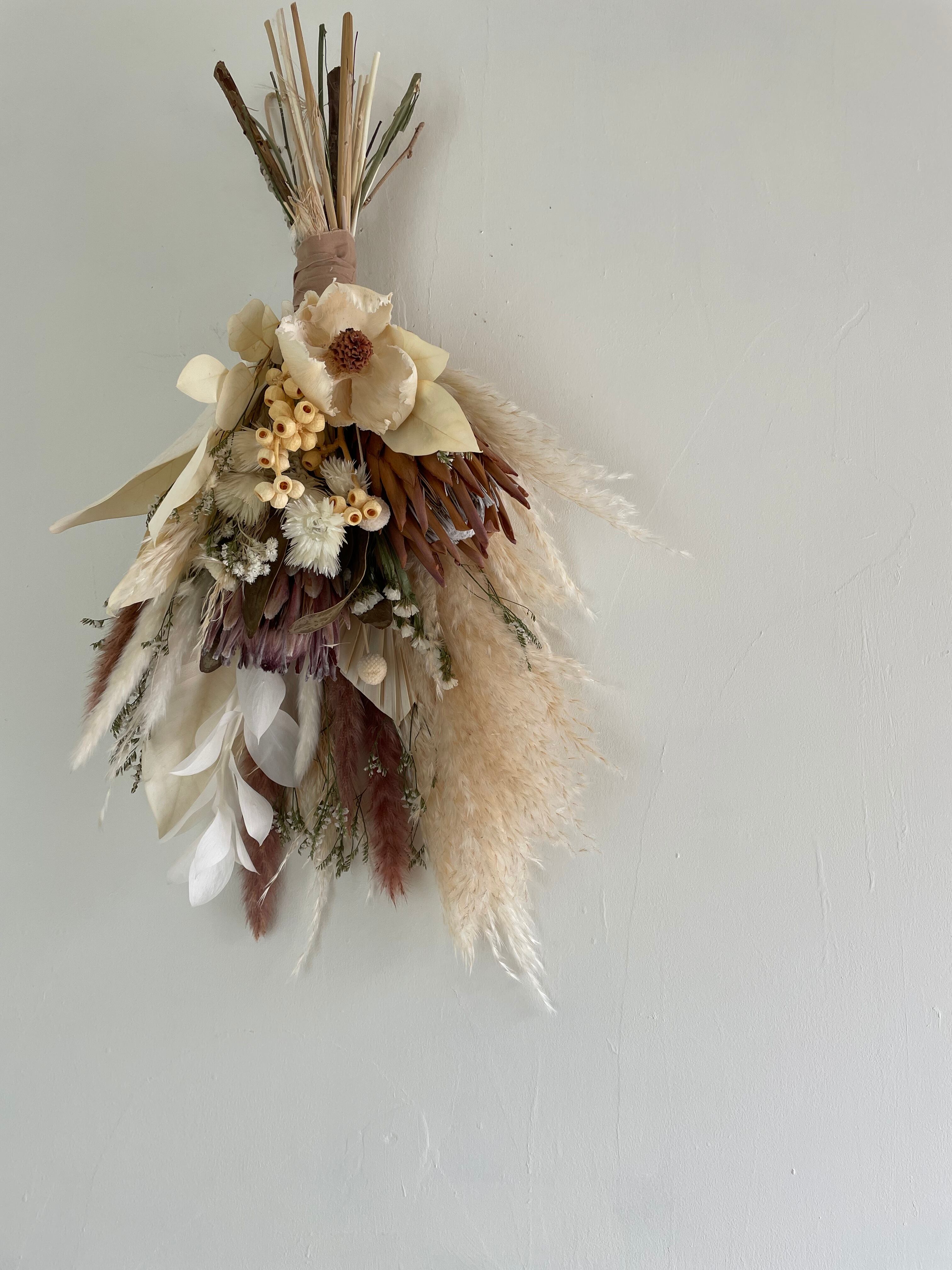 2種のプロテアにパームフラワー、テールリード、たっぷりのパンパスグラス、小花をいれて可愛らしい色合いのスワッグを作りました^ ^