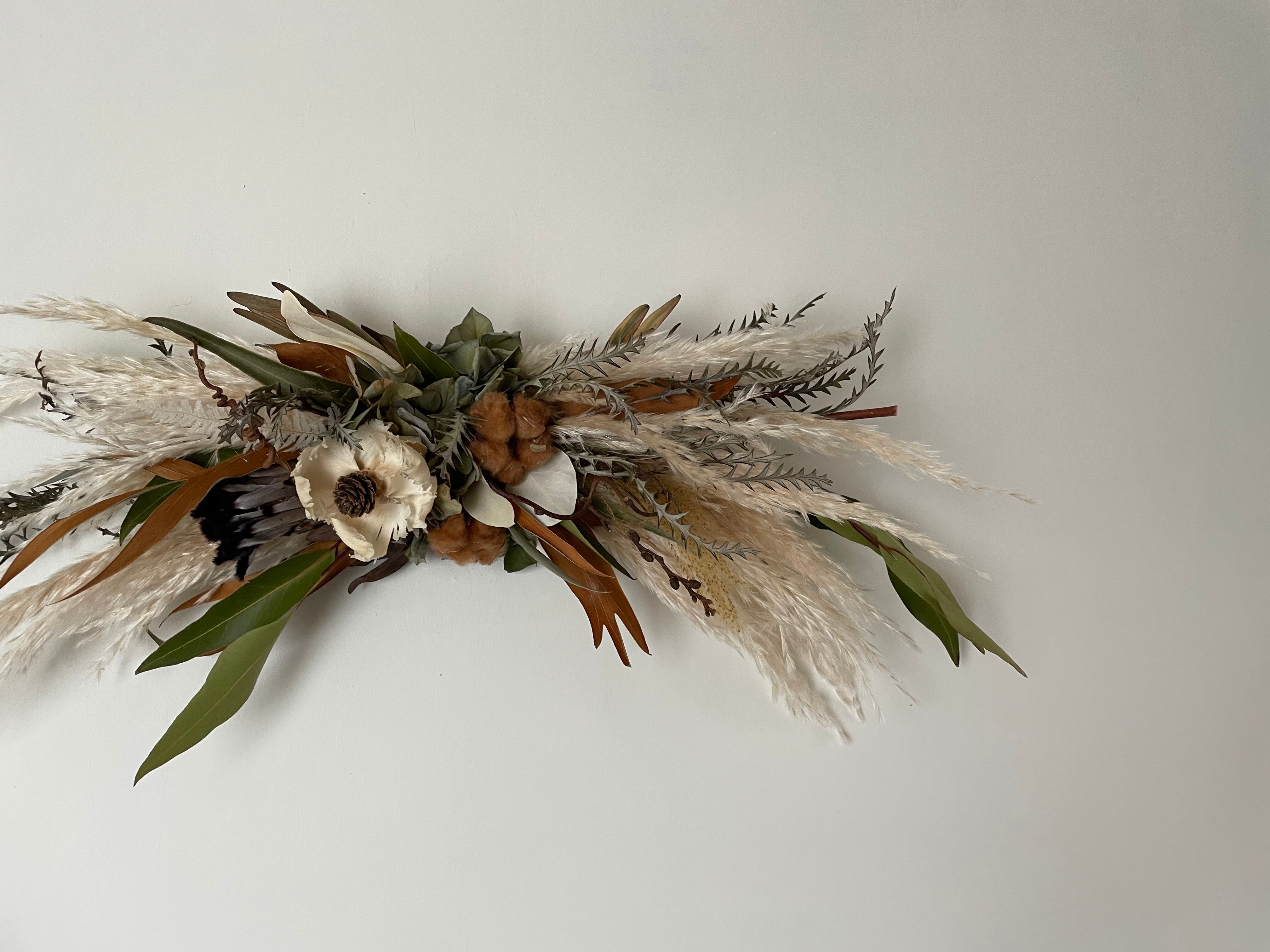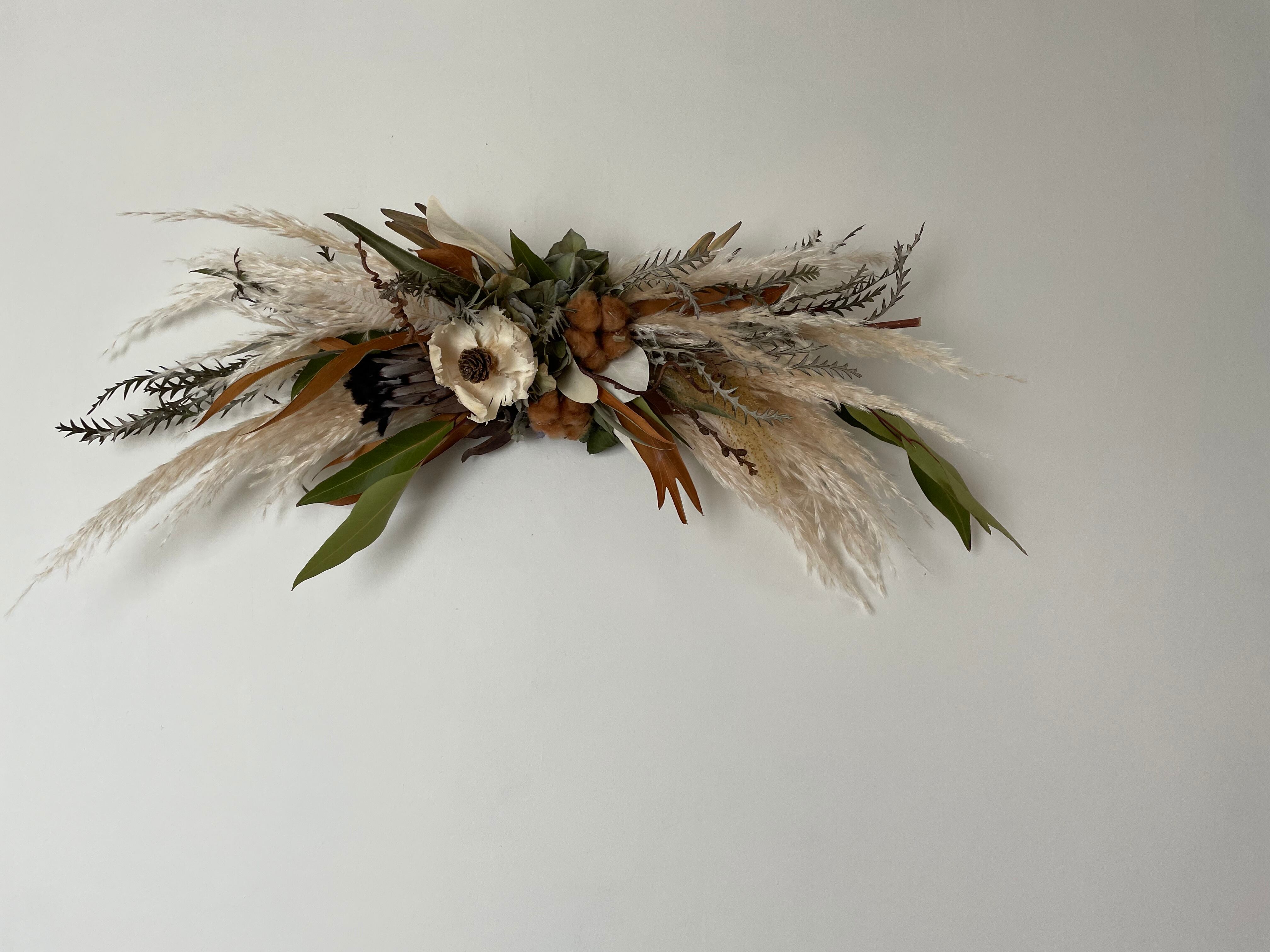プロテアにパームフラワー、アンティーク紫陽花やパンパスグラスを合わせてシンプルでインテリアにもおすすめの横長スワッグです。