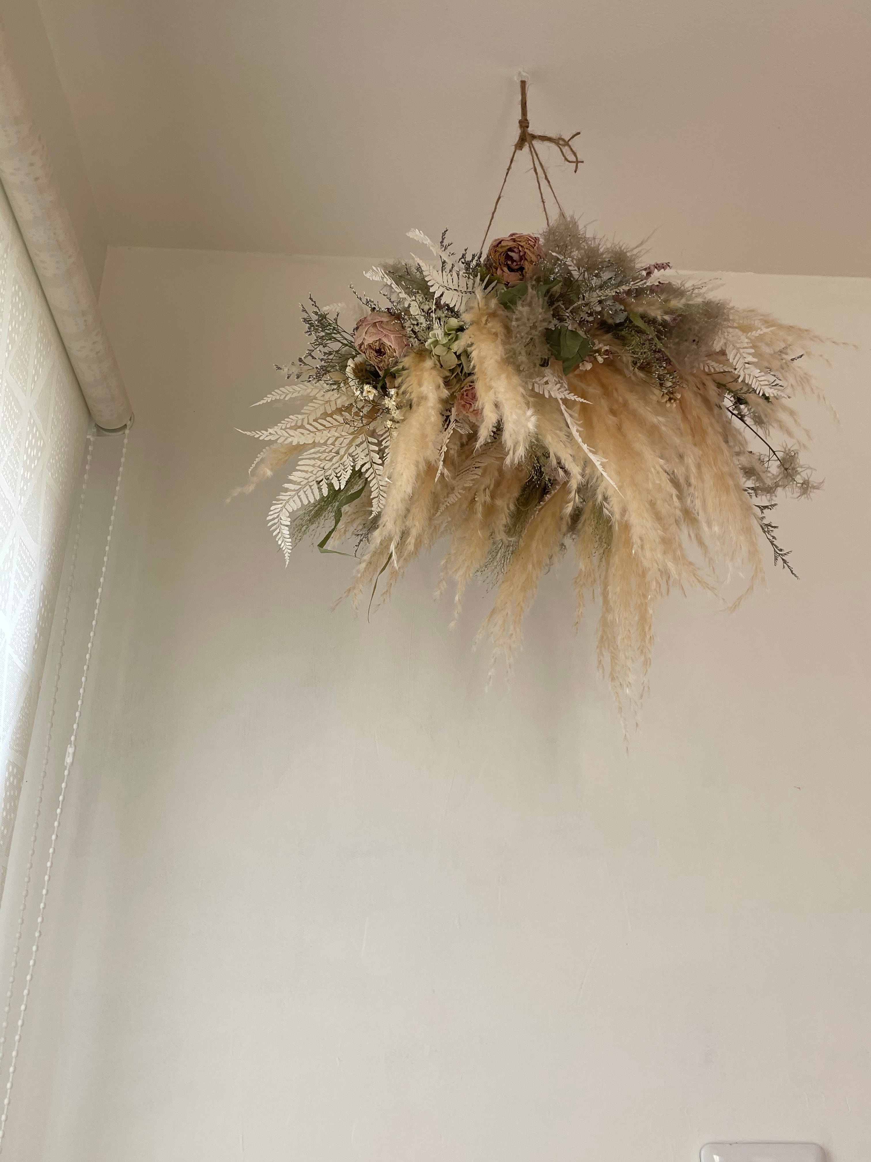 スモークツリーに芍薬、パンパスグラス、スターチスなどをいれ可愛いらしいフライングリースを作りました^ ^