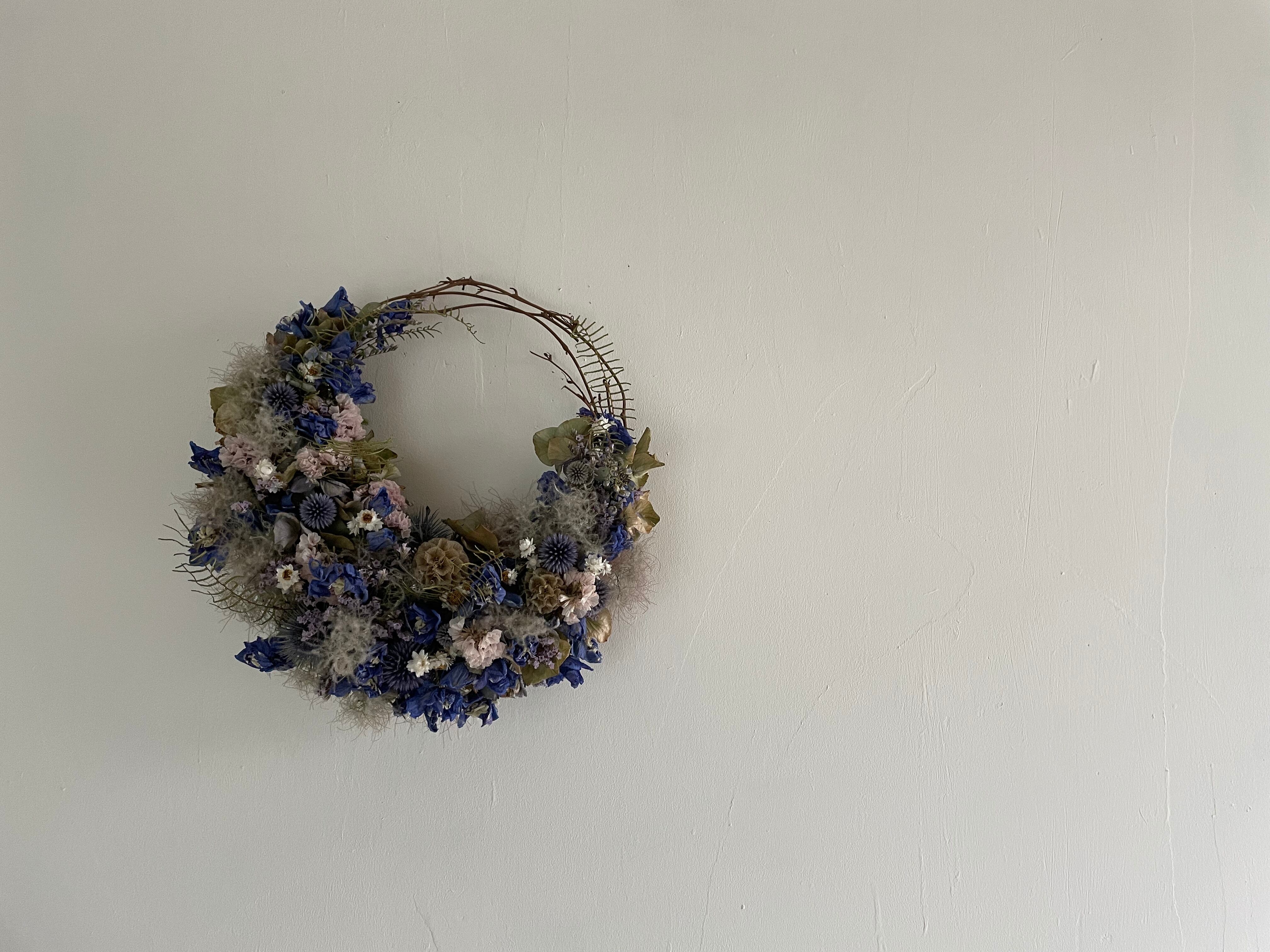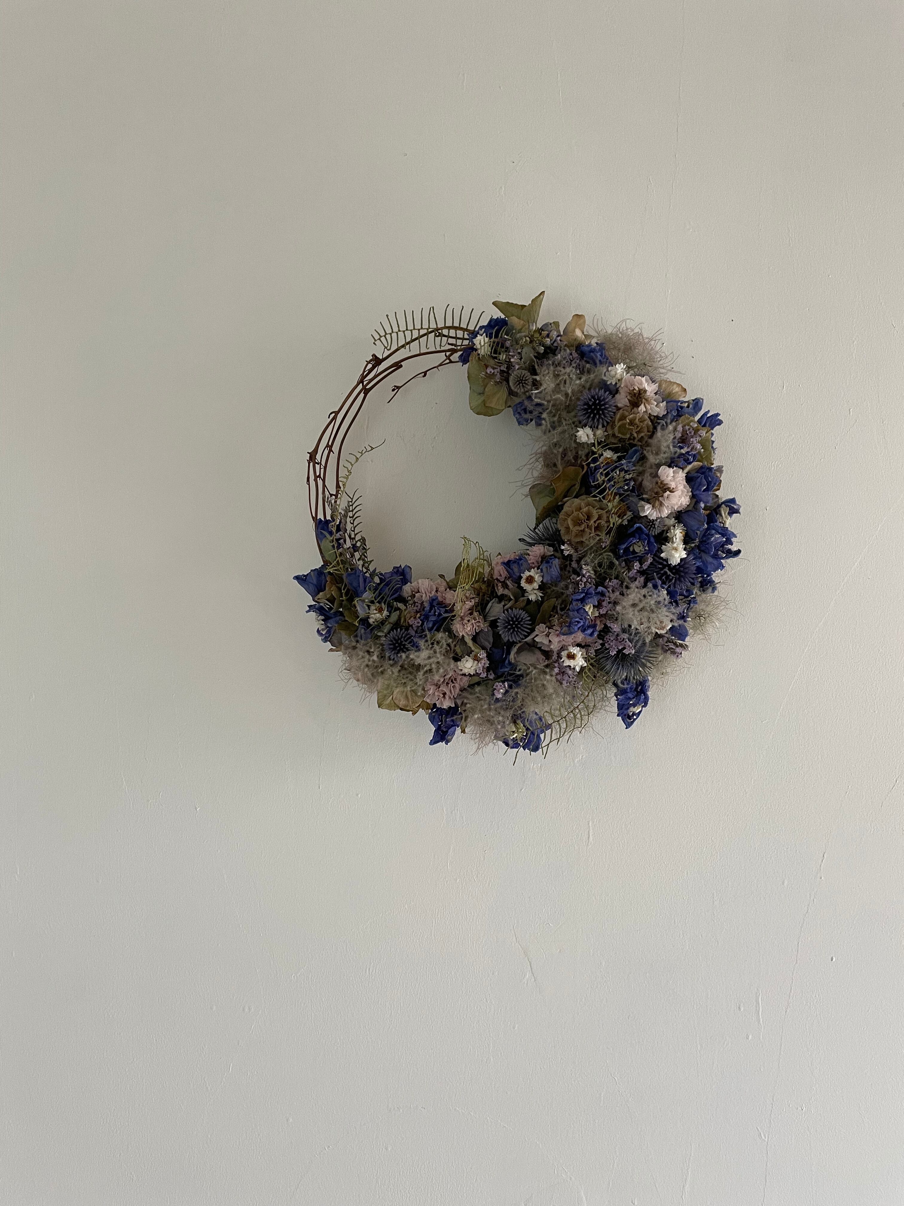 スモークツリー、デルフィニウムや瑠璃玉アザミ、小花がたっぷり入ったの三日月リースになります。
