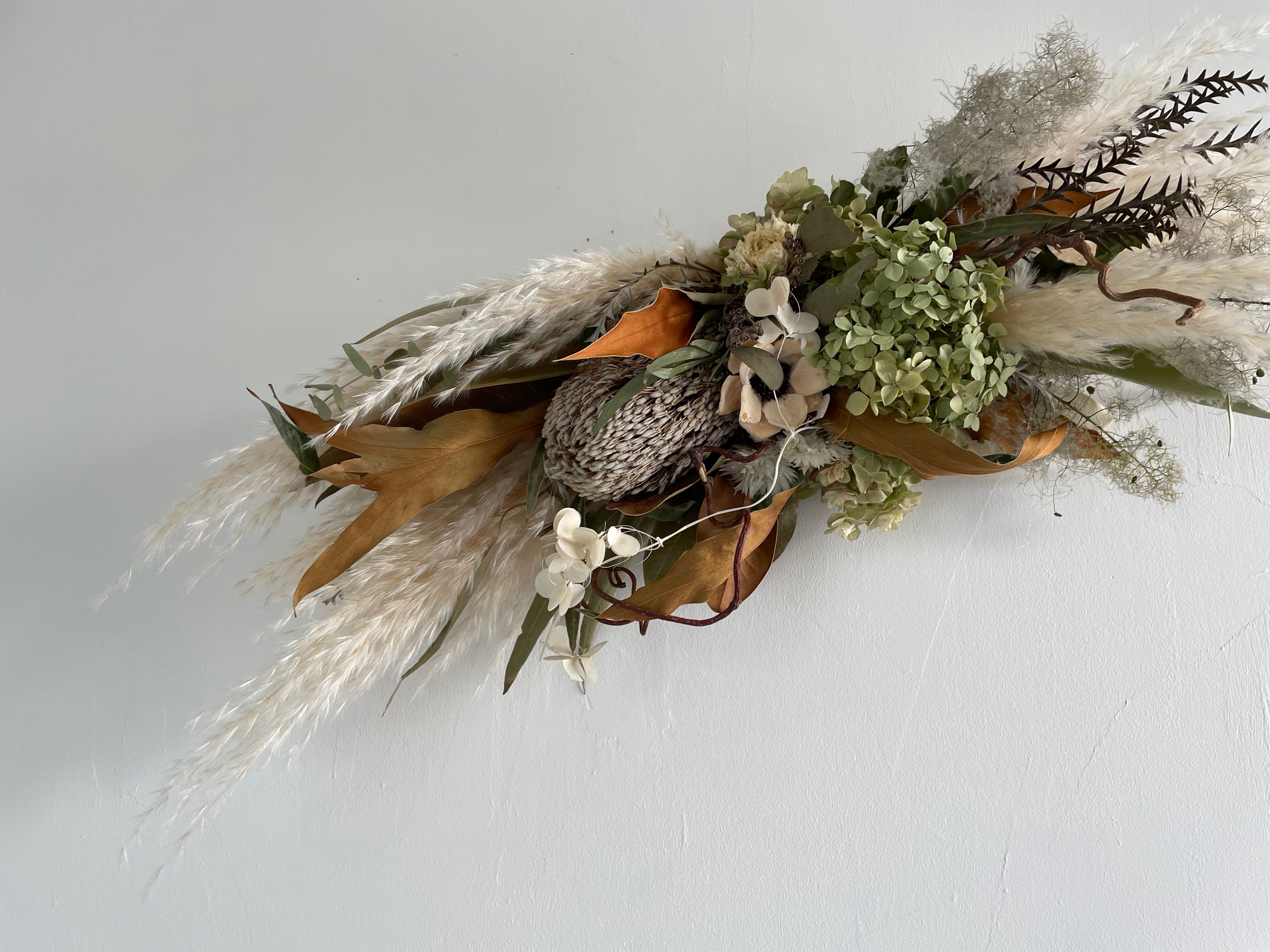 バンクシアとパインフラワーにアナベルやパンパスグラスを合わせてシンプルでインテリアにもおすすめの横長スワッグです。
