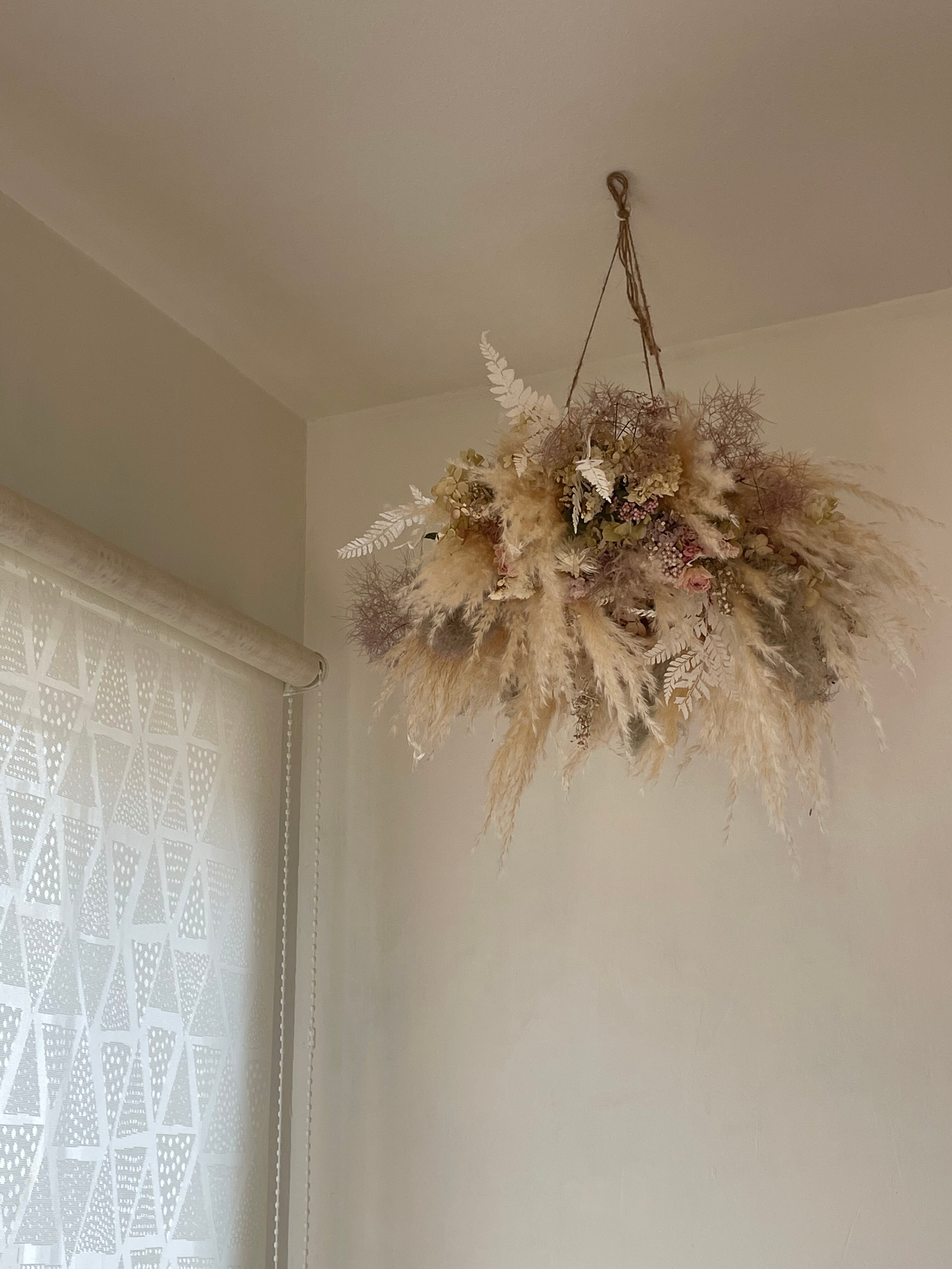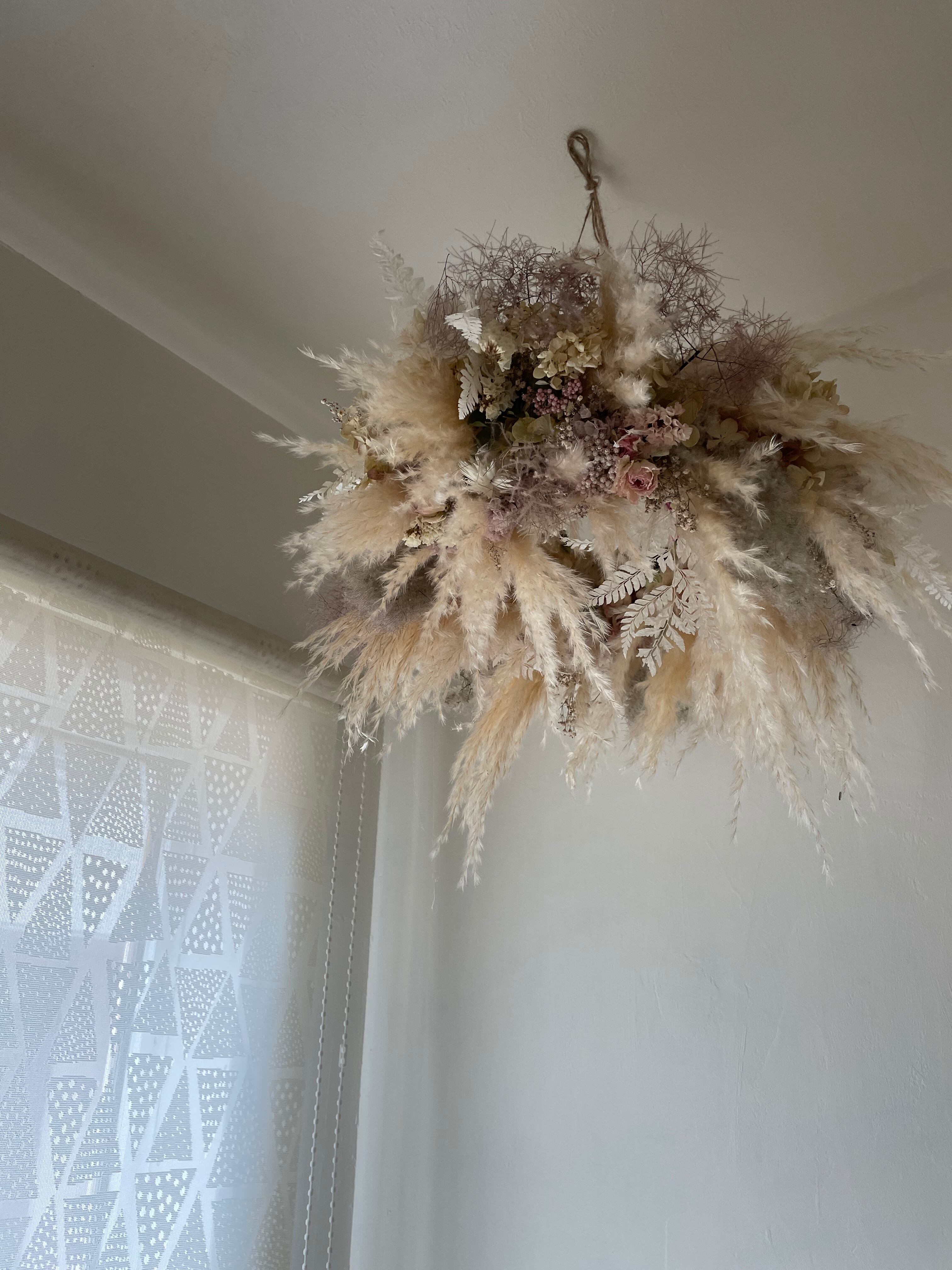 スモークツリー(ホワイト、ピンク)、パンパスグラス、スターチス、などをいれ可愛いらしいフライングリースを作りました^ ^