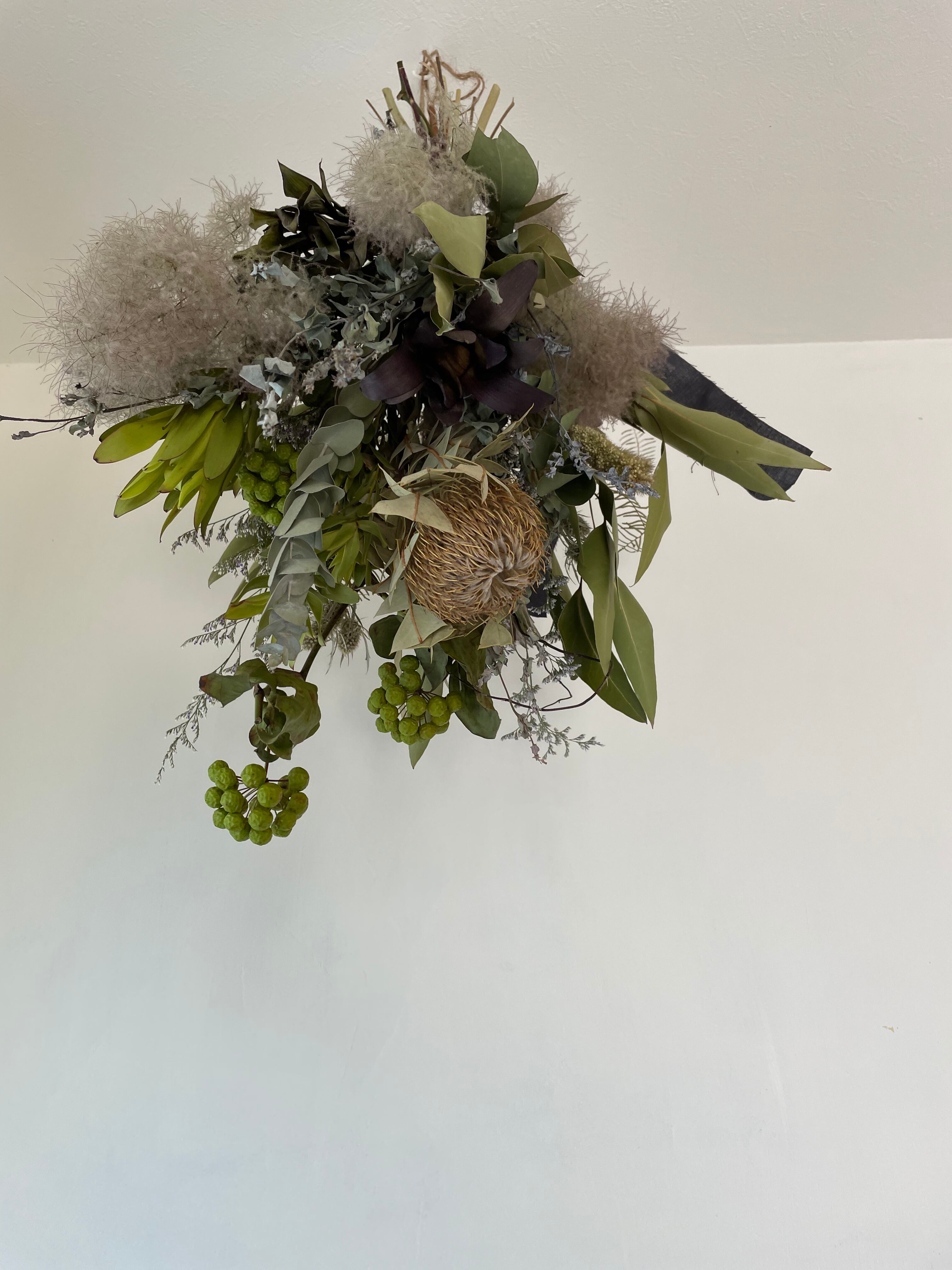 バンクシアにスモークツリー、ユーカリ、リューカデンドロなどを合わせて吊り下げられるブーケを作りました。
