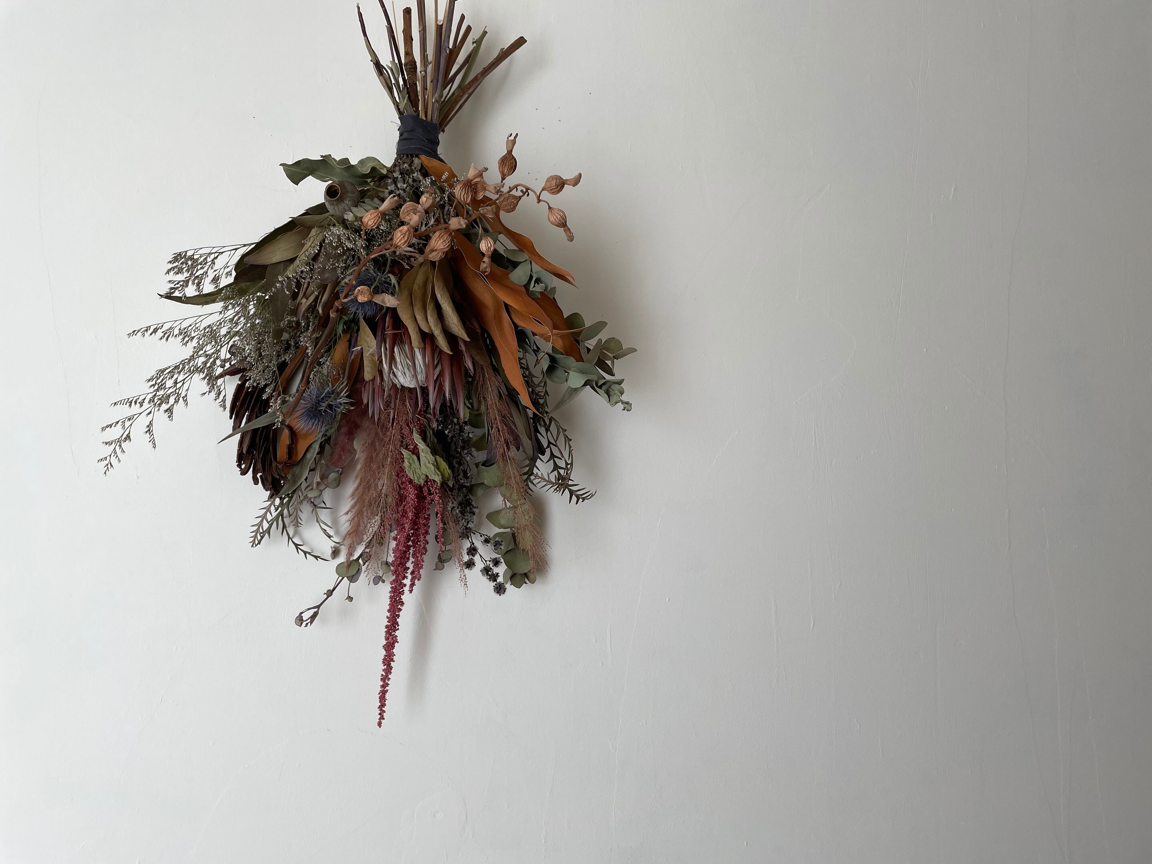 プロテアにテールリード、月桃の実やアマランサス、アンティークな雰囲気のスワッグを作りました^ ^