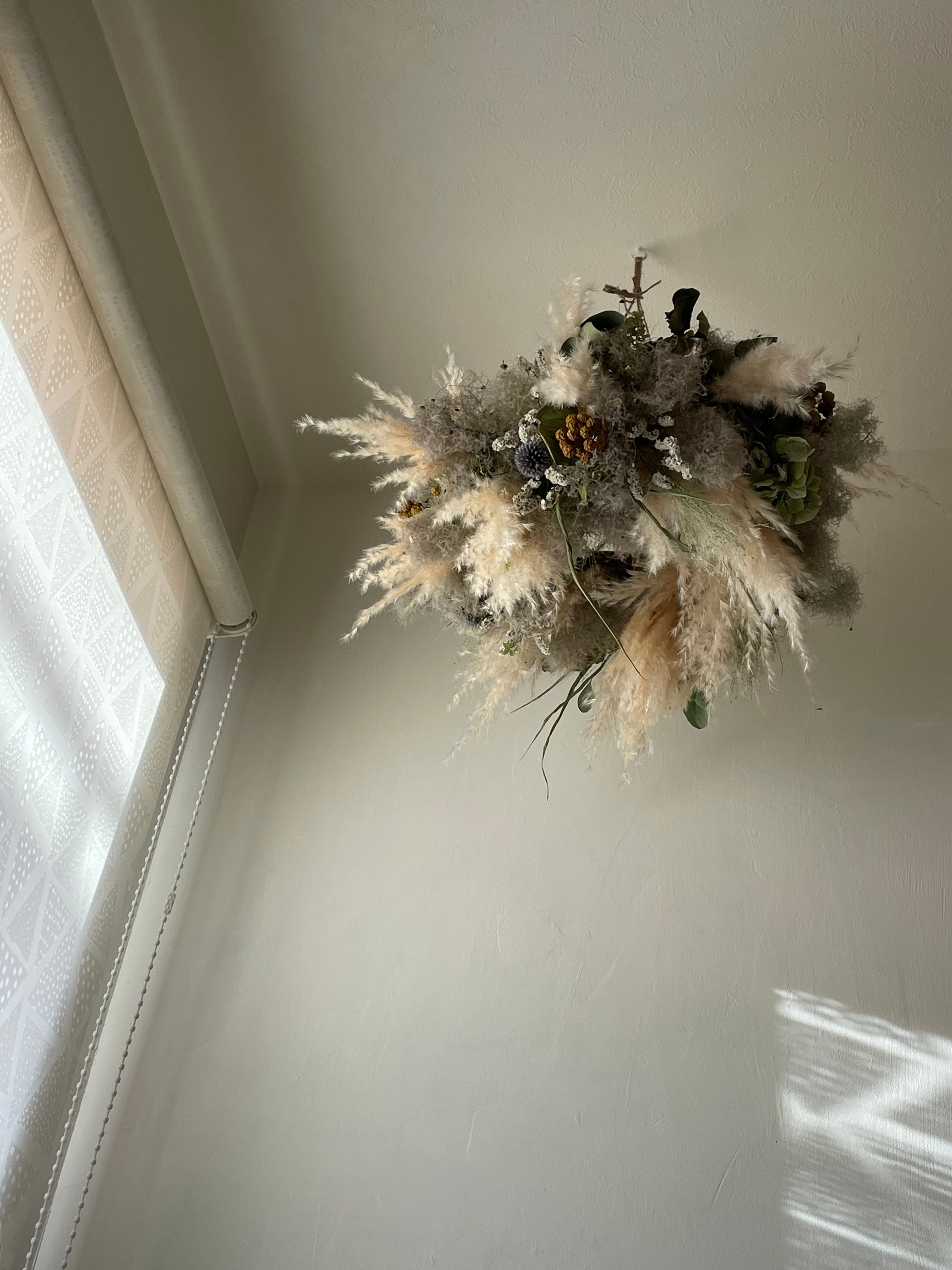 スモークツリー(ホワイトファー)、パンパスグラス、スターチス、アンティーク紫陽花などをいれ可愛いらしいフライングリースを作りました^ ^