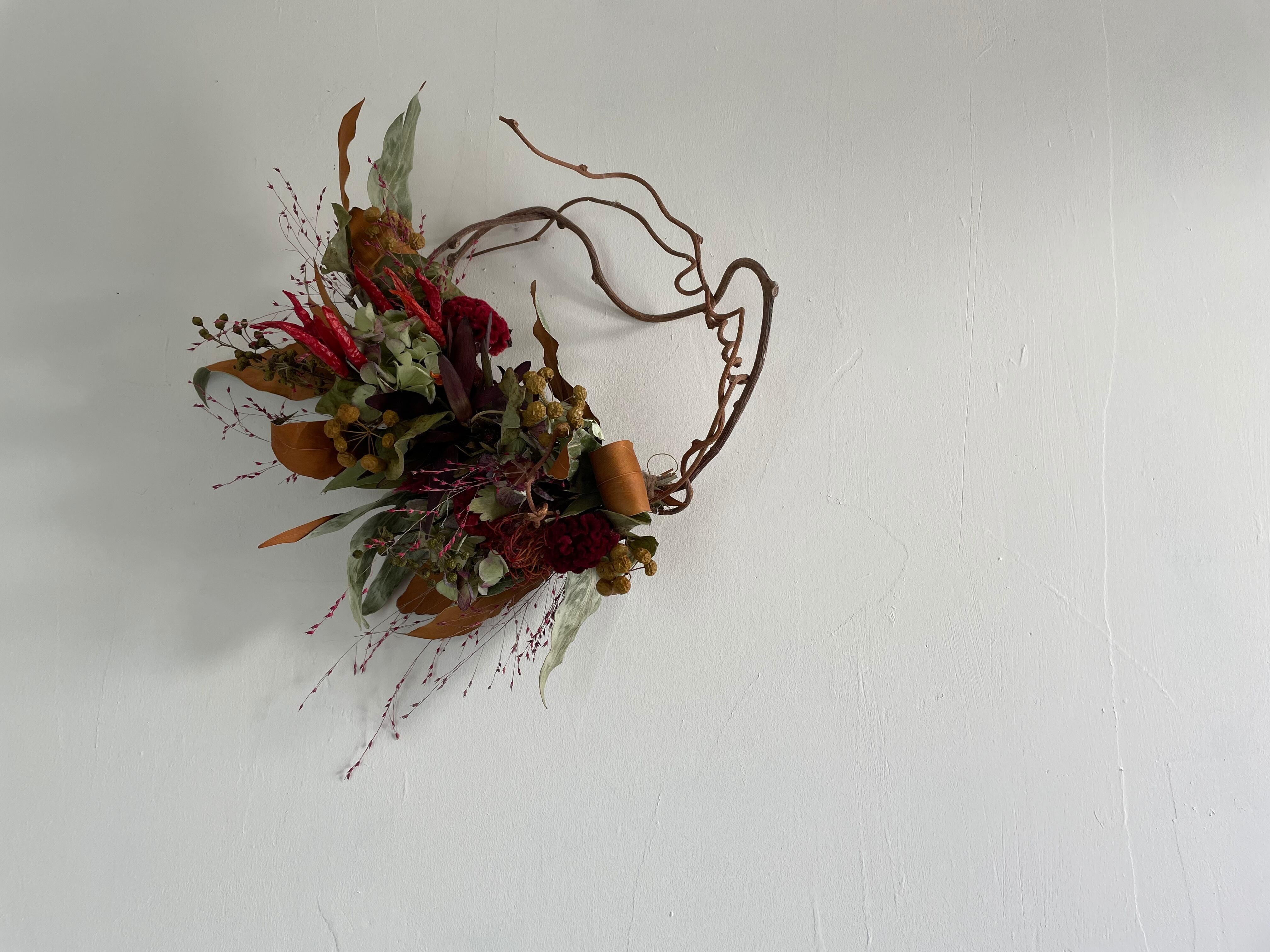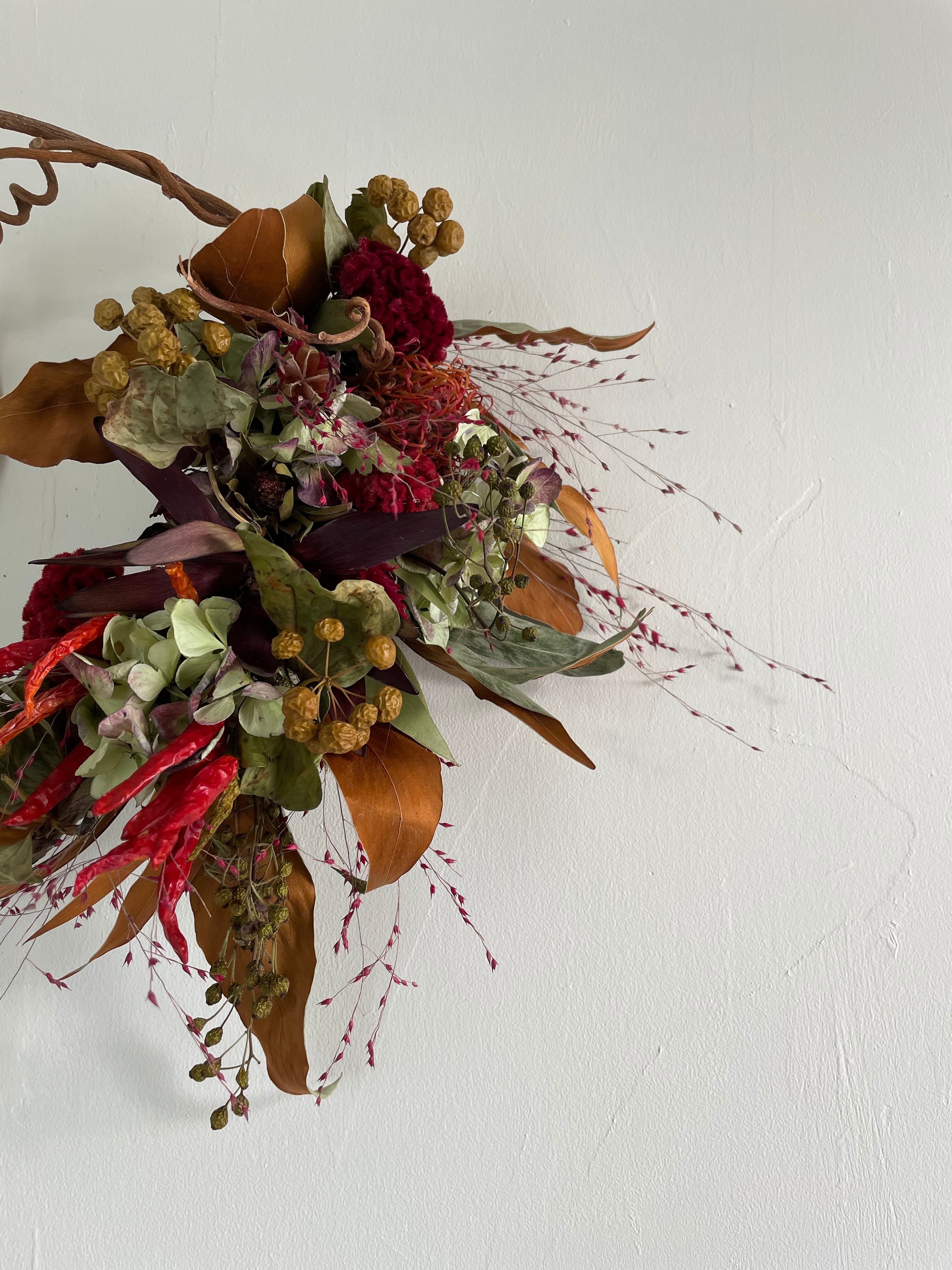 ピンクッションにケイトウ、アンティーク紫陽花や秋の草花を入れてくねっとした変形ハーフリースを作りました^ ^