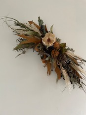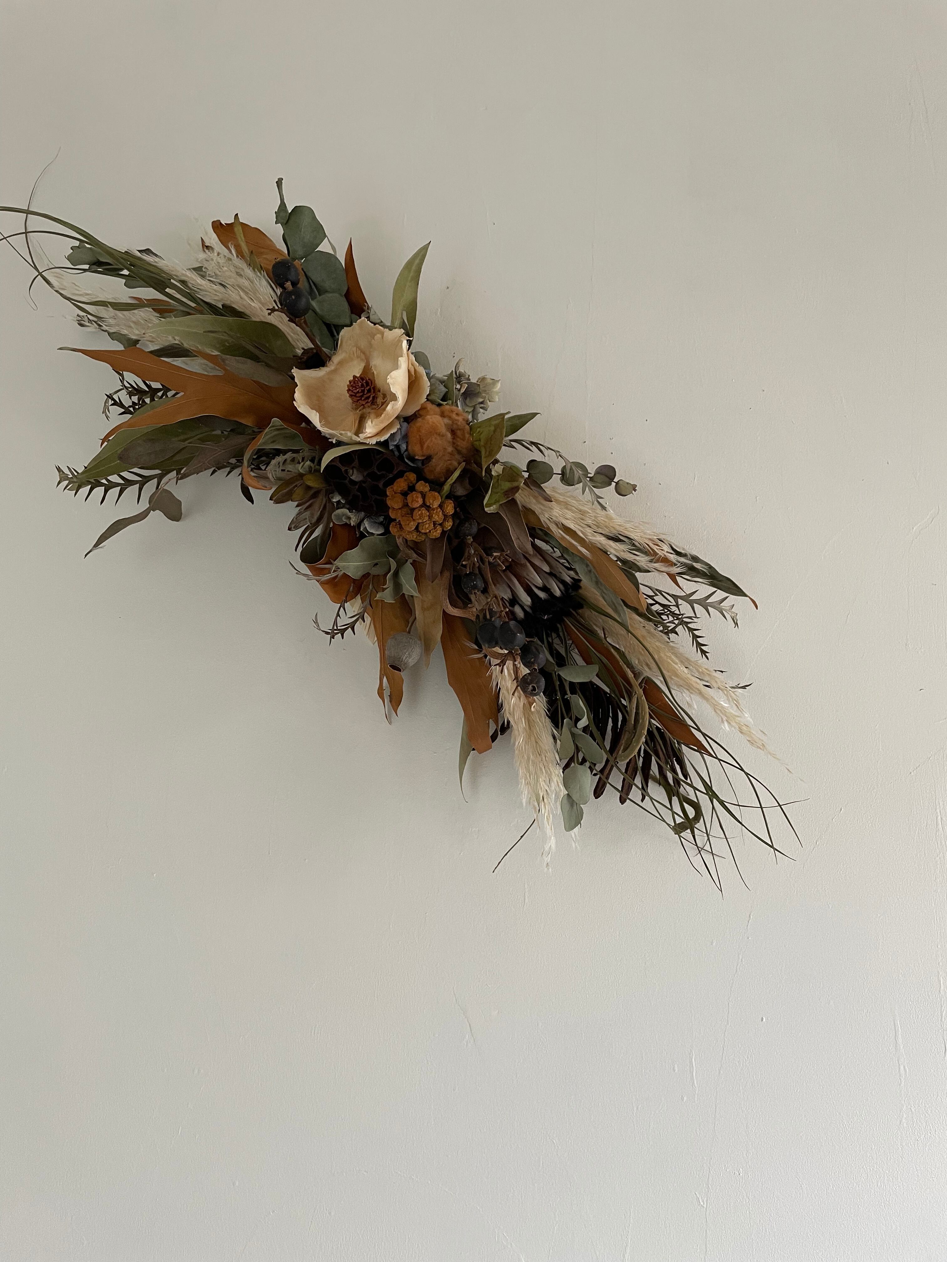プロテアニオベにパームフラワー、パンパスグラスやコットン、ユーカリなどを合わせてシンプルでインテリアにもおすすめの横長スワッグです。