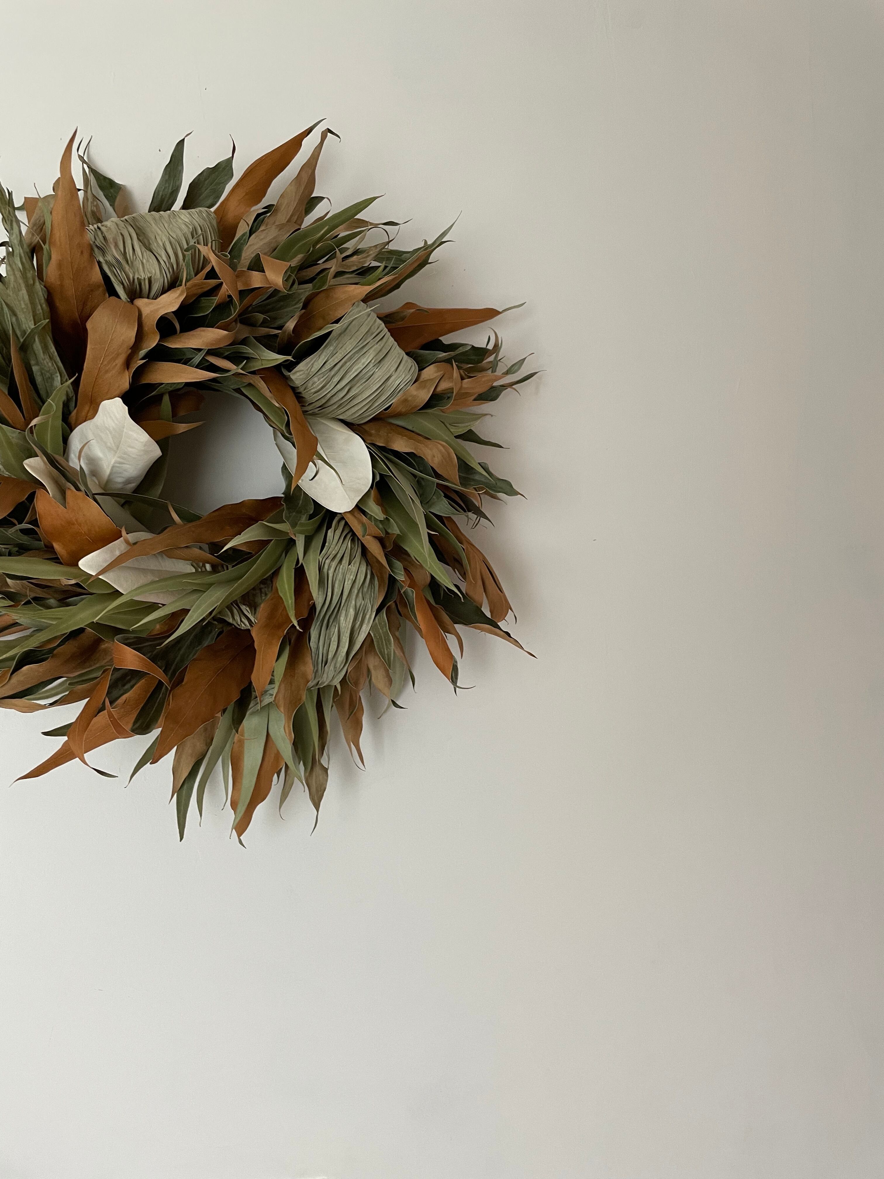 グレビレアゴールドをたっぷり使いウチワヤシ、泰山木、ユーカリをアクセントに入れ、インテリアにも合わせやすいリースを作りました。
