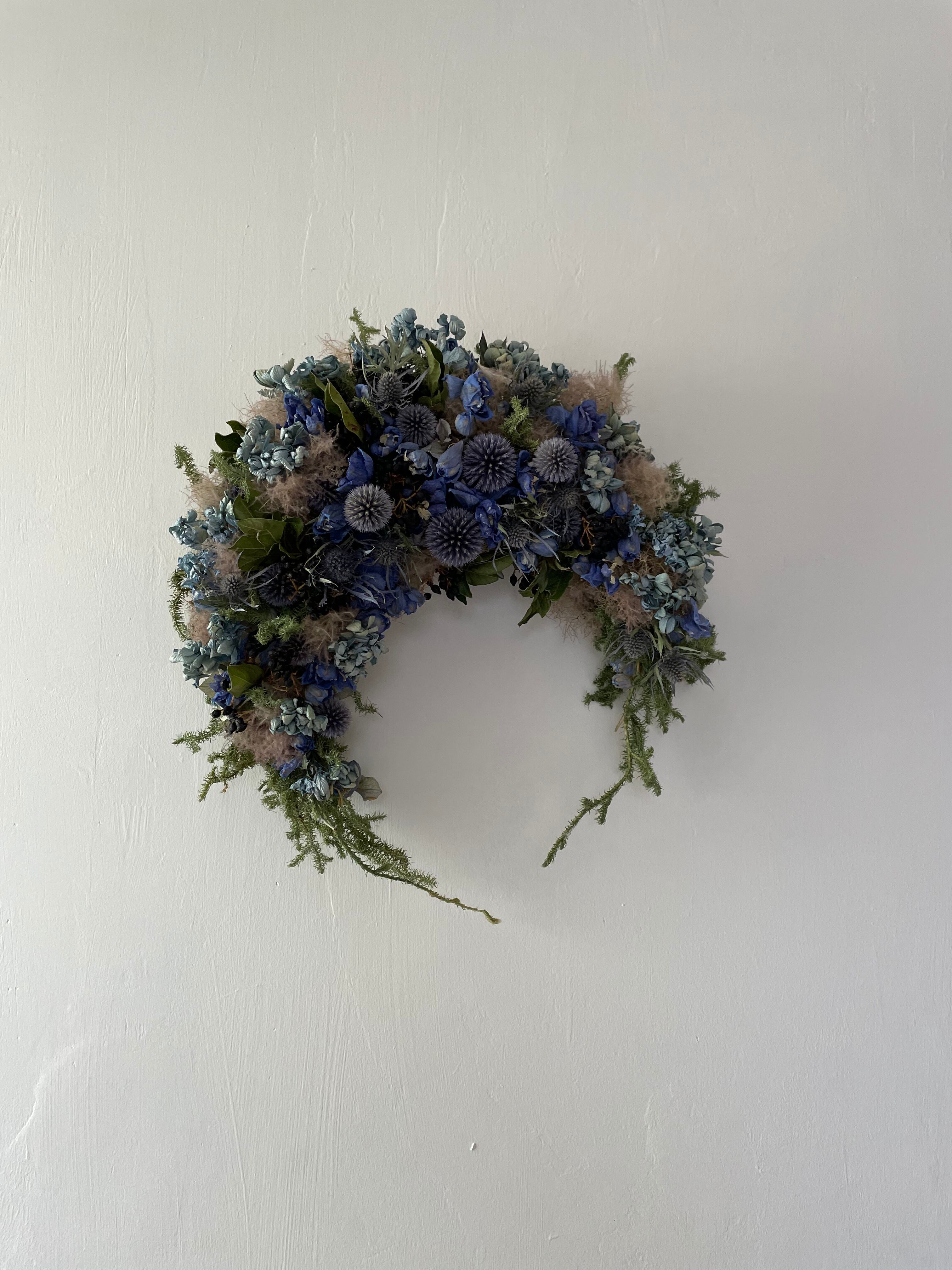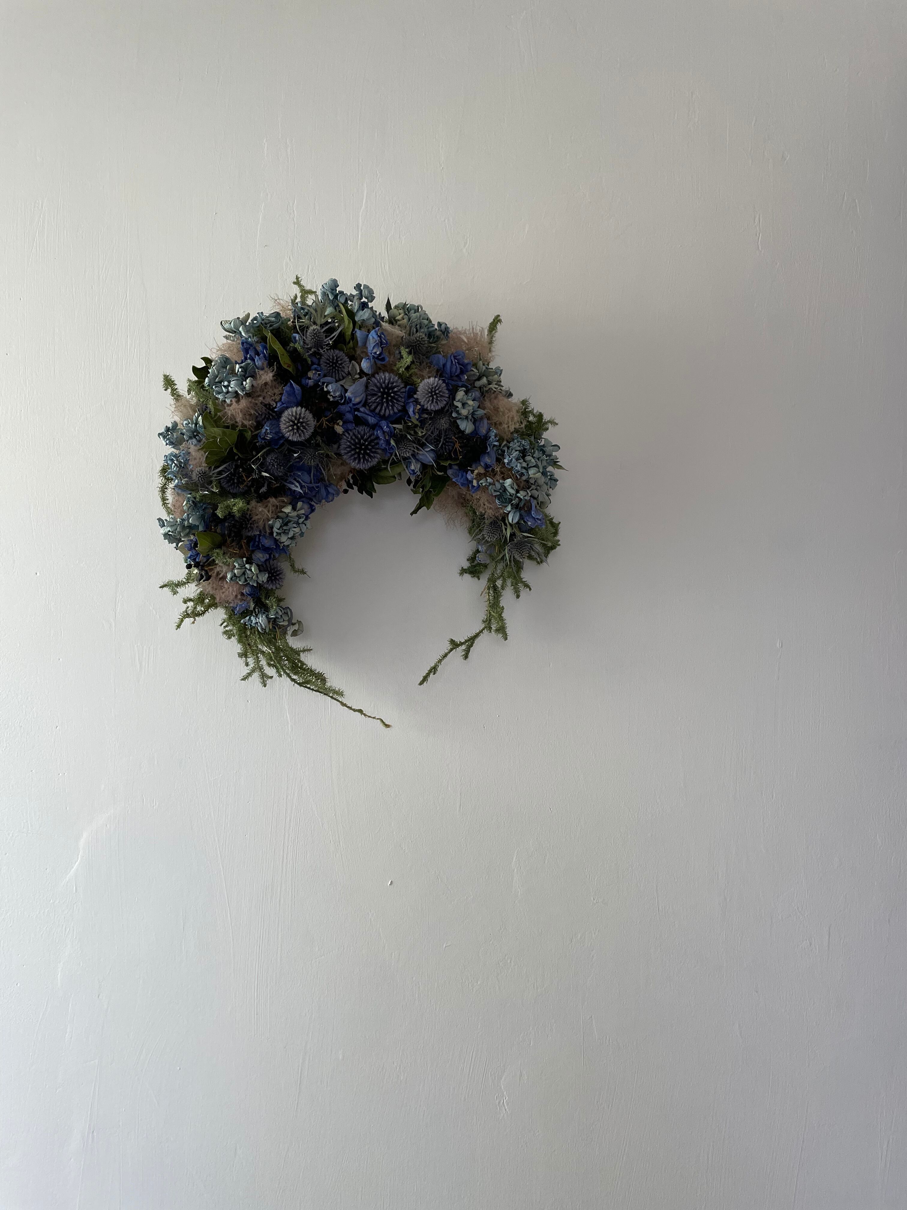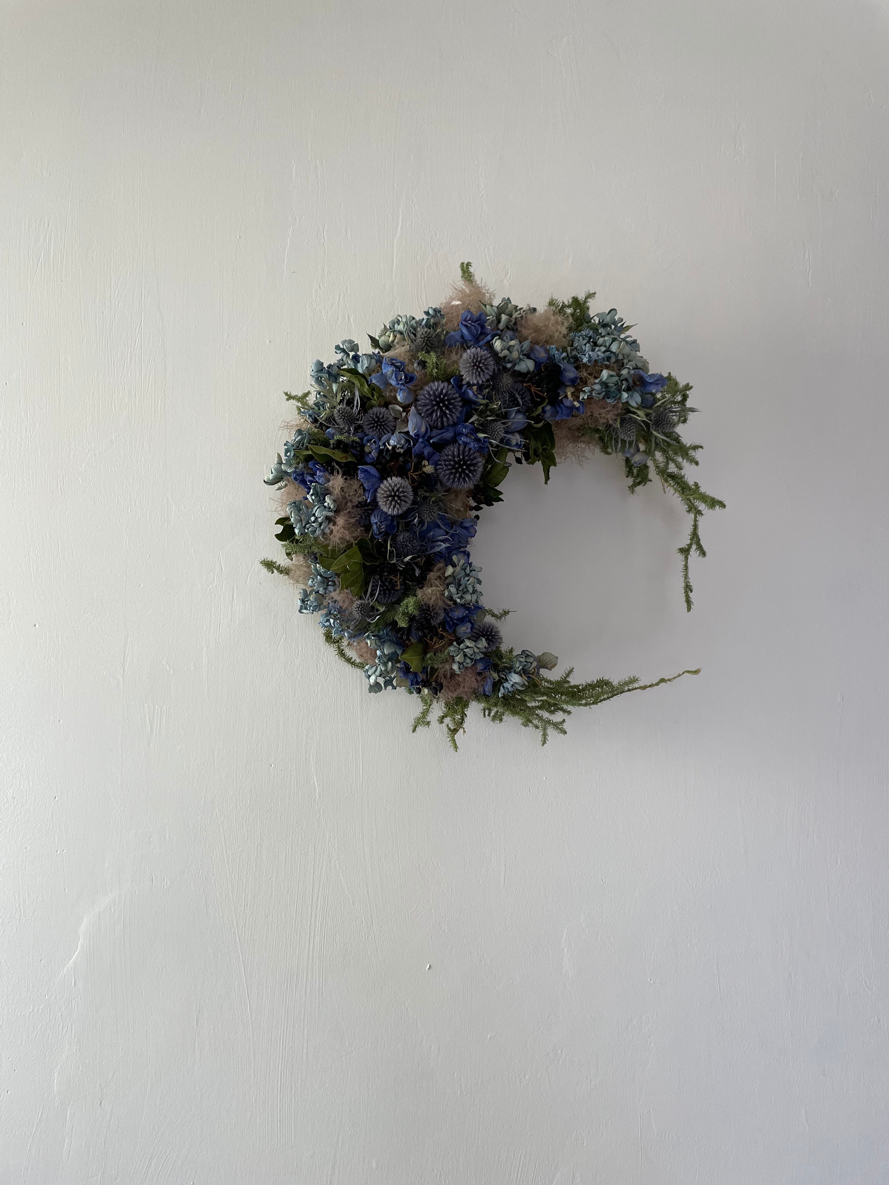 デルフィニウムや瑠璃玉アザミ、アンティーク紫陽花などをいれて三日月リースにしました。