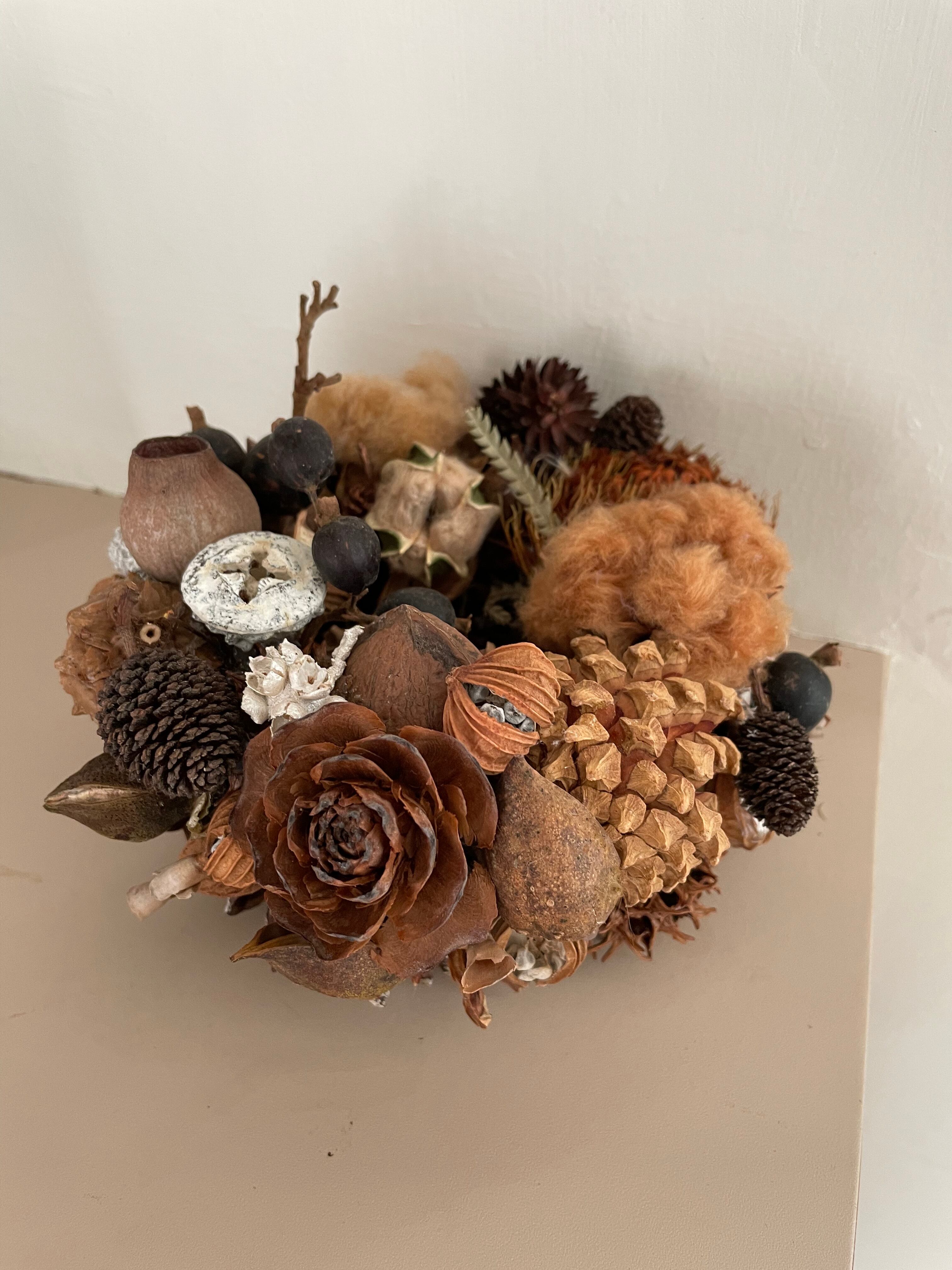 木の実のリースのオーダーはご予算、色味のみで細かい花材指定はできません。ご了解くださいm(_ _)mキャラメル色の松笠は数に限りがあります。