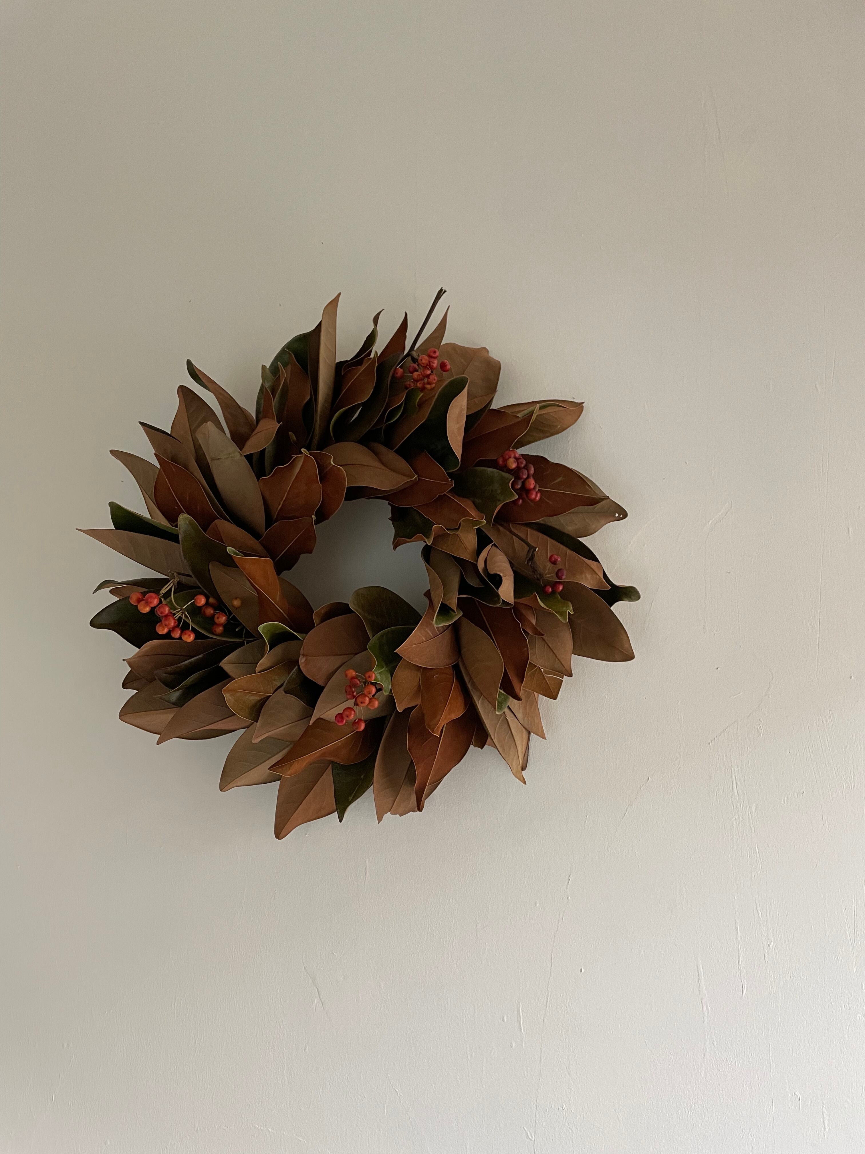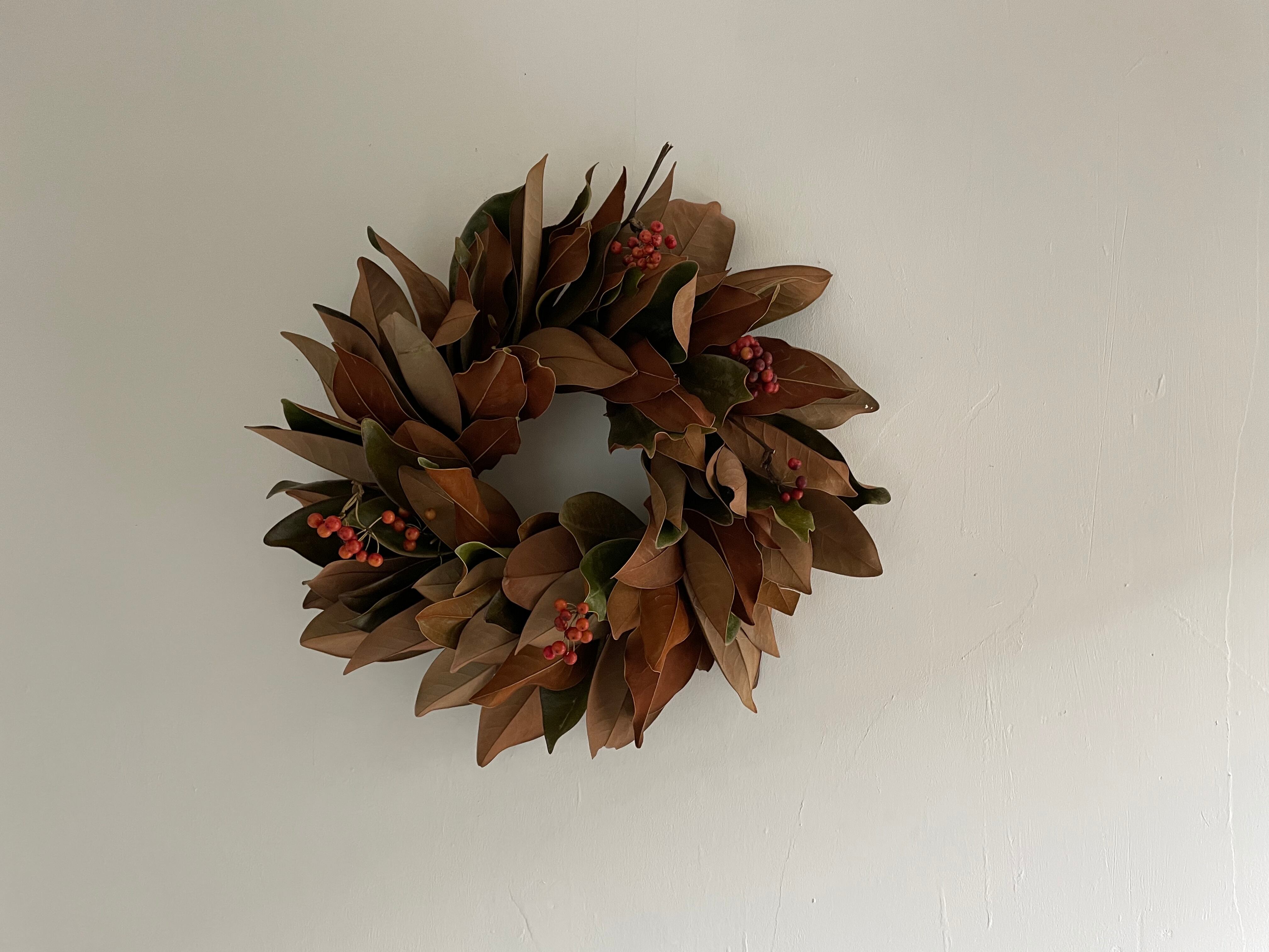 国産マグノリア、輸入マグノリアに山帰来をあわせてインテリアにも合わせやすいリースを作りました。
