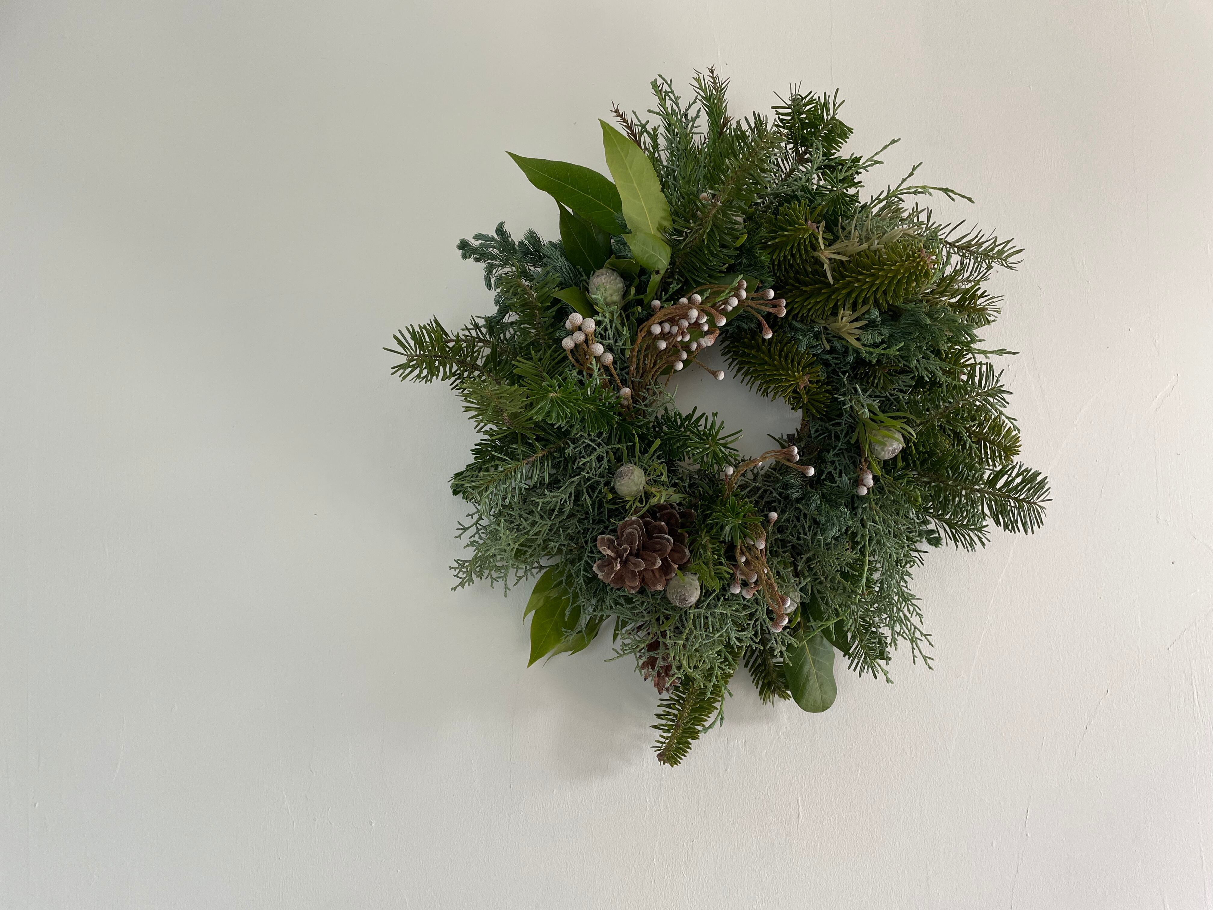 数種類の針葉樹にモミ、ブルニアやリューカデンドロなどをあわせてインテリアにも合わせやすいリースを作りました。
