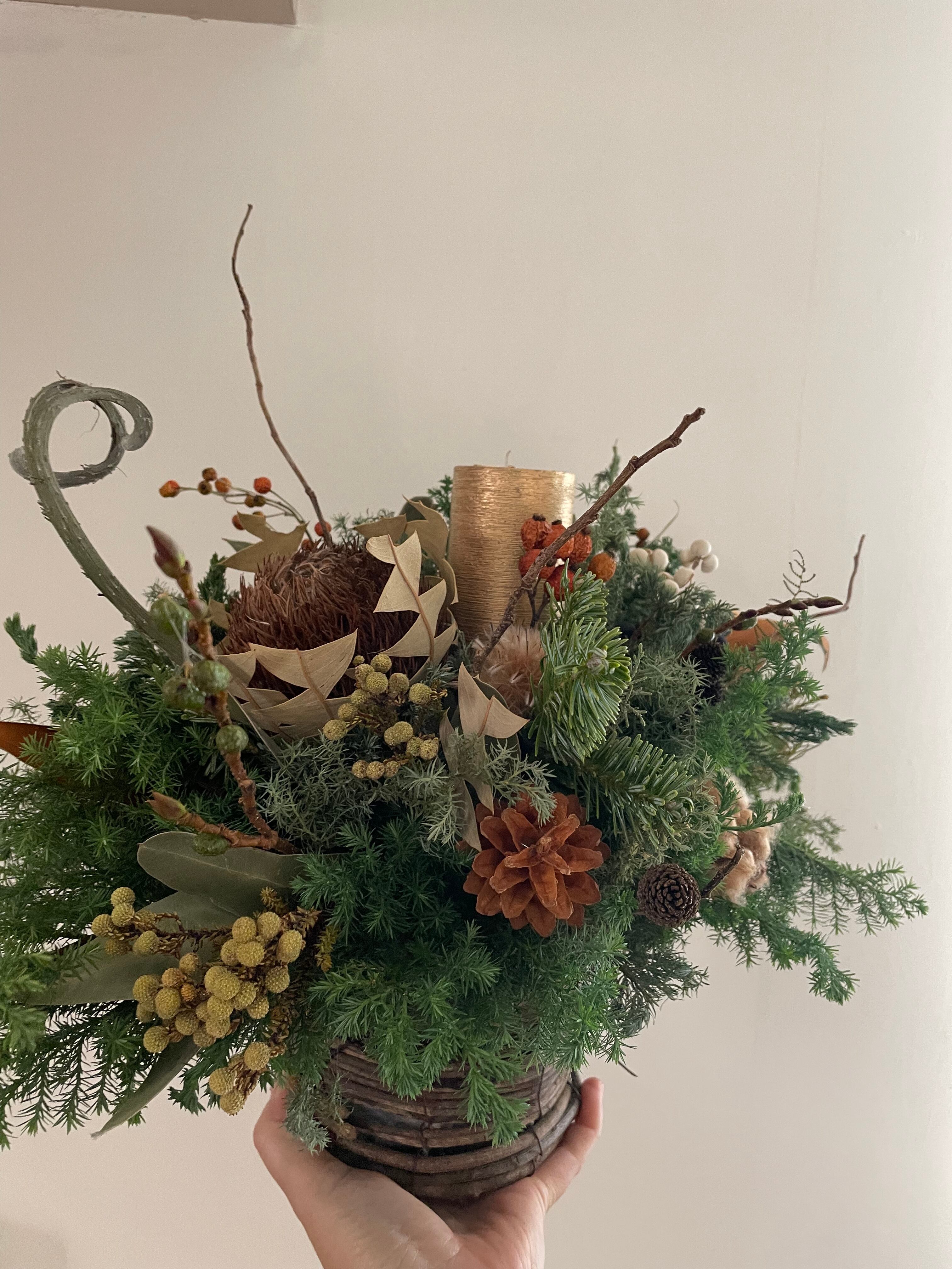 ゴールドキャンドルにバンクシアや針葉樹、コットンに木の実、草花などをいれて大人色のキャンドルアレンジメントをつくりました。