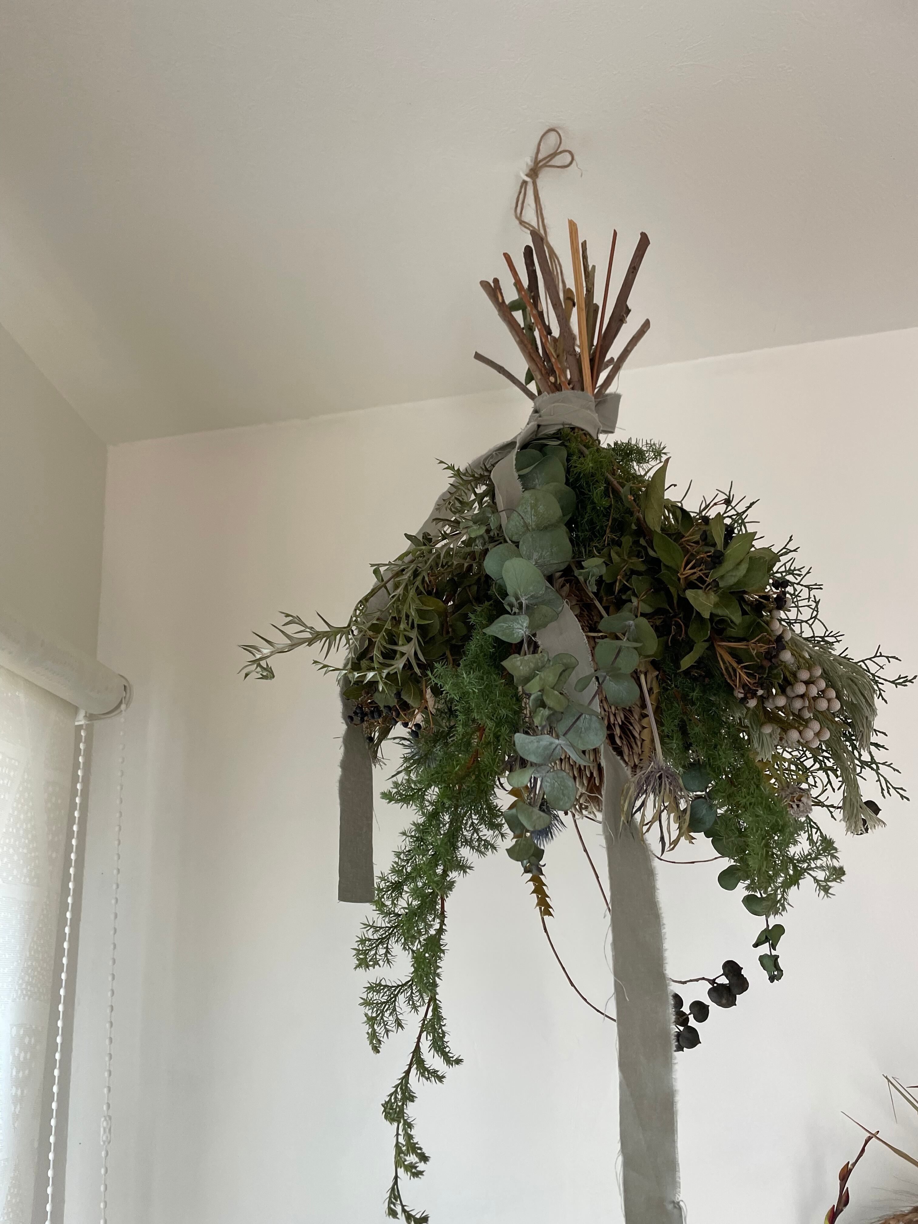 バンクシアにナンキンハゼ、エリンジュームやブルニア、香りが良い針葉樹を合わせて吊り下げられるブーケを作りました。