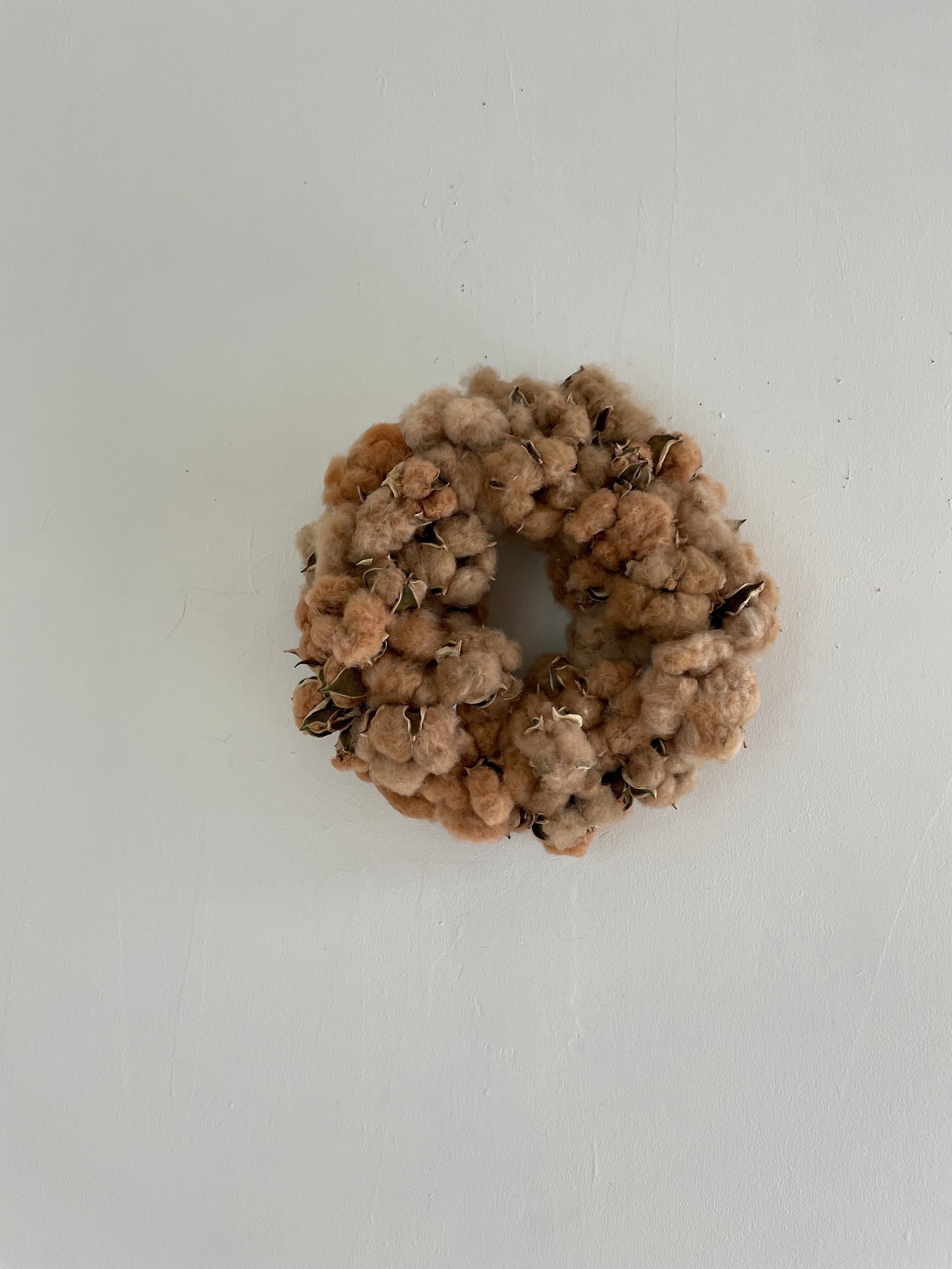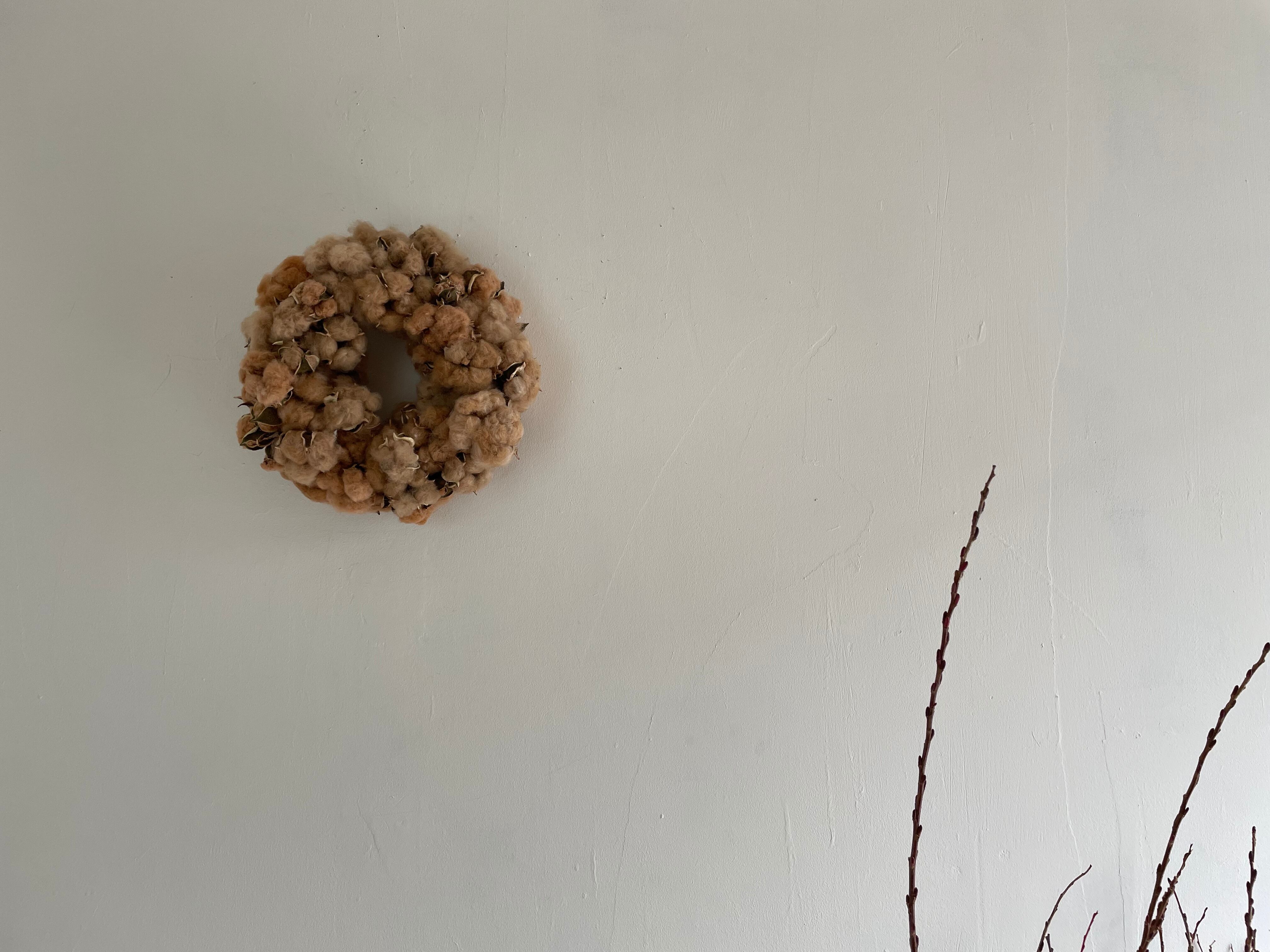 国産コットンをたっぷりいれた、ふわもこリースを作りました。