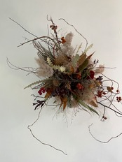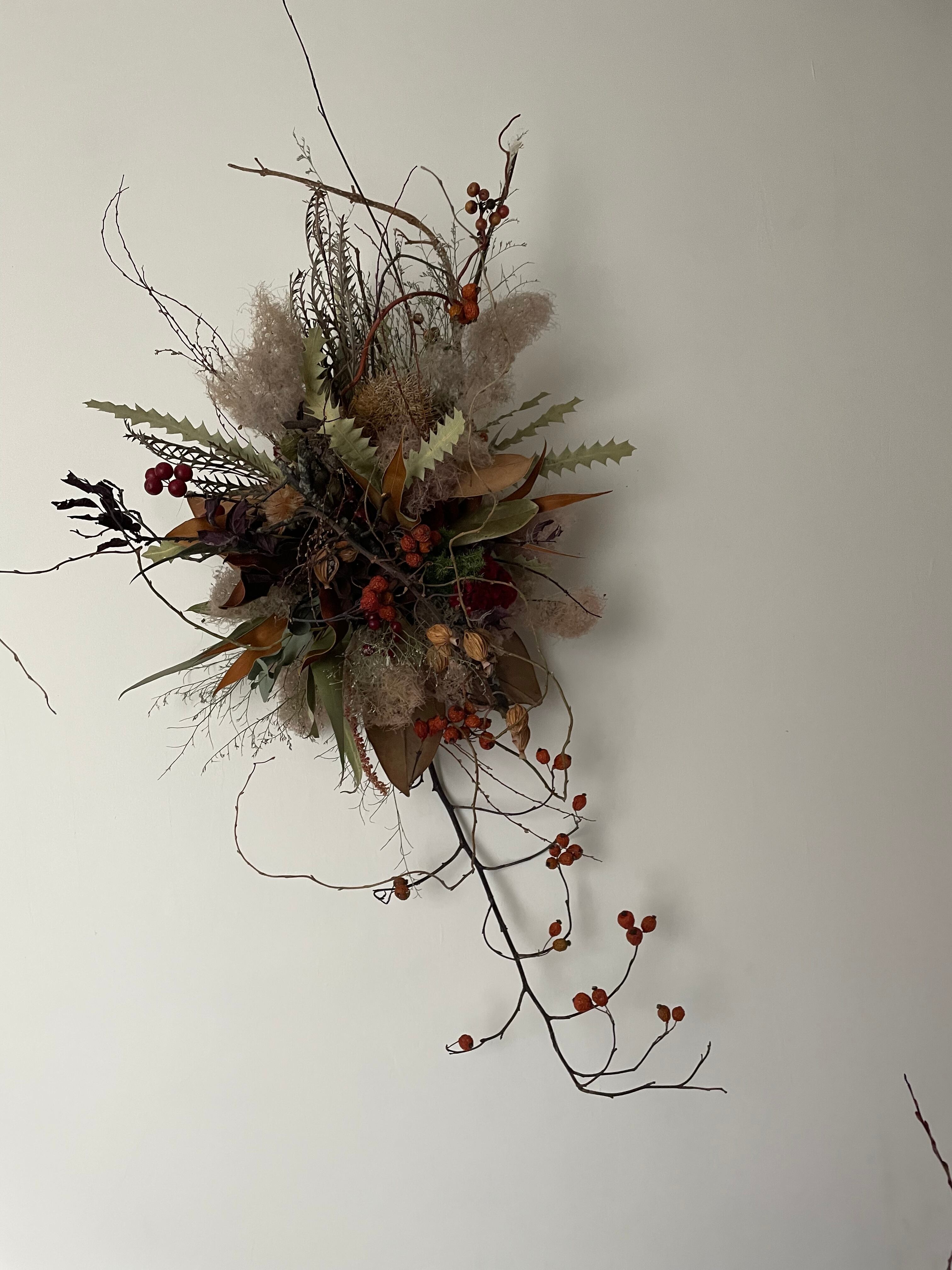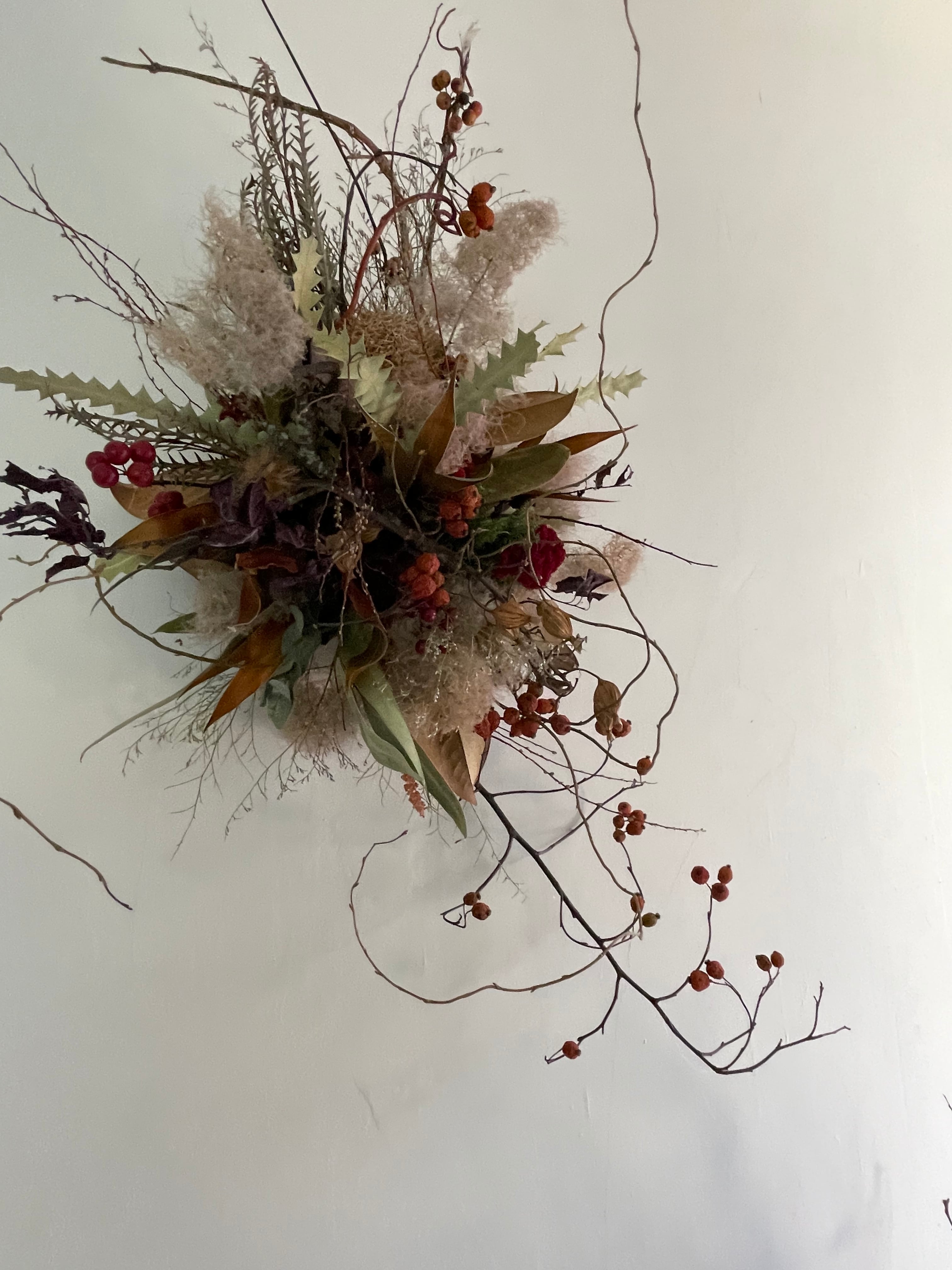 バンクシアやケイトウ、野バラ、グレビレアゴールド、パンパスグラスなどをいれ壁掛けオブジェにしました。