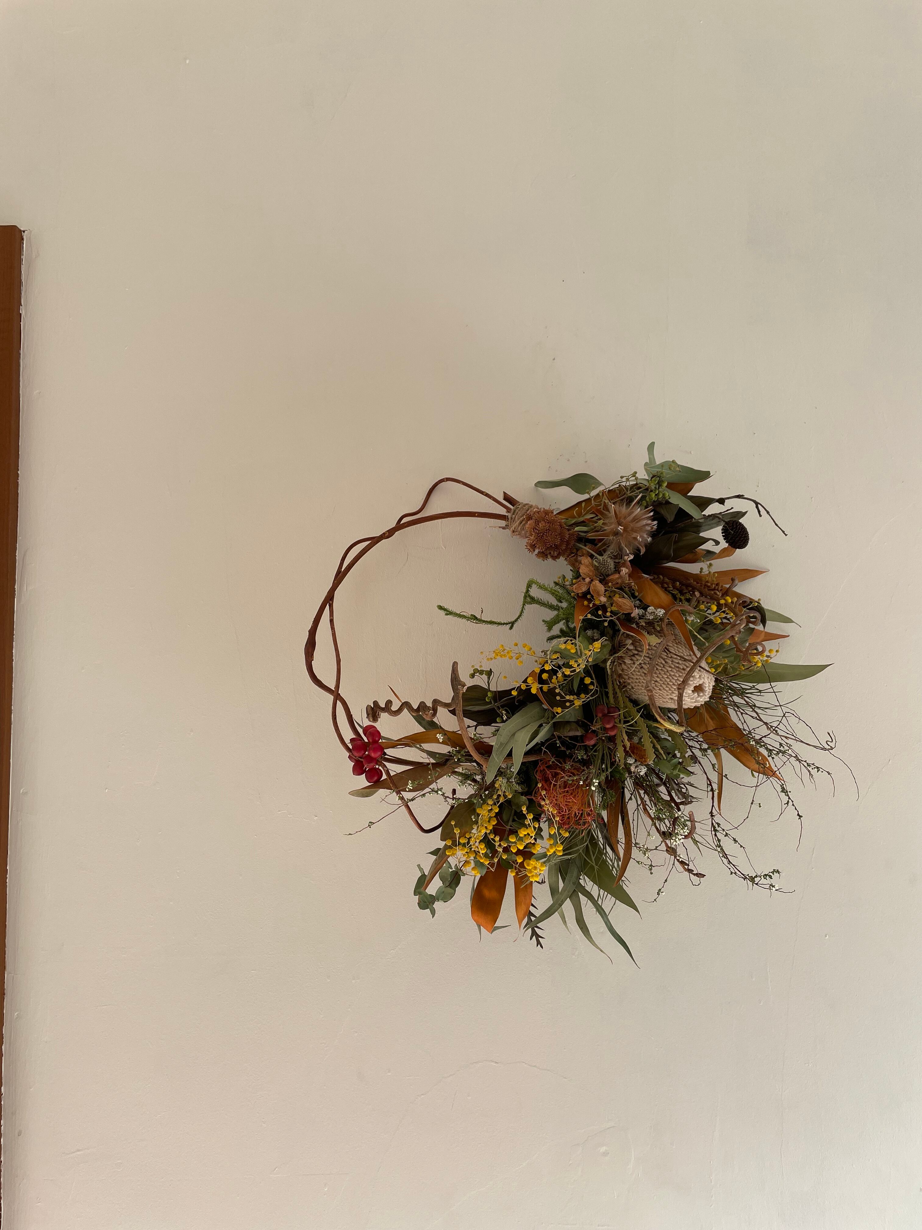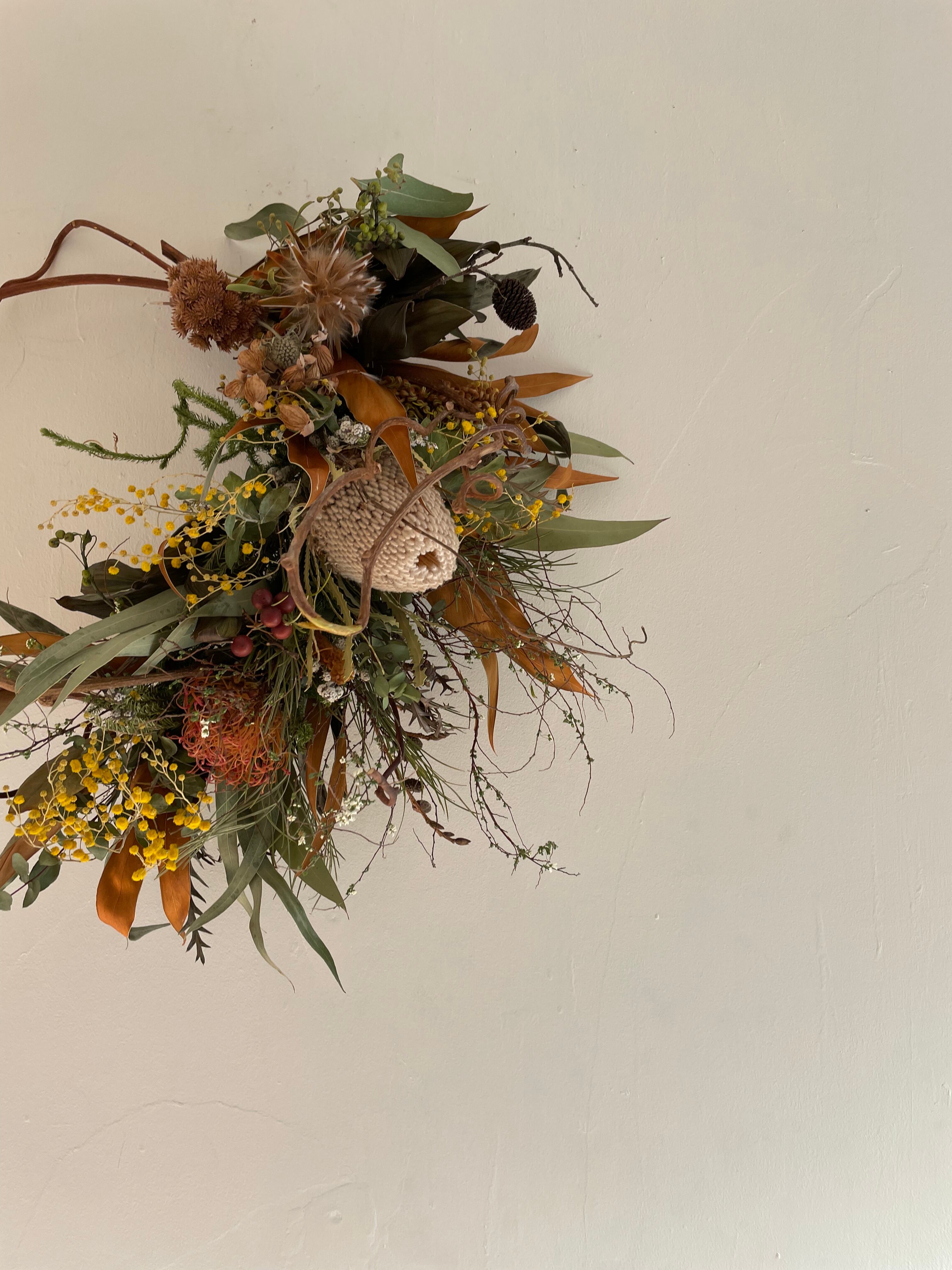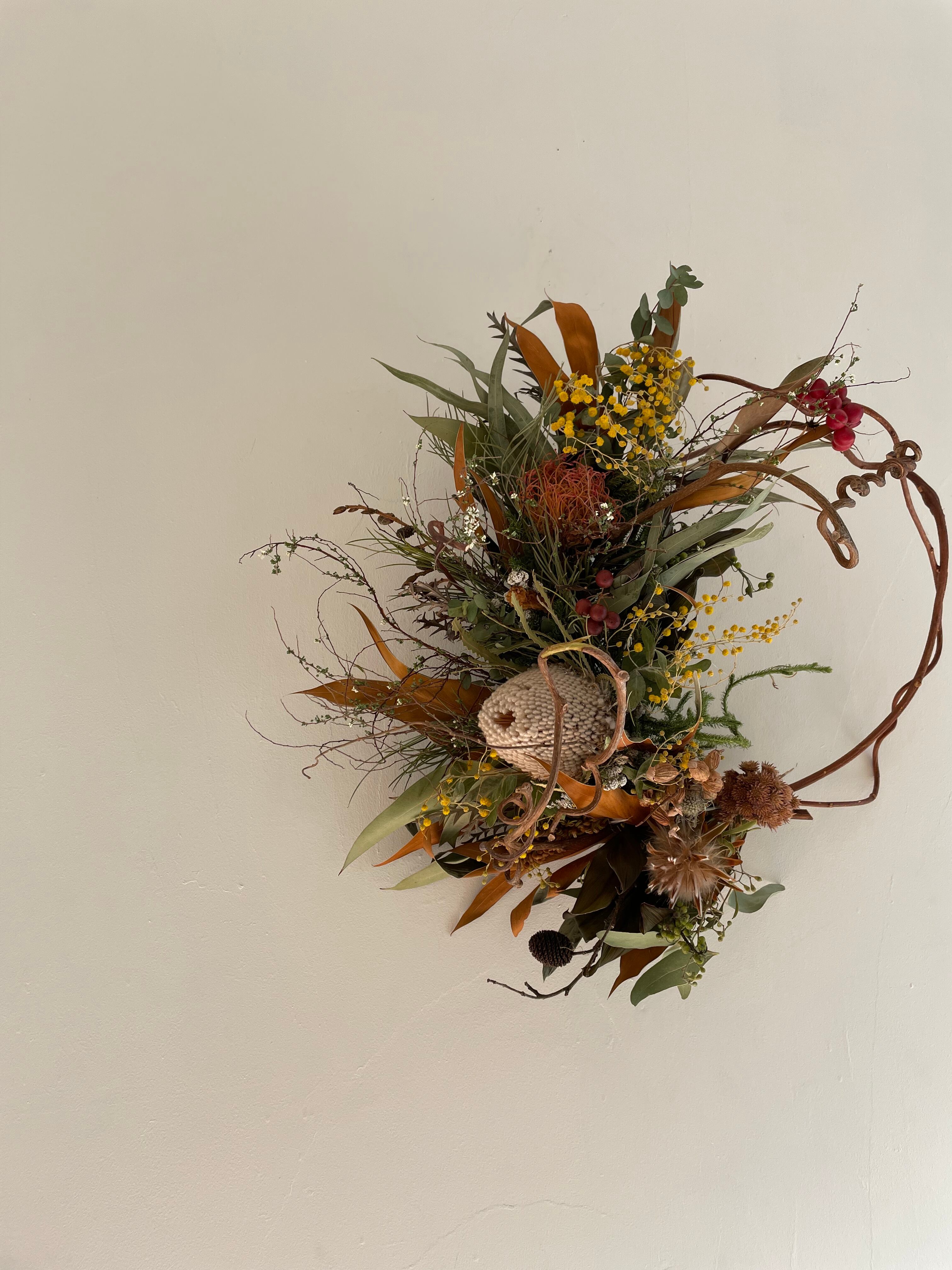 バンクシアにピンクッション、ちょっぴりパールアカシアをいれて入れハーフリースを作りました。