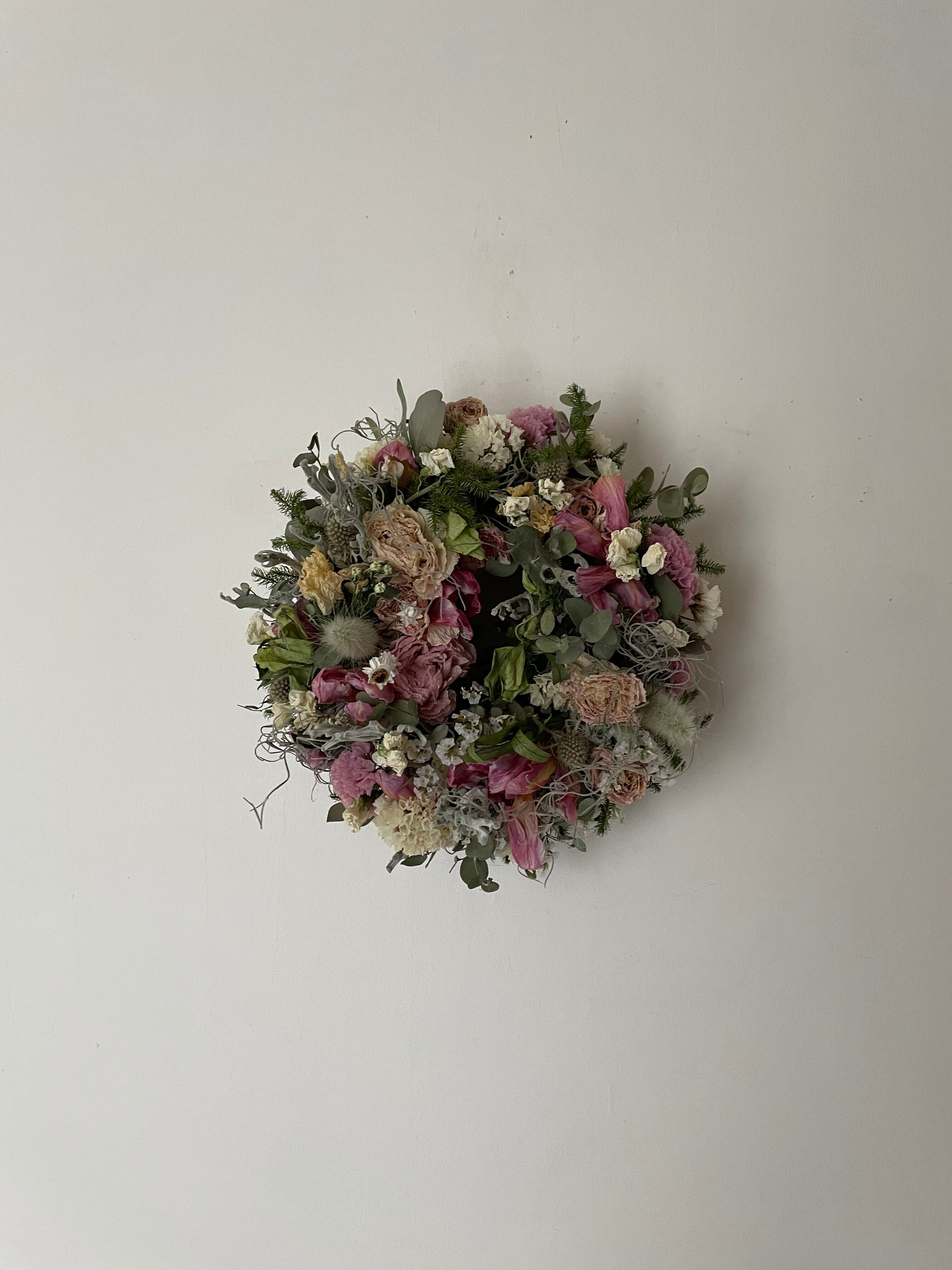 ラナンキュラスに八重のチューリップ、ラナンキュラスや小花を入れてラウンドリースを作りました。