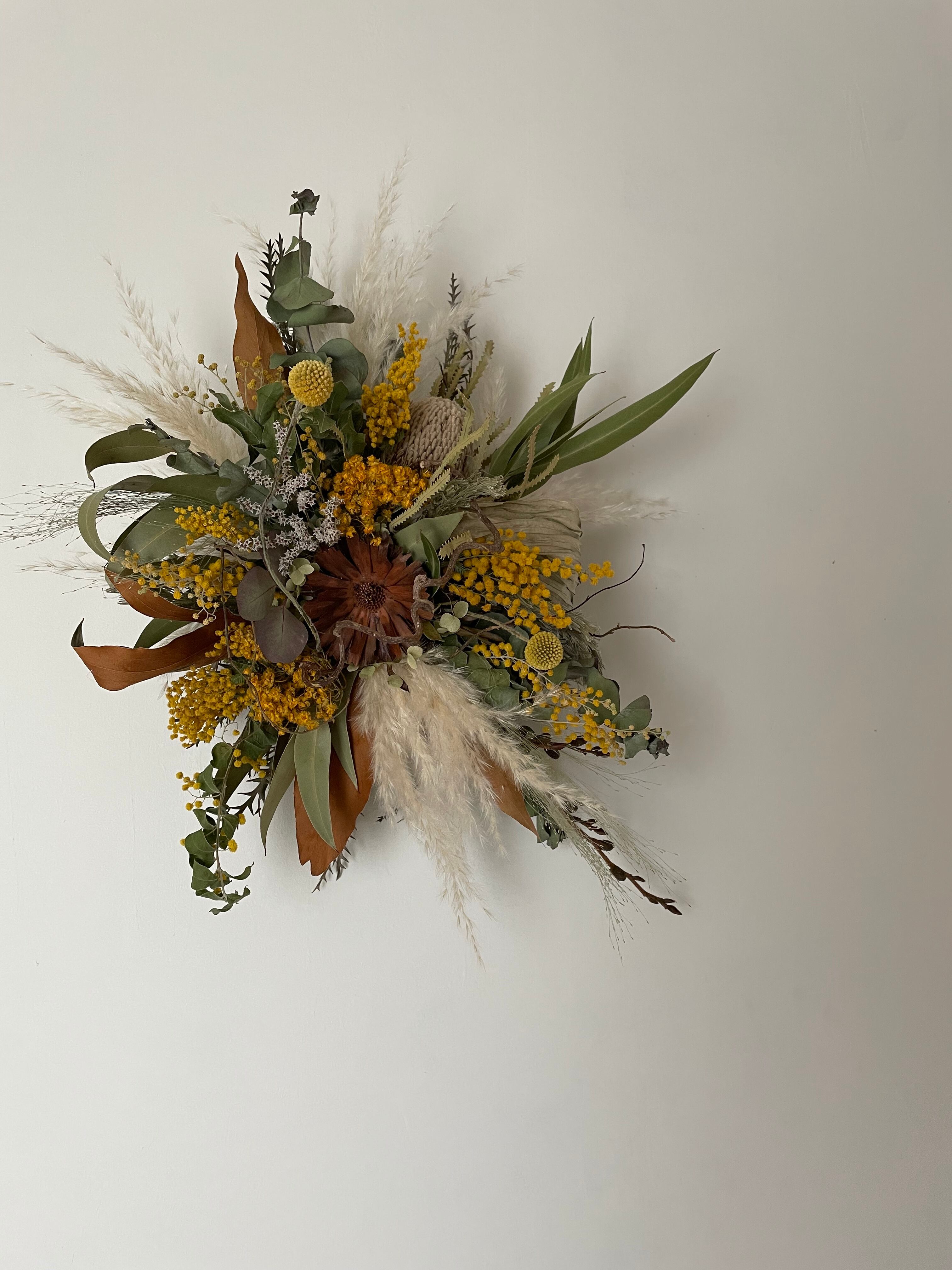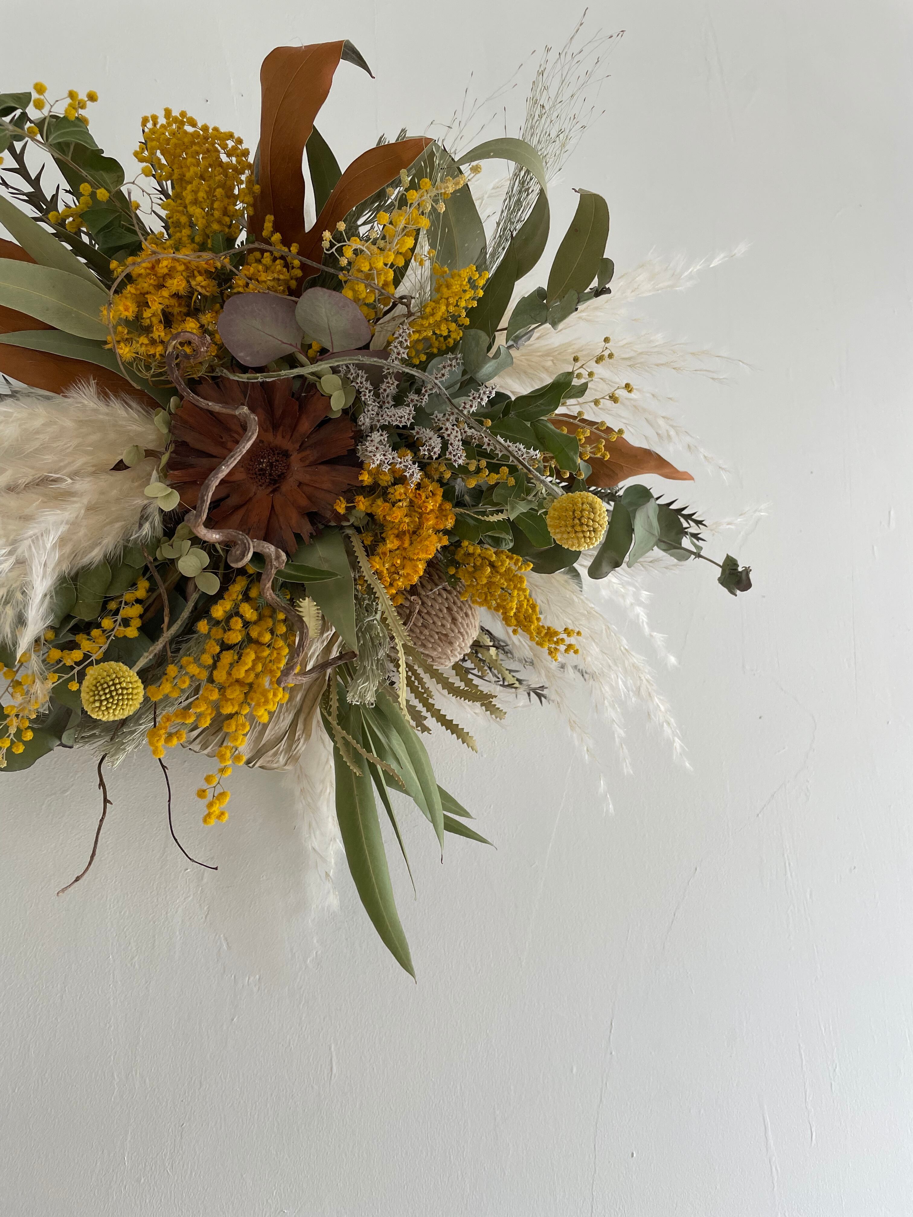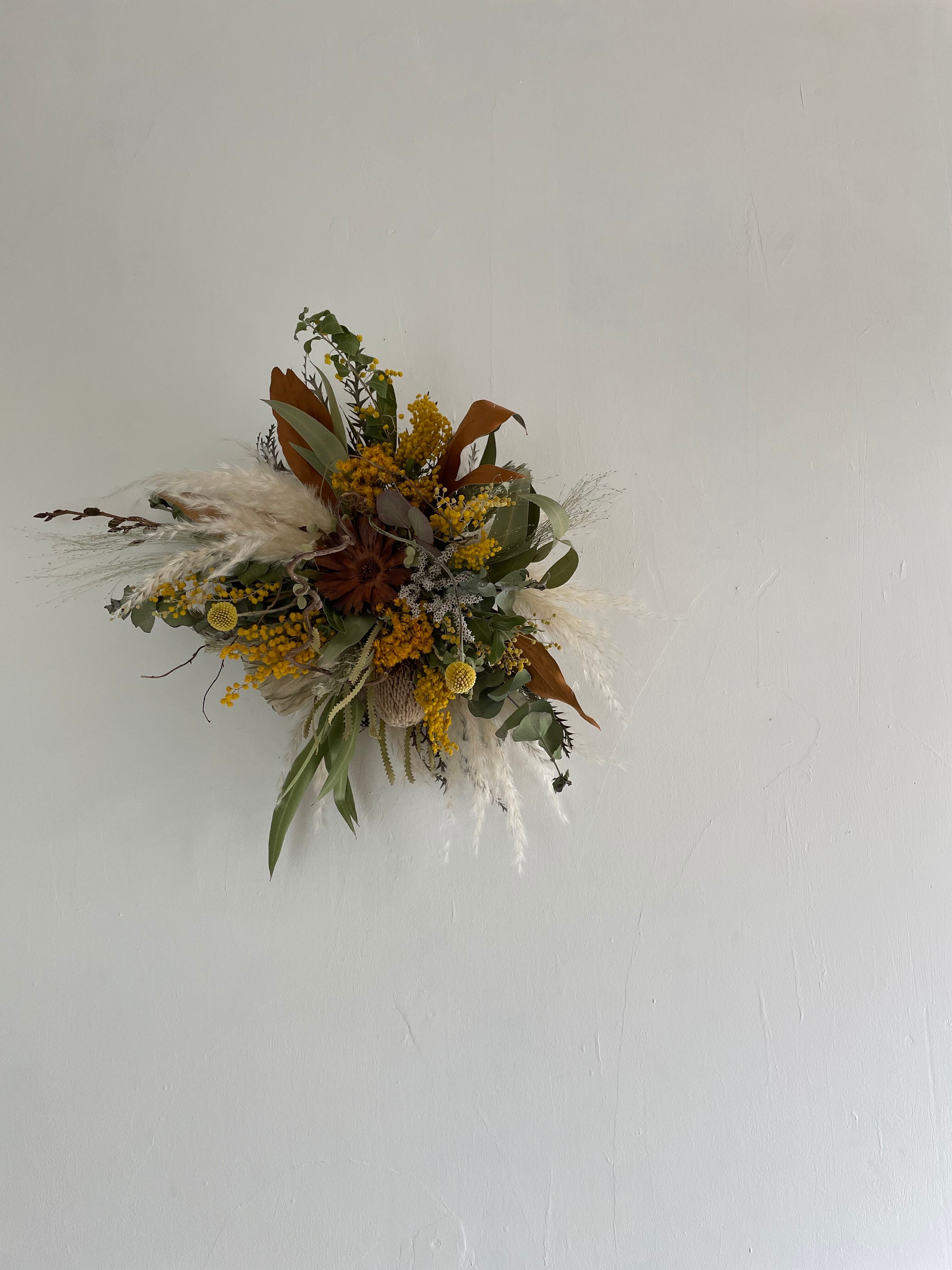 バンクシアにパールアカシア、銀葉アカシアにグレビレアゴールド、パンパスグラスなどをいれ壁掛けオブジェにしました。