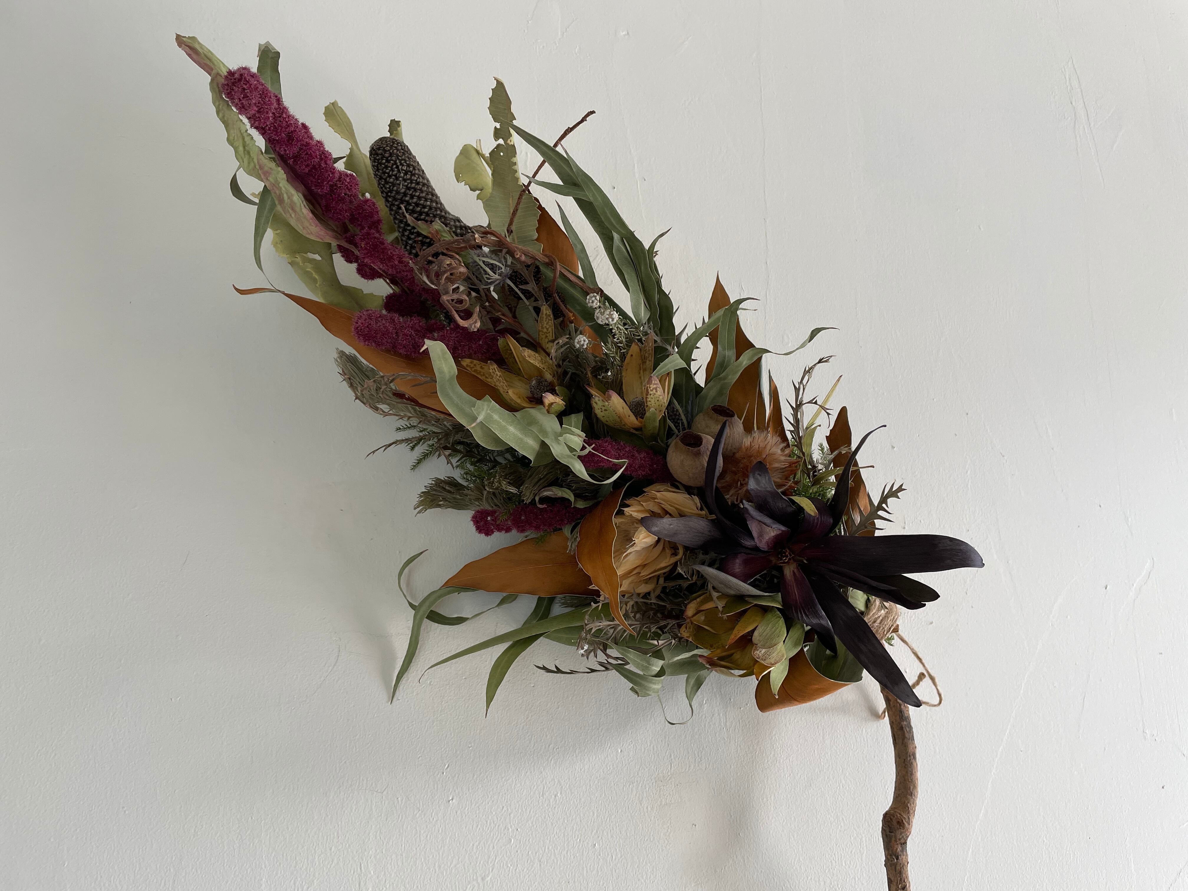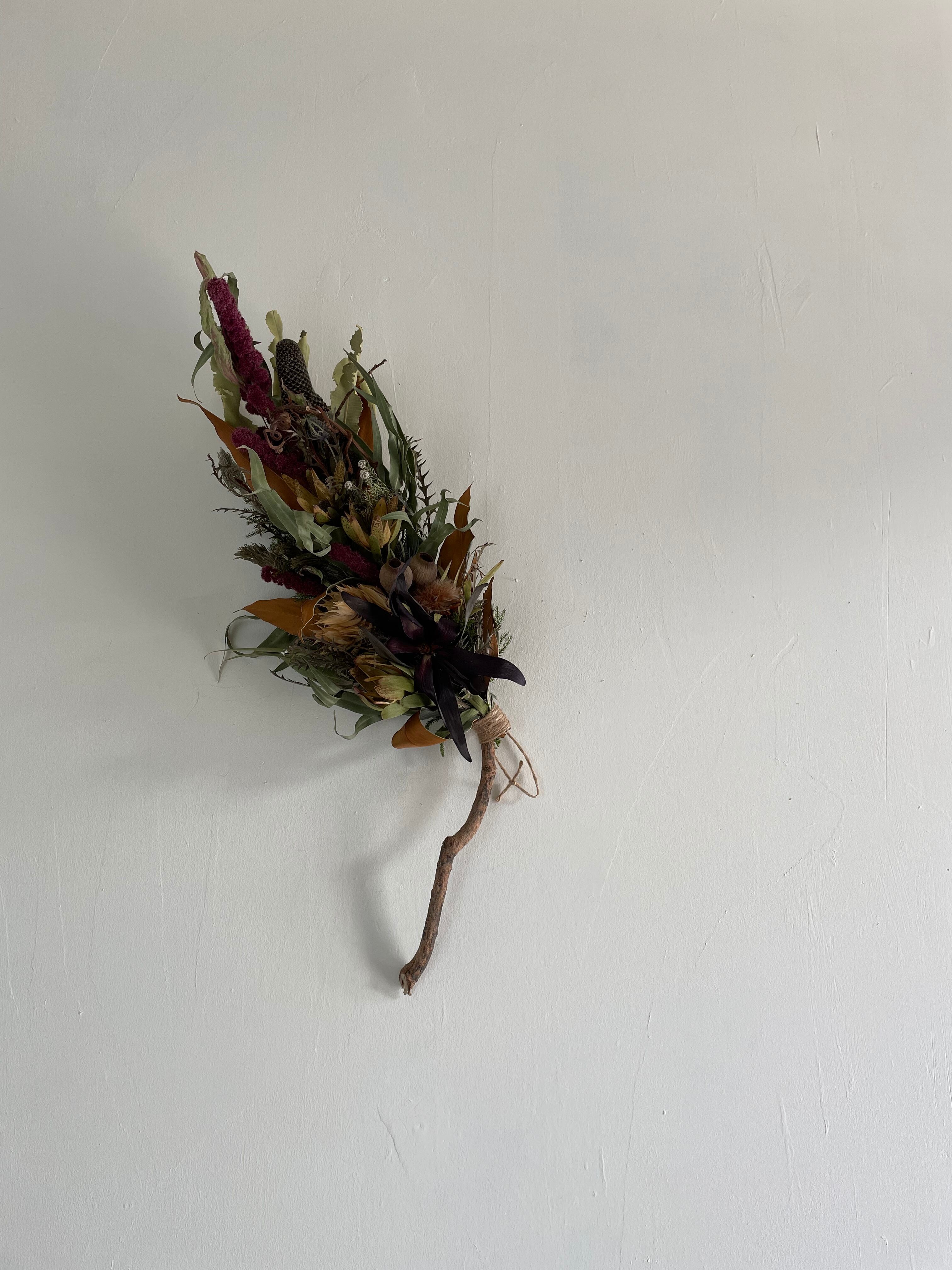 バンクシアコーンにリューカデンドロ、セルリアなどをいれ縦長スワッグにしました。