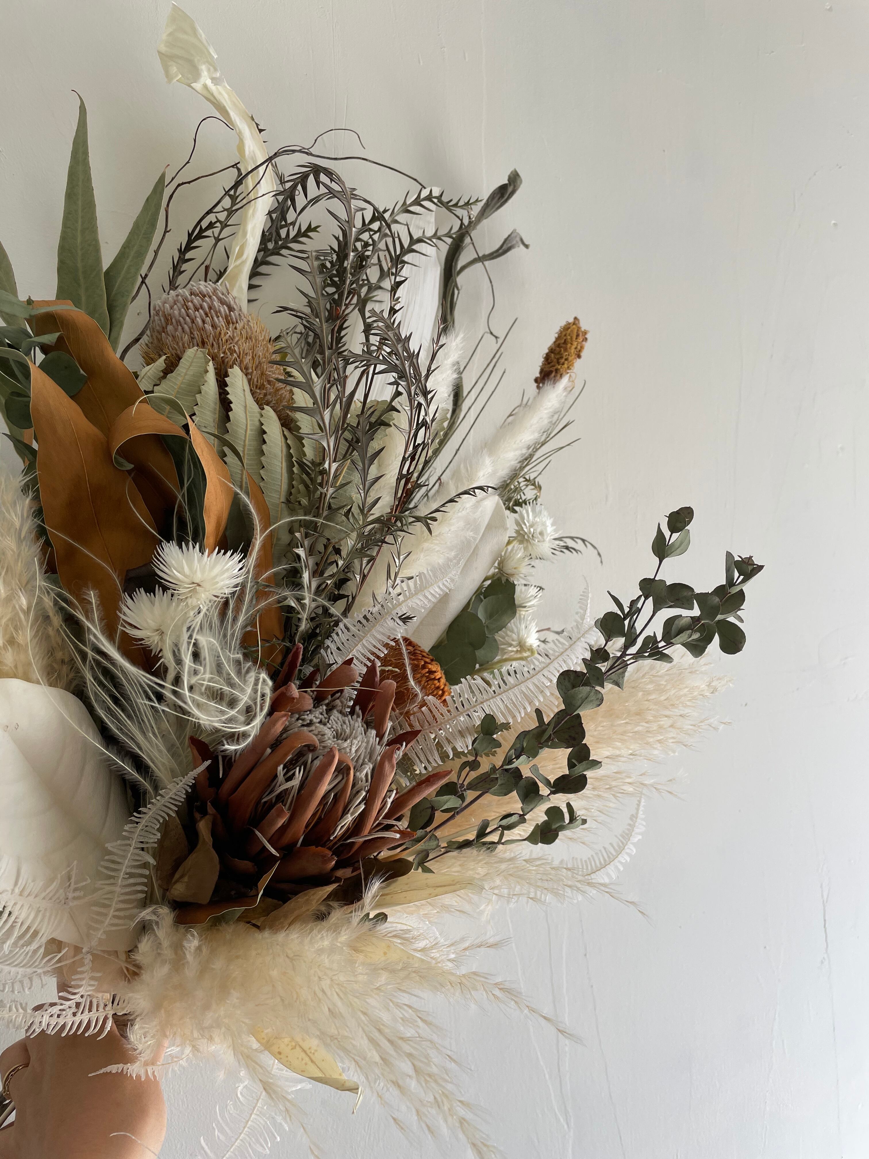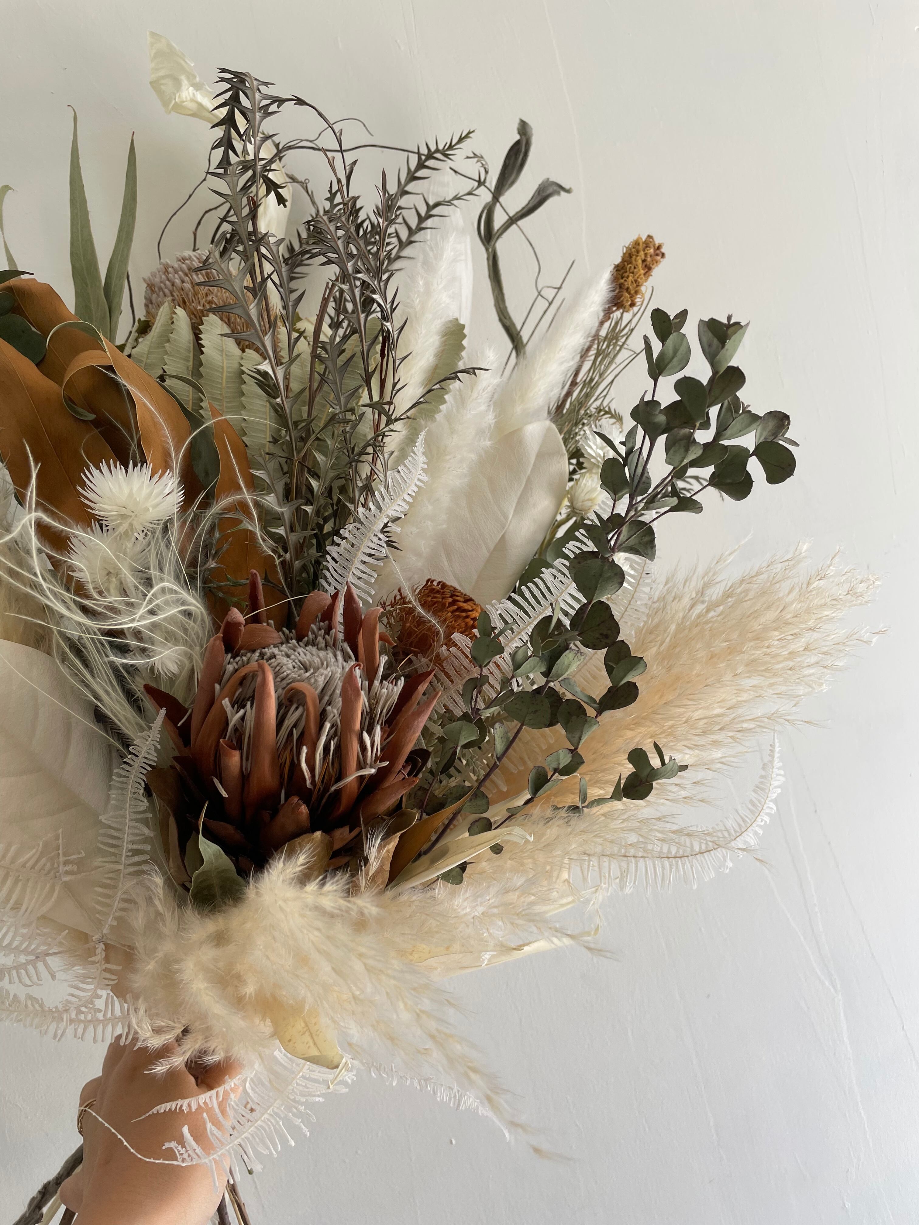 バンクシアにプロテア、ユーカリ、パンパスグラスやテールリードを合わせてスワッグを作りました。