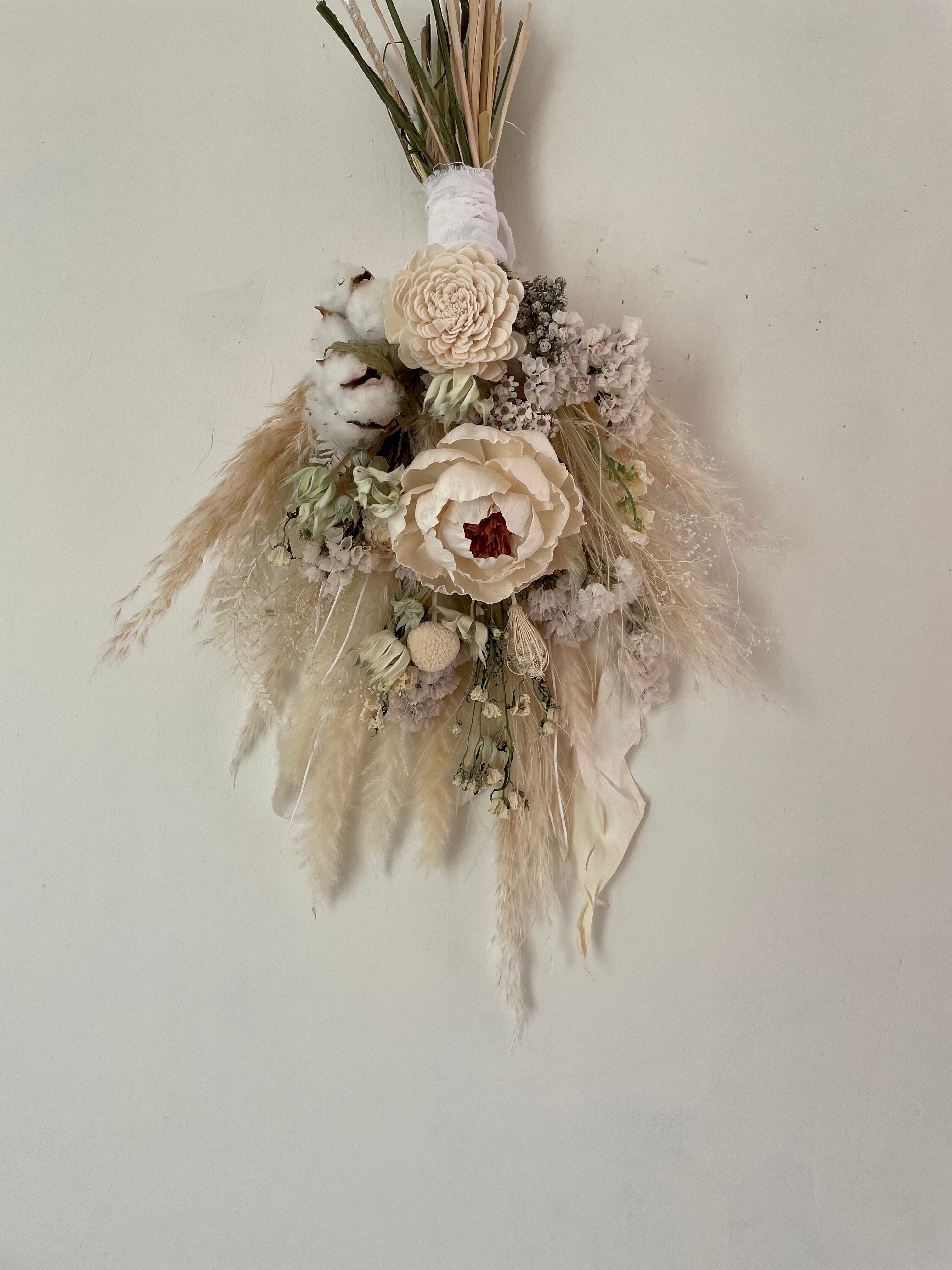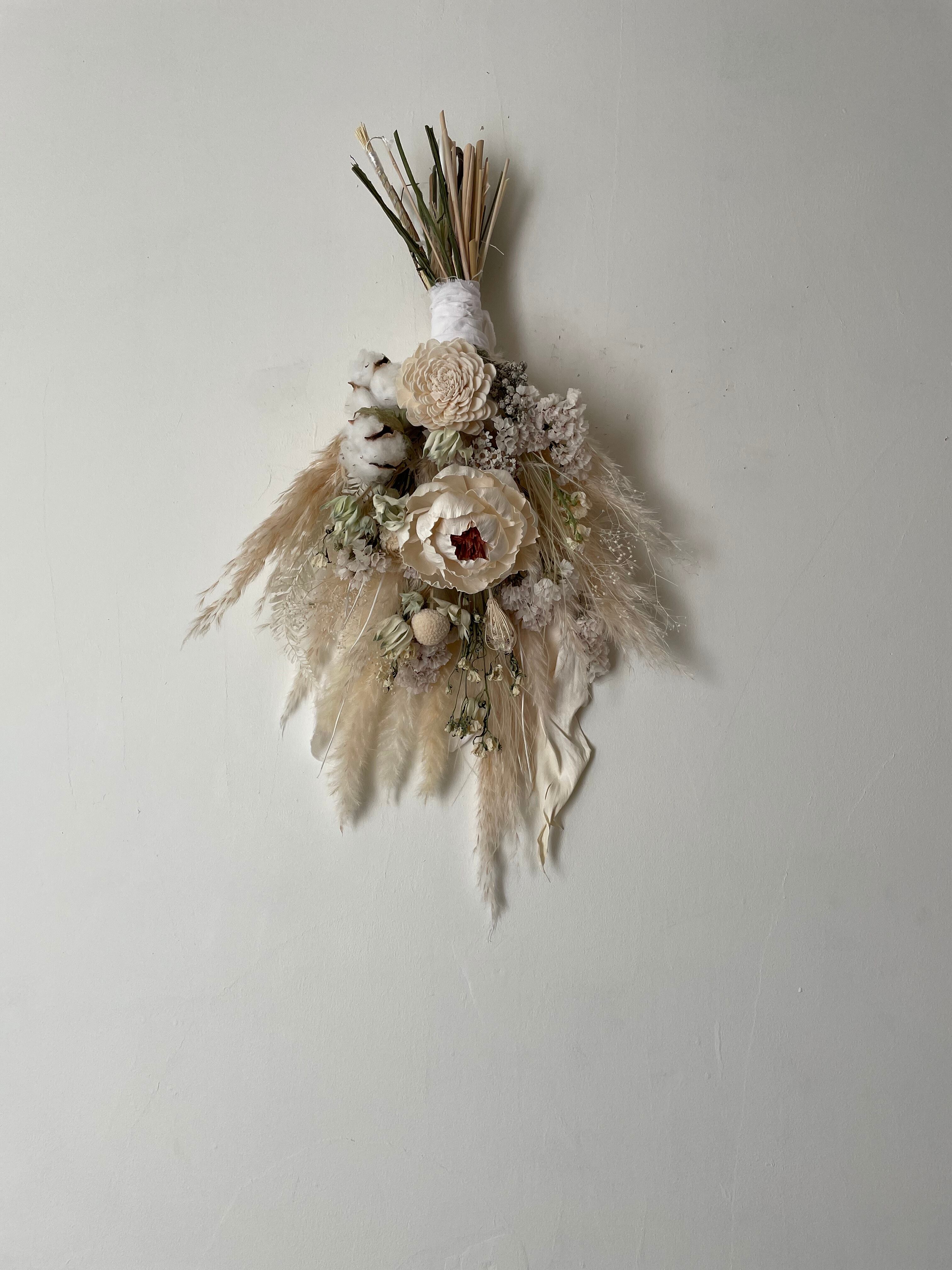 芍薬にパンパスグラス、可愛らしいオーストラリアンデージーにフランネルフラワーやプリザーブドフラワー、春の草花を合わせてスワッグを作りました^ ^