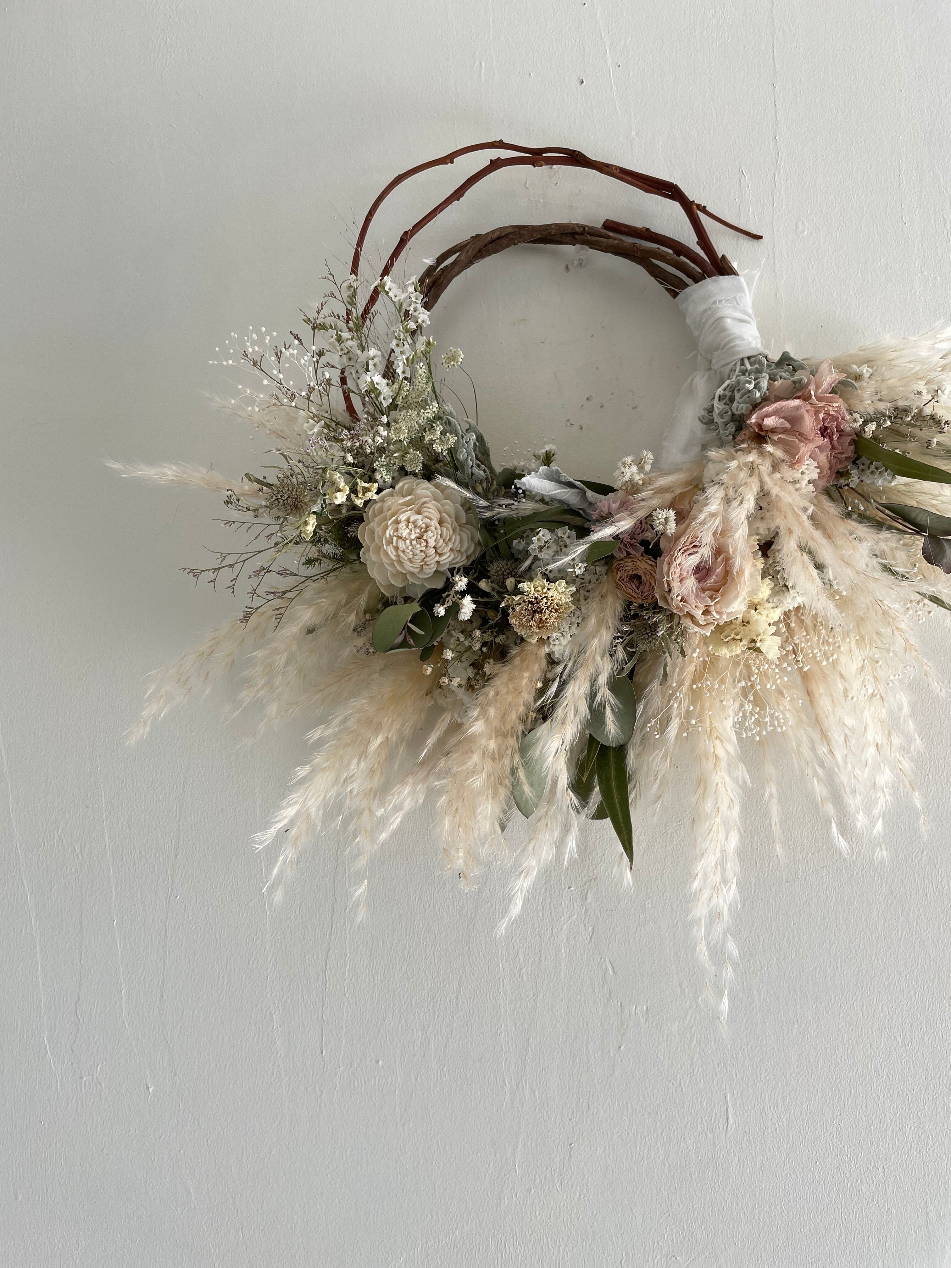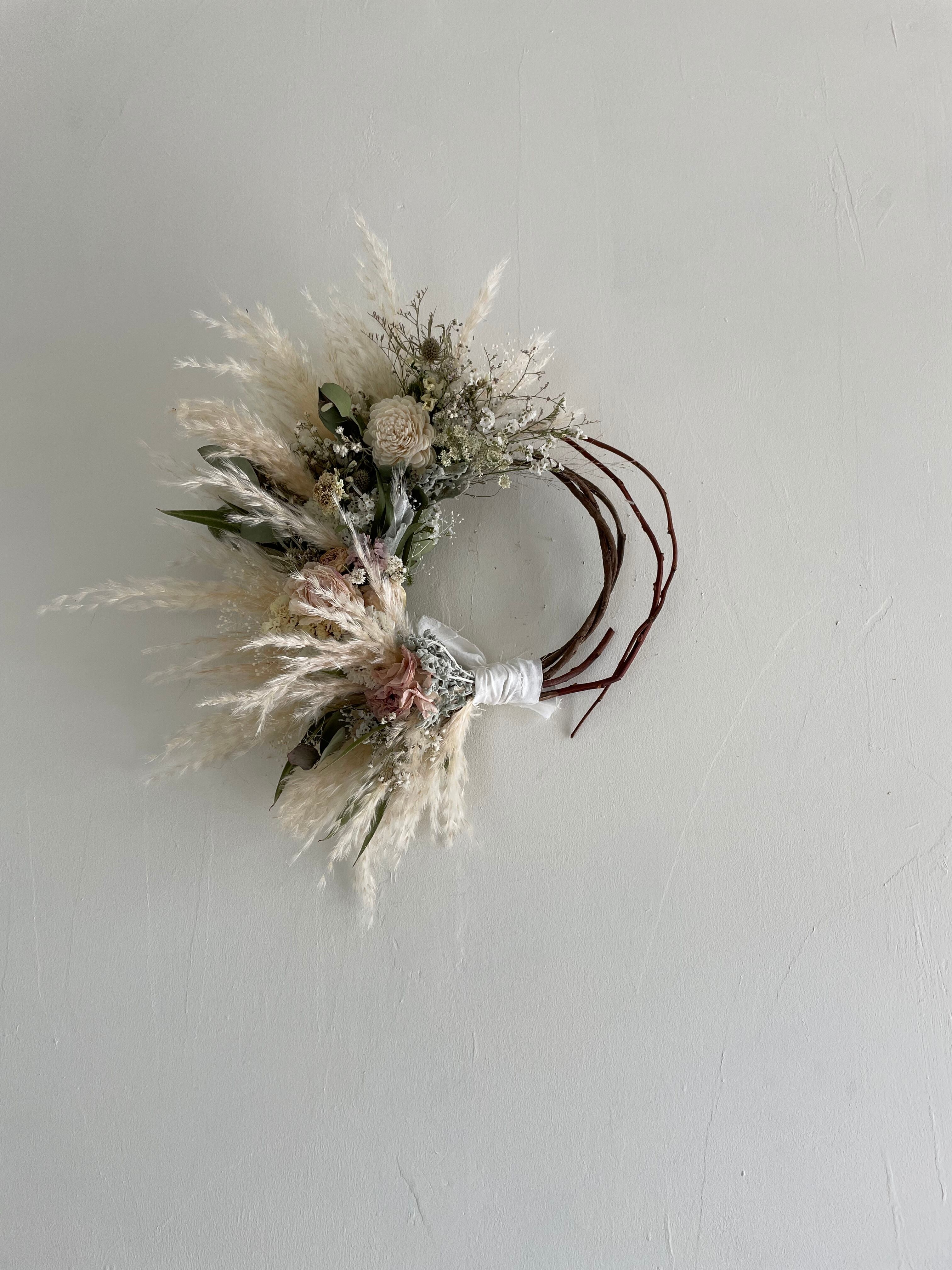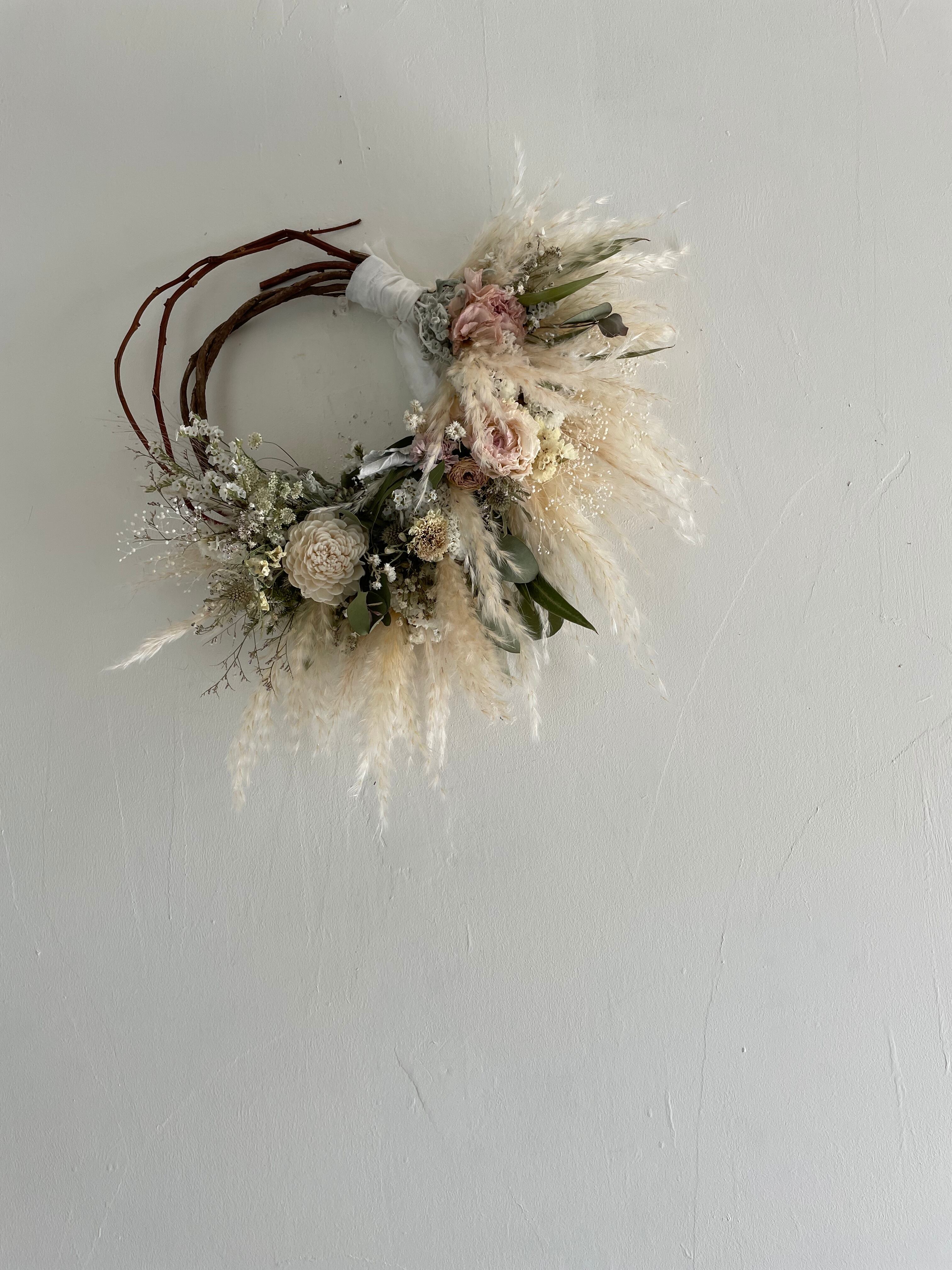 パンパスグラスにラナンキュラスや小花などを入れたハーフリースを作りました。