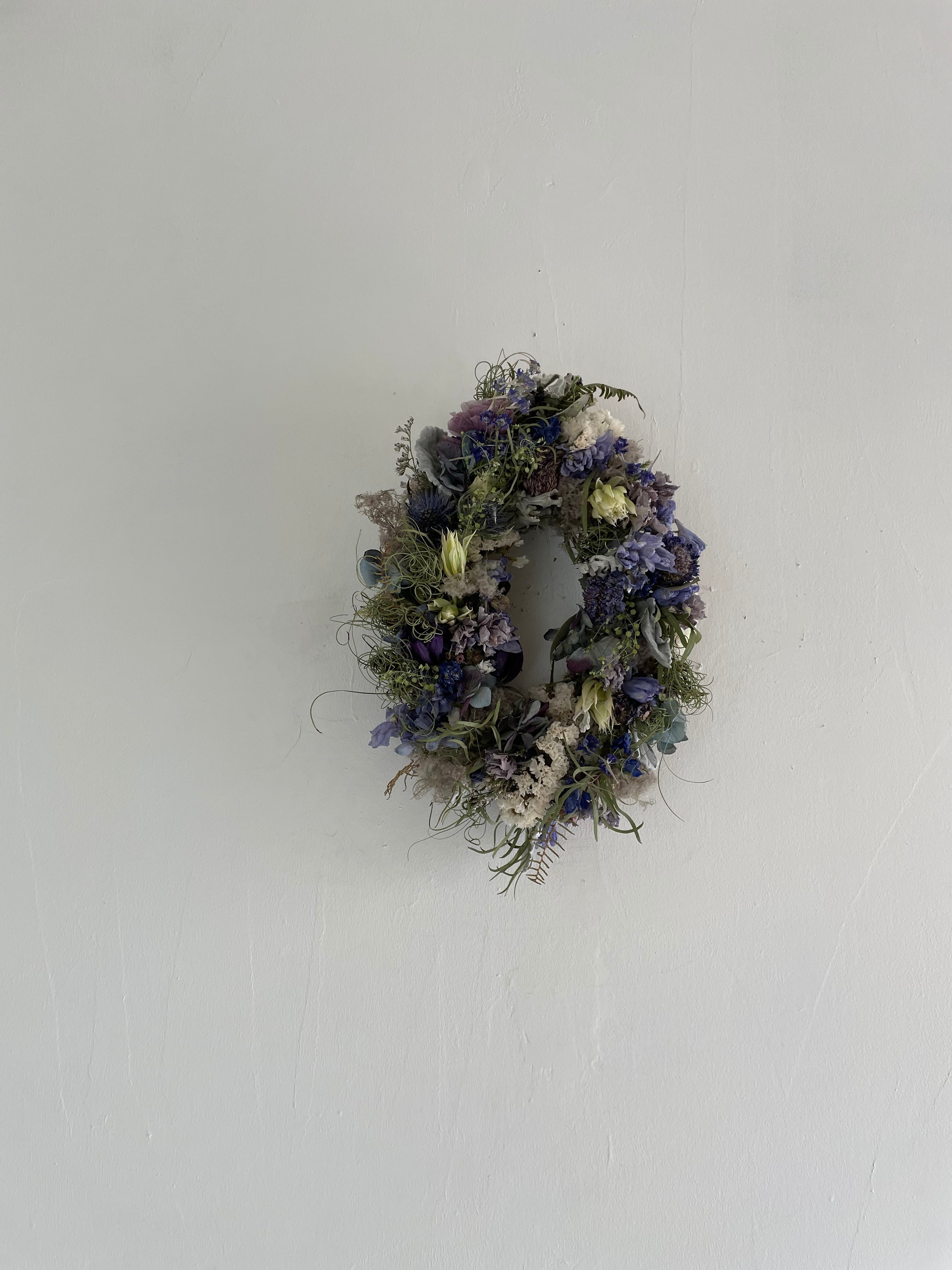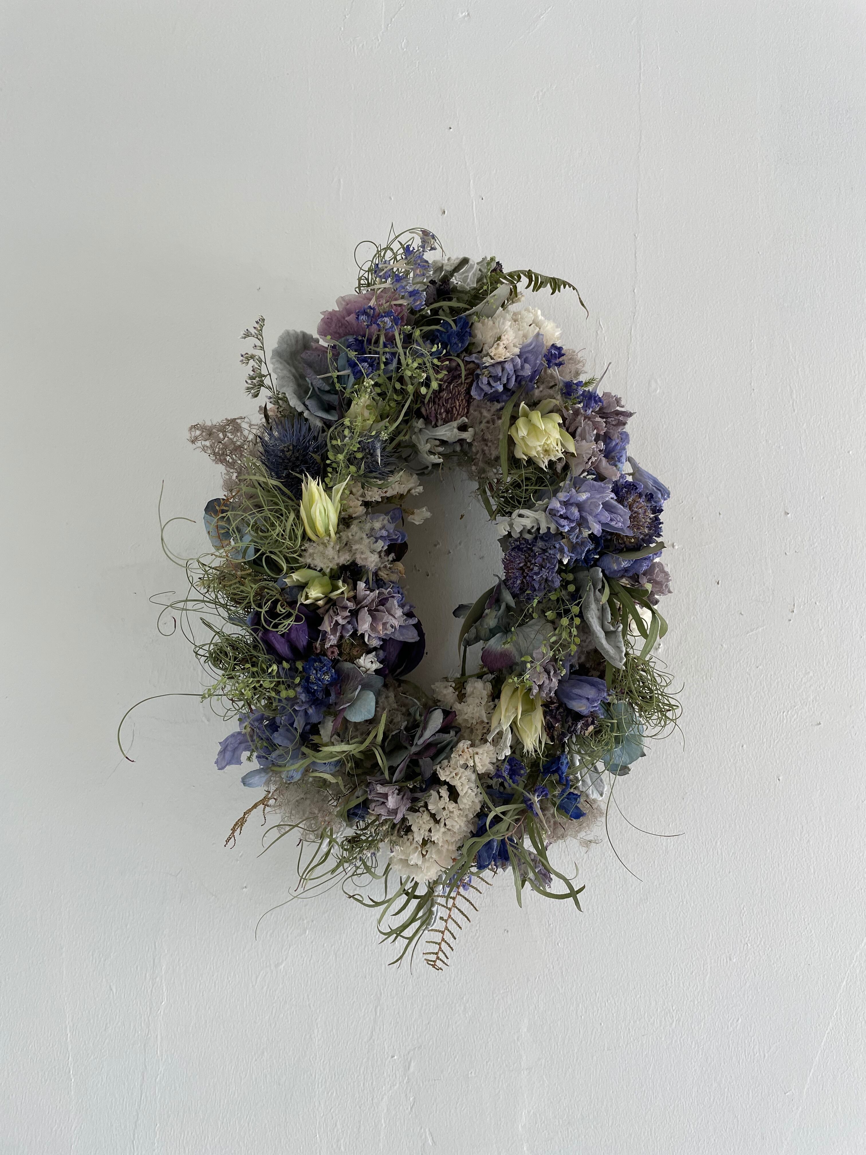 ふわふわスモークツリーやセルリア、スターチスやユーカリ、小花などを入れインテリアにも合わせやすいリースを作りました。