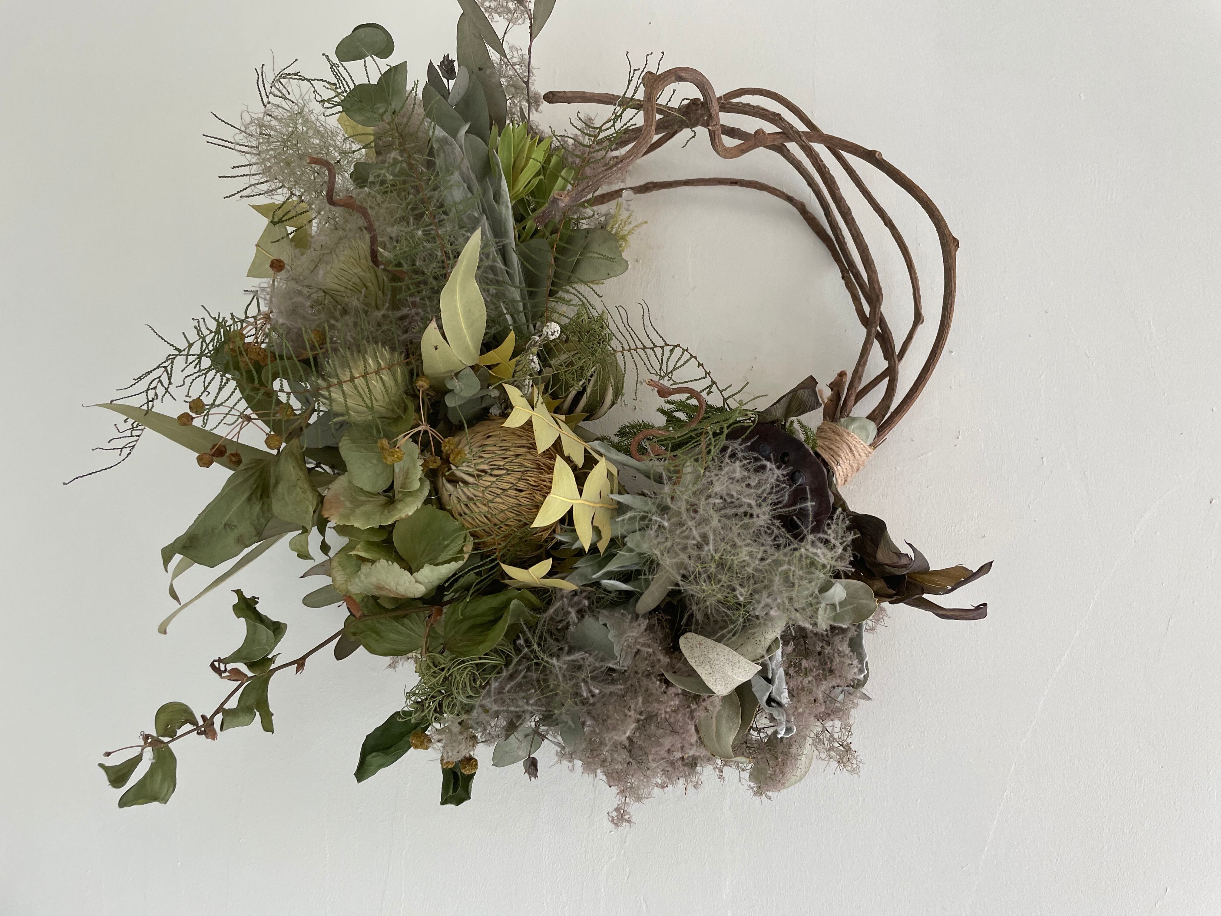バンクシアやスモークツリー、アンティーク紫陽花などを入れインテリアにも合わせやすいリースを作りました。